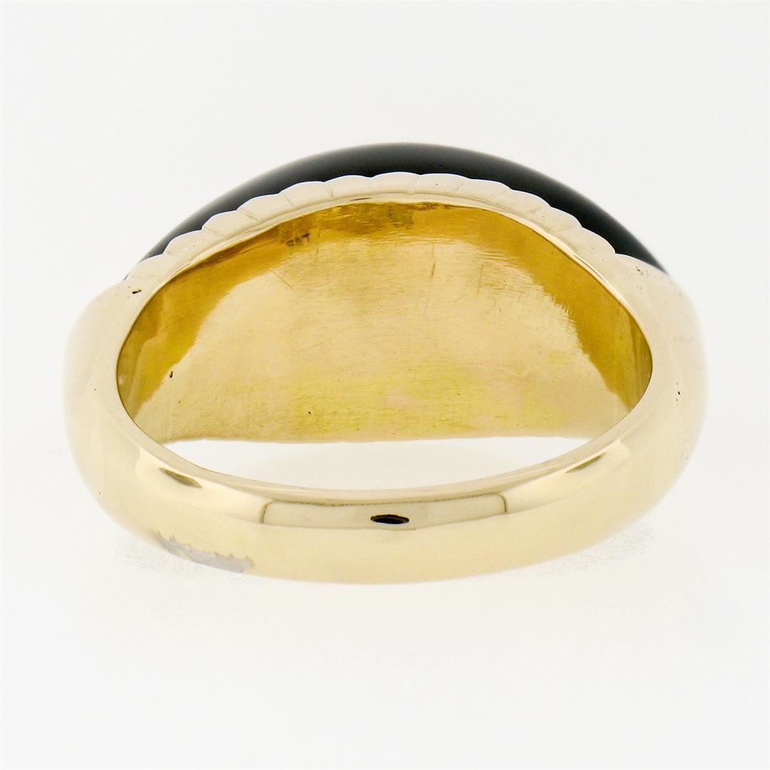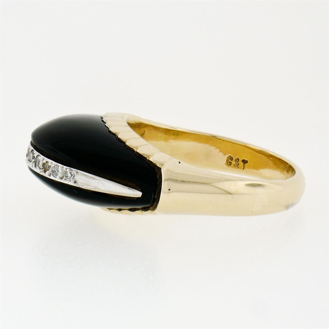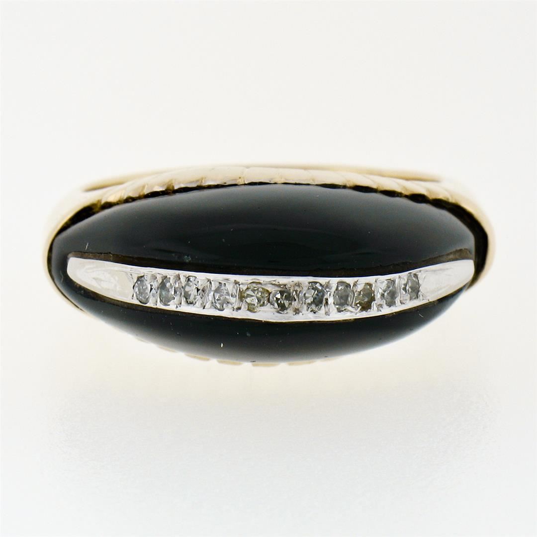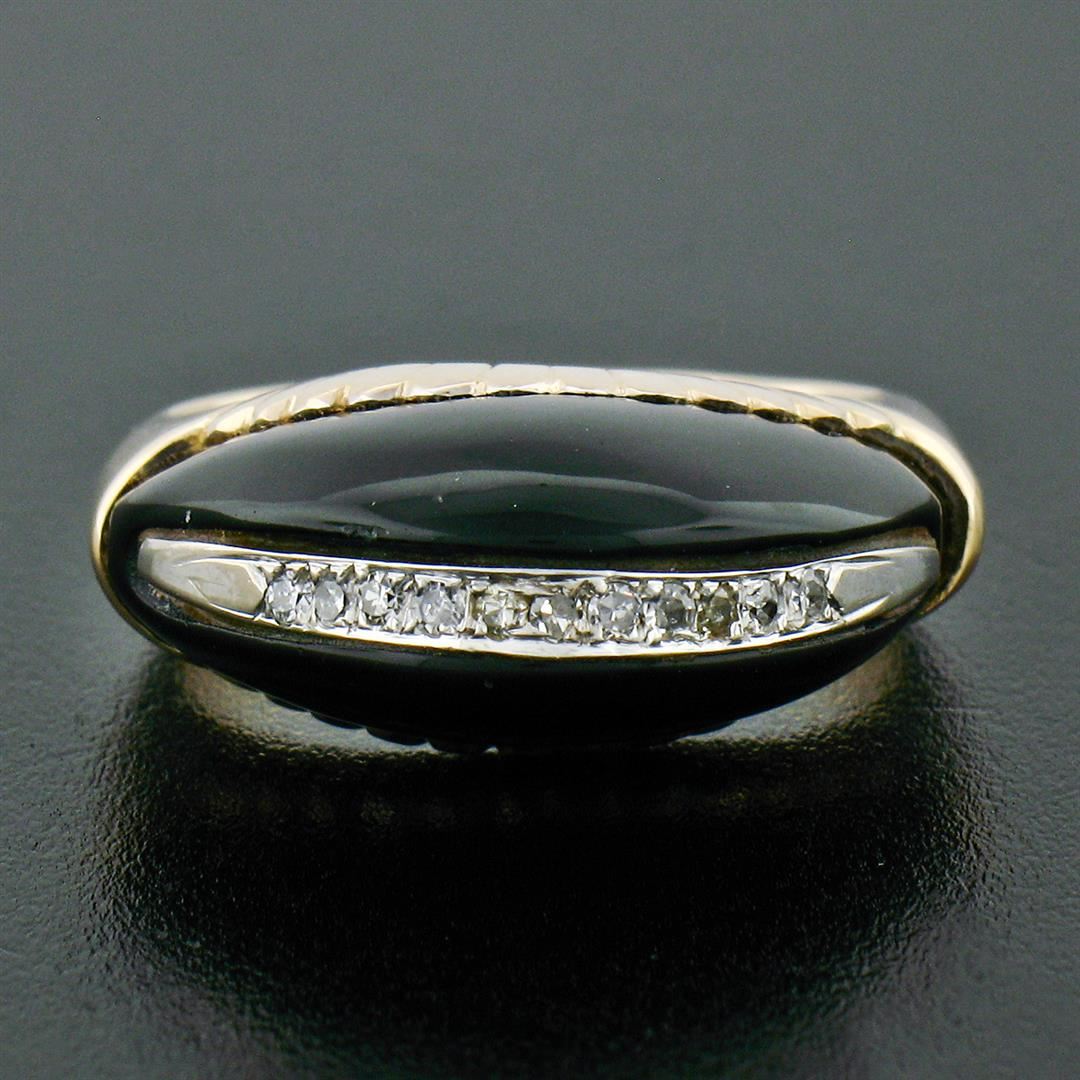 A vinatge solid 14k yellow gold ring, with 1 domed custom cut natural black onyx, and 11 old single cut natural diamonds (H/I - VS2 ; 0.13ctw). The ring is size 6.5, weighs a total of 6.42 grams, and measures 9.0mm wide.