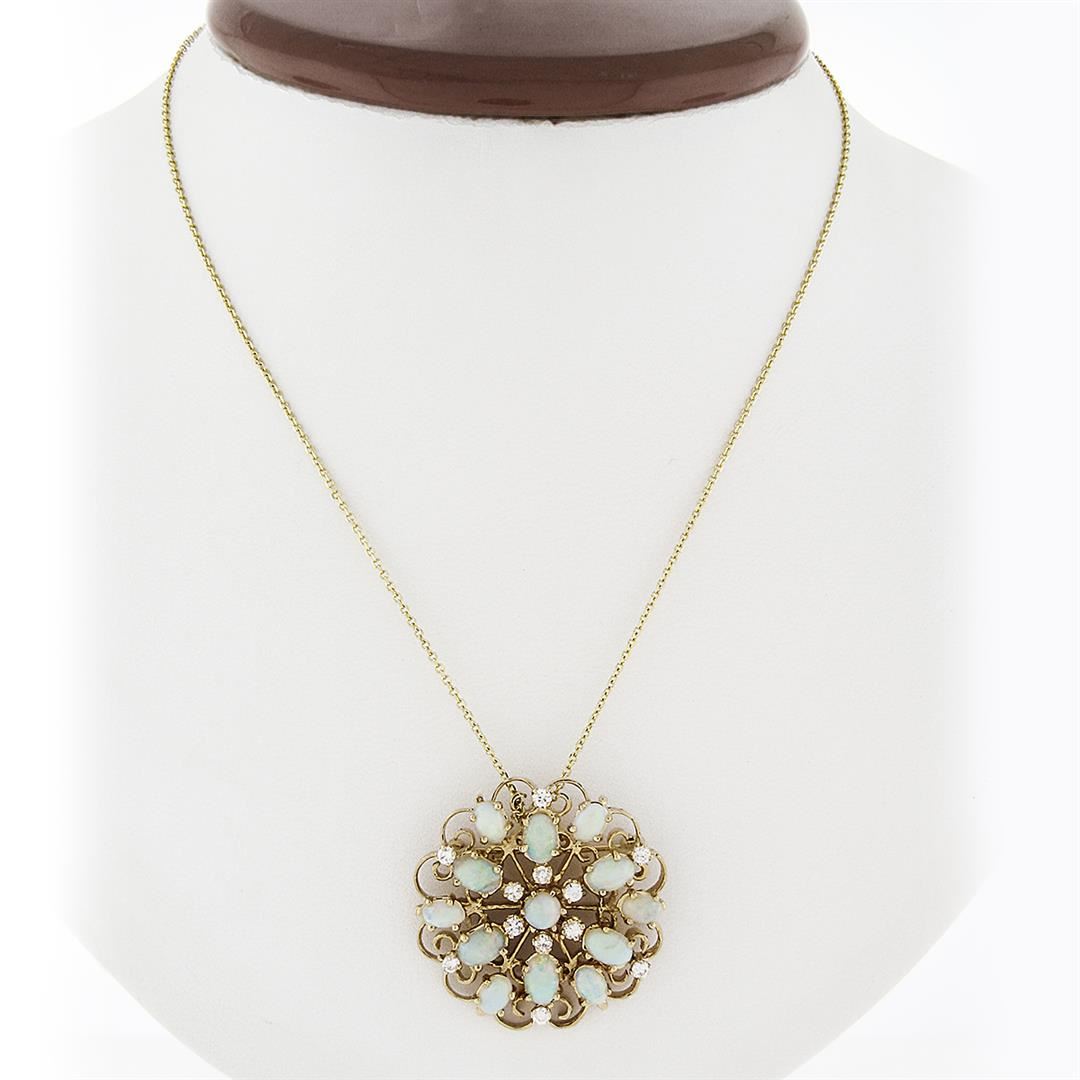 a vintage solid 14k yellow gold brooch pendant necklace. with 13 round & oval cabochon cut natural opals (6x4mm (6 Opals) - 5x3.5mm (6 Opals) - 4.3mm (1 Round Opal)), & 12 round brilliant cut natural diamonds (G/H- VS2/SI1; 0.42ctw). 18 inch cable link chain, 11.51 grams total weight, pendant measures 30.25mm in diameter.