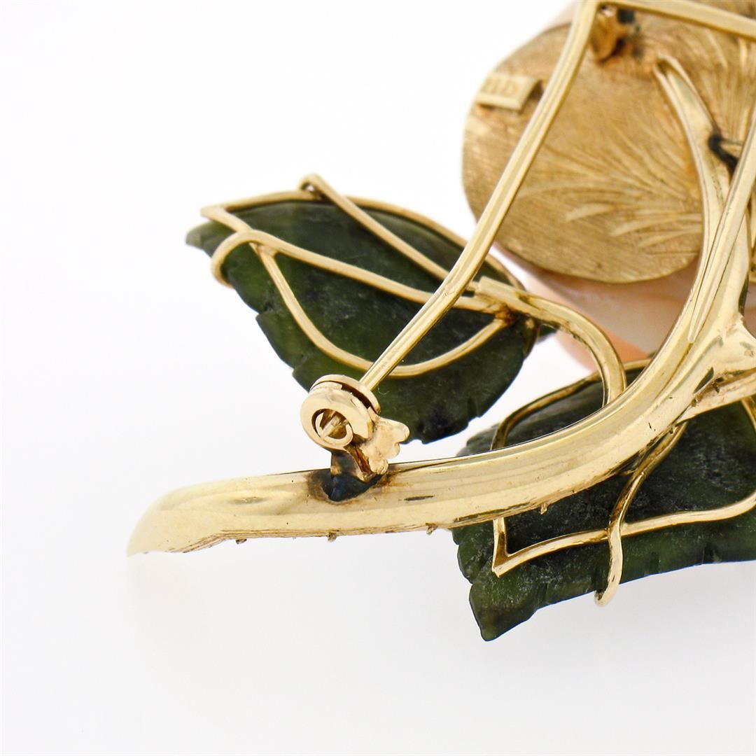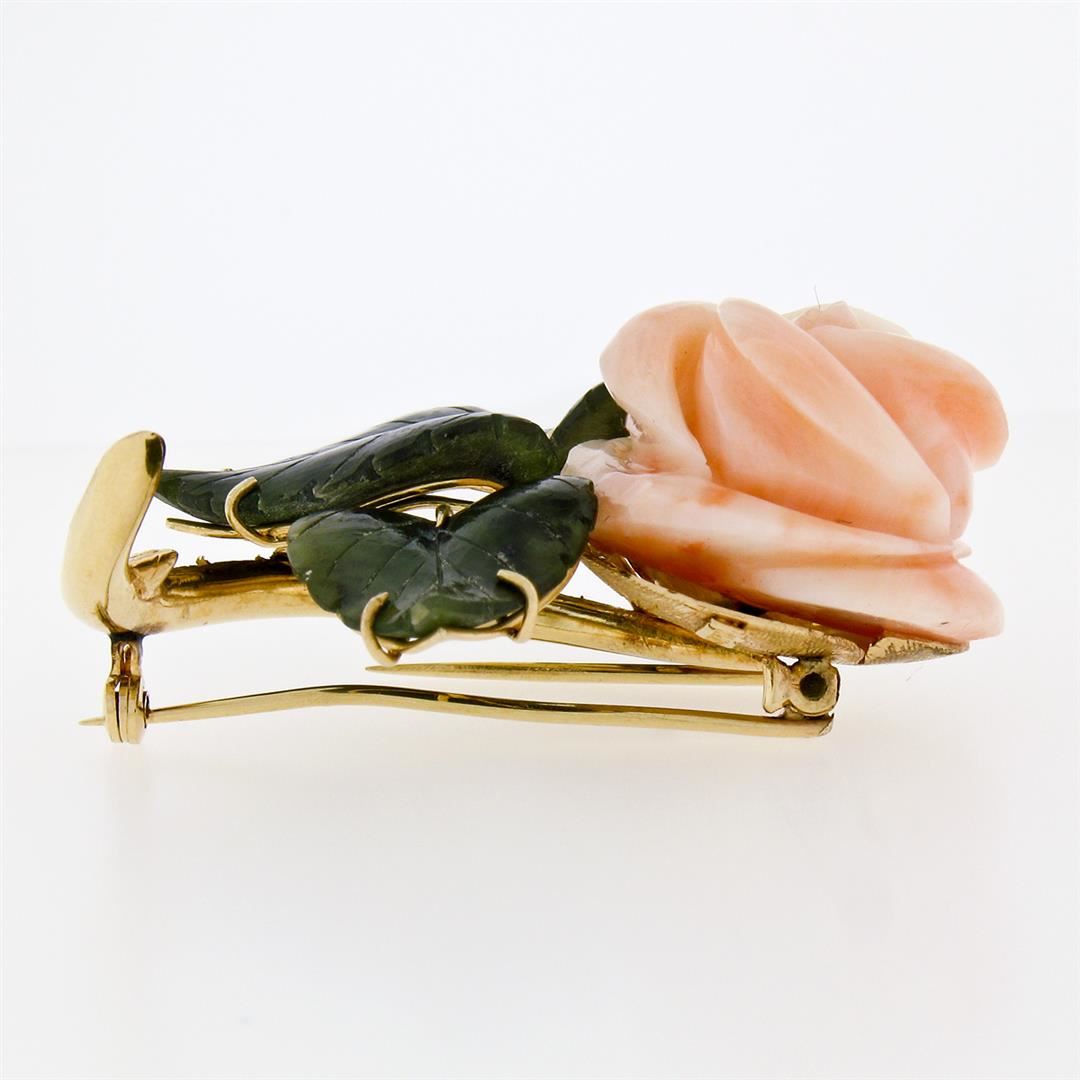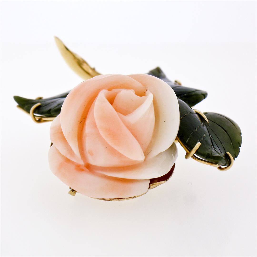 Vintage 14K Yellow Gold Carved Pink Coral Rose Flower w/ 3 Jade Leaf Brooch Pin. Please see photos and description for all available information. A vintage solid 14k yellow gold flower pin brooch, with 1 carved rose shape natural coral (22.5x20.6mm), and 3 carved leaf shape natural jade (16.2x18.7mm). Measures 39.6x43.5mm and weighs a total of 18.57 grams.