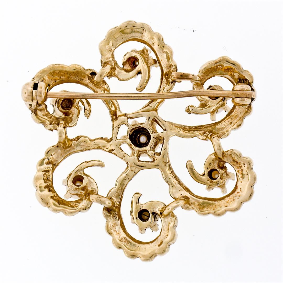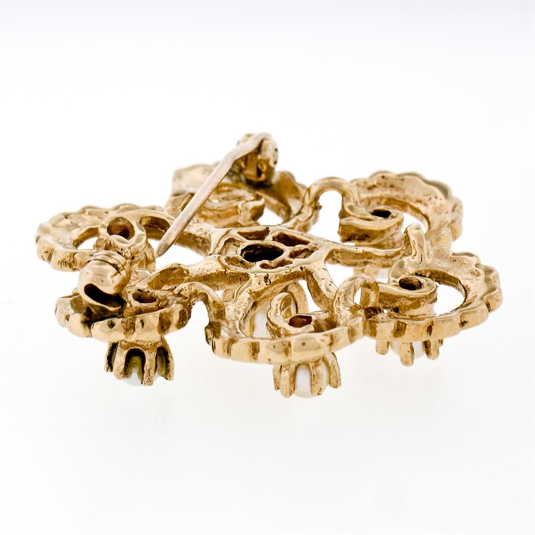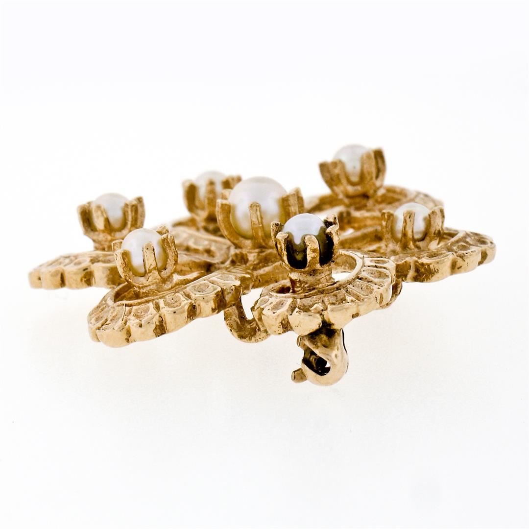 A vintage 14k yellow gold open work pin brooch, featuring 7 round shape natural cultured pearls (4.10mm (center pearl), (2.95-3.20mm outer pearls)). Measures 30.45mm in diameter and weighs a total of 7.75 grams.