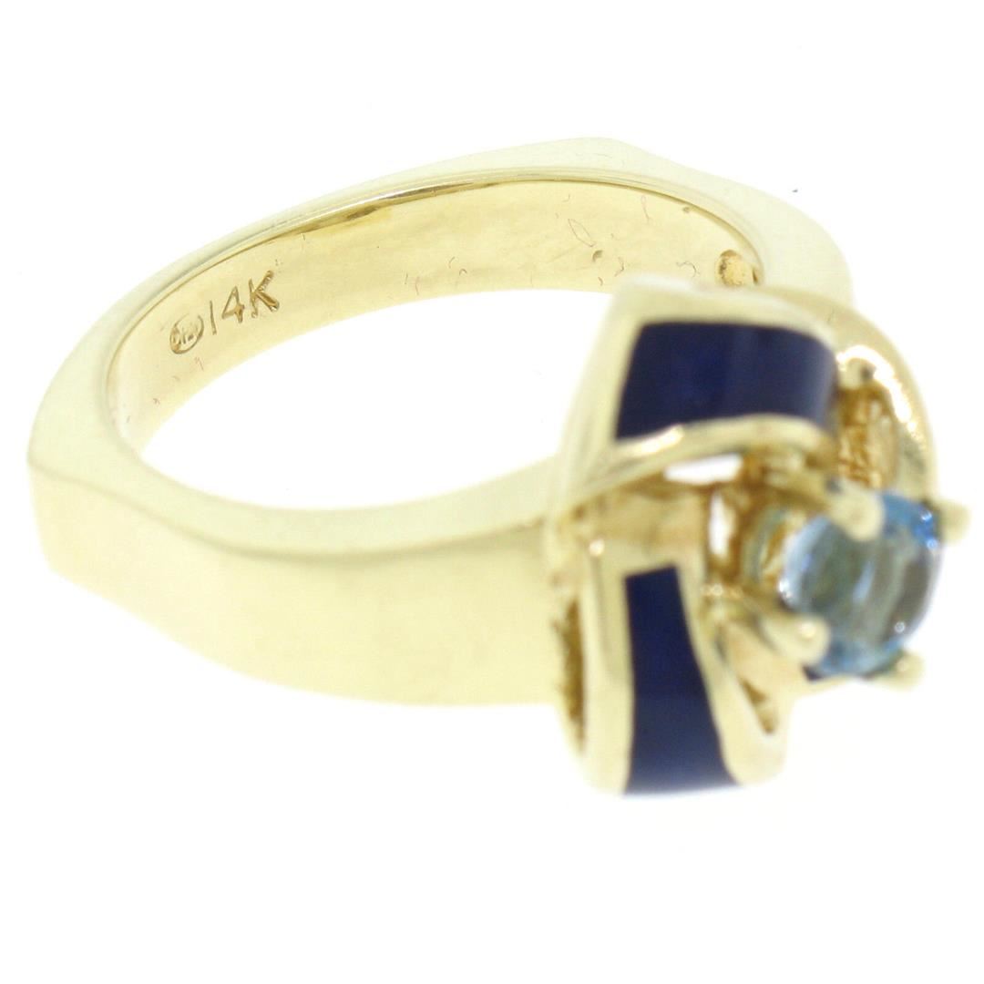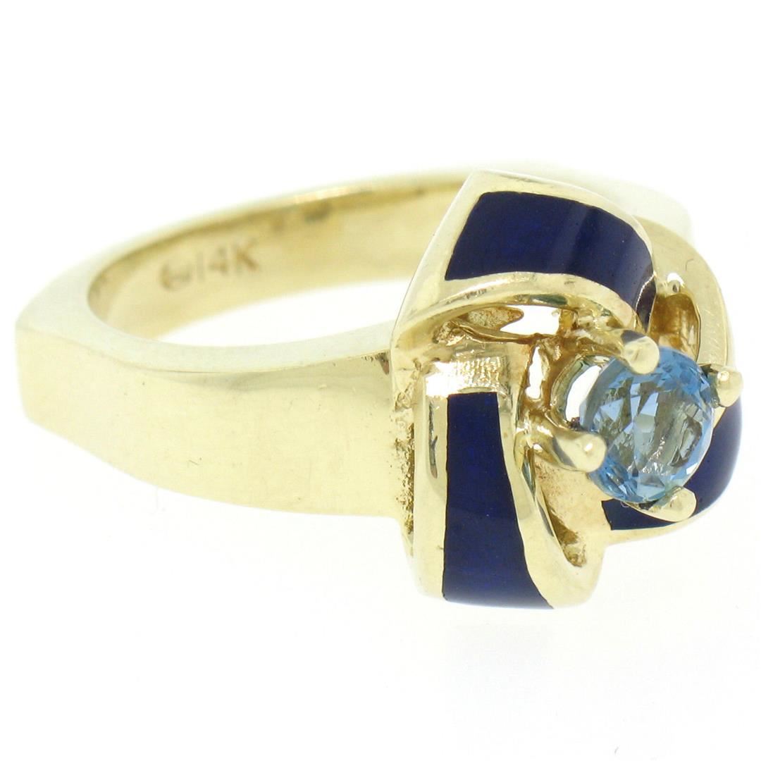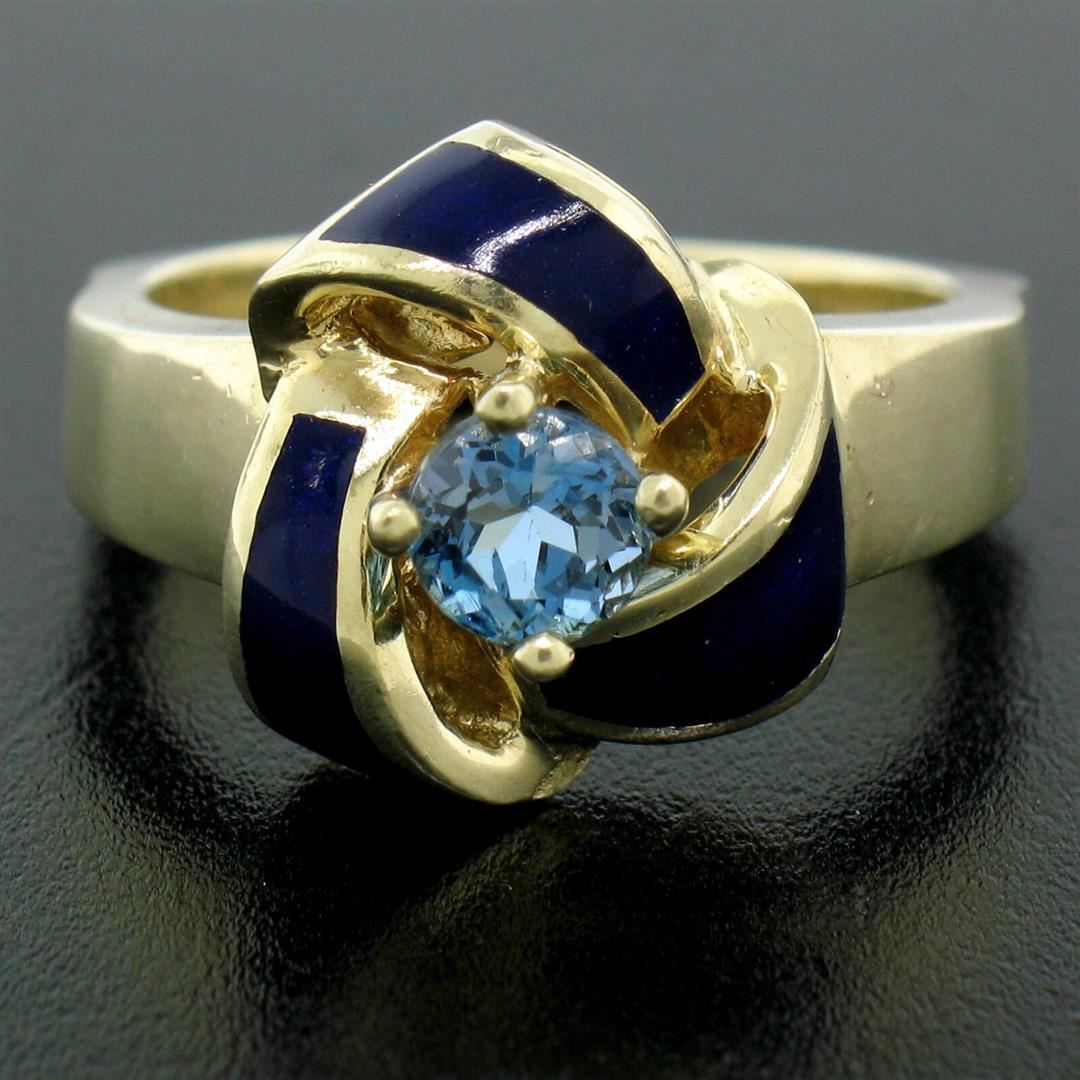 Vintage 14K Yellow Gold FINE Aquamarine & Blue Enamel Trinity Knot Cocktail Ring. Please see photos and description for all available information. A vintage solid 14k yellow gold knot ring, with blue enamel work and 1 round brilliant cut natural aquamarine (0.56ct). The ring is size 8.0, weighs a total of 10.28 grams, and measures 14.75mm wide.