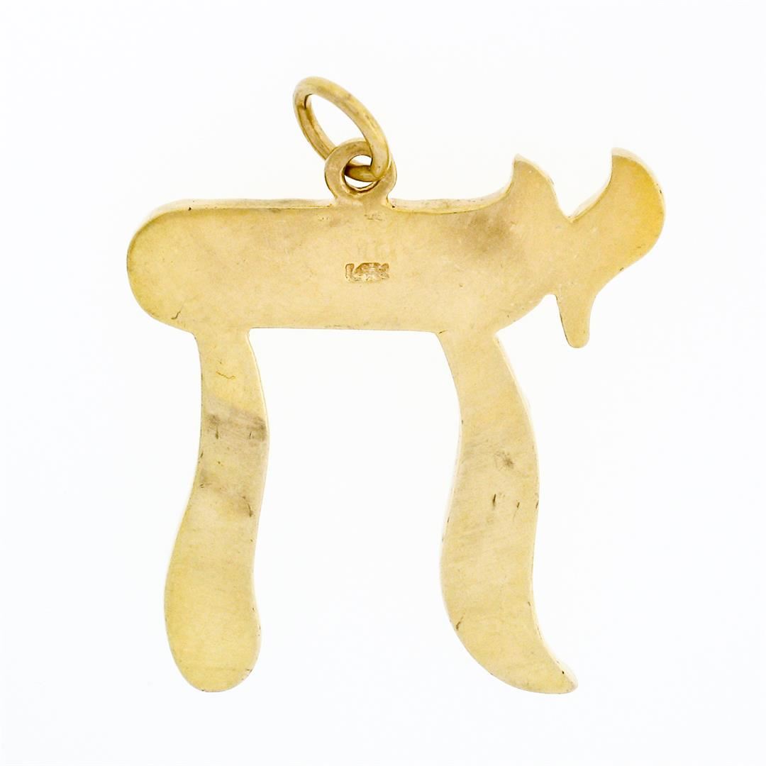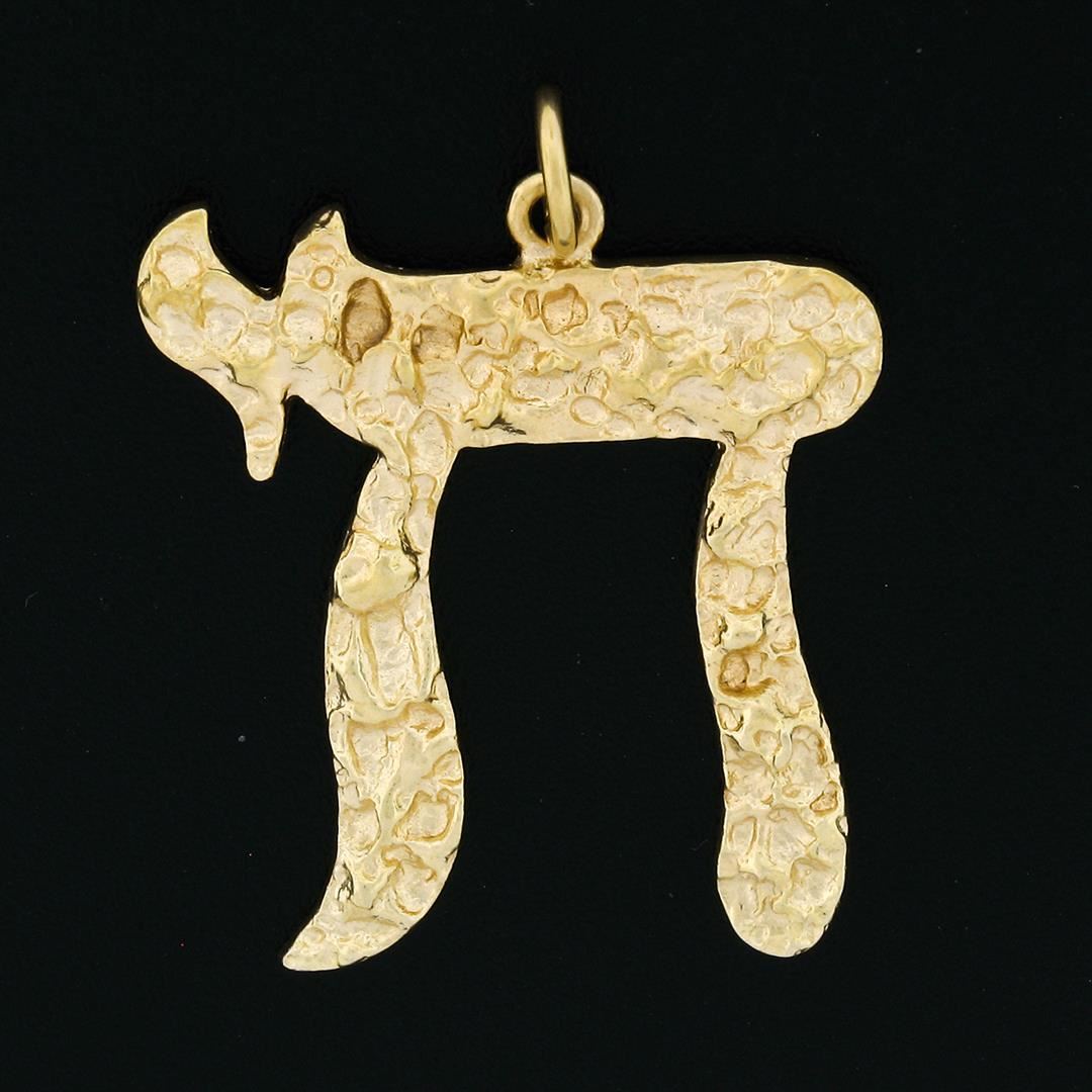 A vintage solid 14k yellow gold textured chai symbol charm pendant. The pendant weighs a total of 5.35 grams, measures 27.76x25.15mm including the bail, and the inside of the bail measures 3.90x3.90mm.