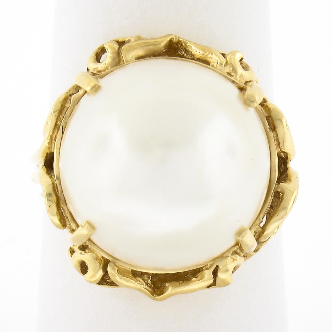 A vintage solid 14k yellow gold ring, with 1 round shape cultured mabe pearl (14.8mm). The ring is size 6.5, weighs a total of 7.01 grams, and measures 18.8mm wide.