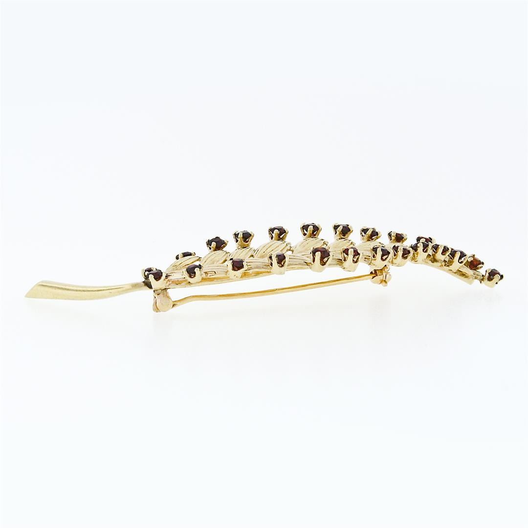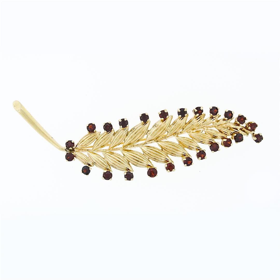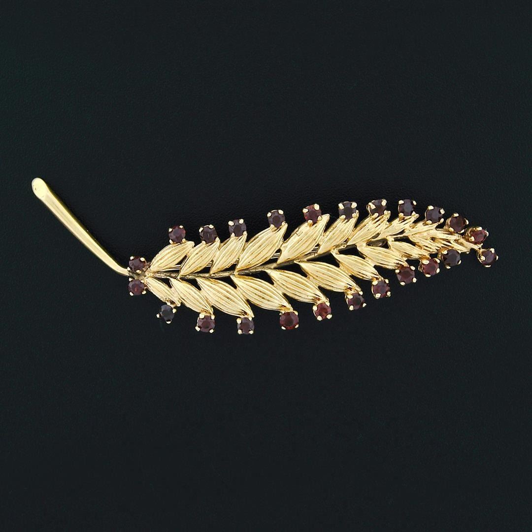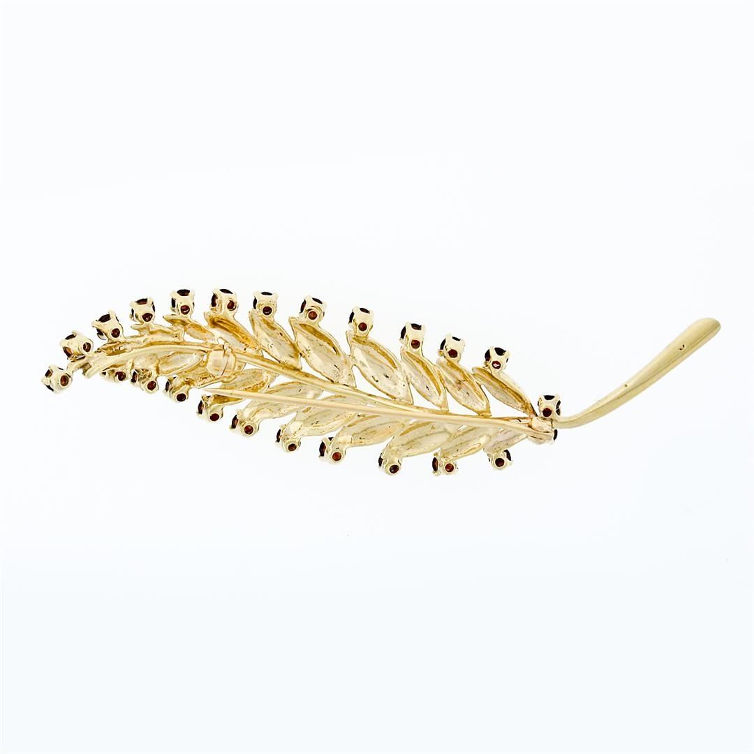 A vintage 14k yellow gold long feather leaf brooch with 24 round brilliant cut natural garnets (1.68ctw). Measures 69.2x18mm and weighs a total of 8.14 grams.