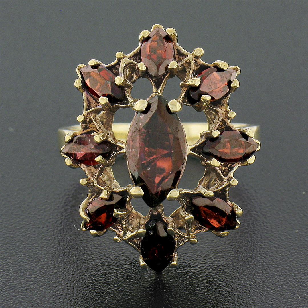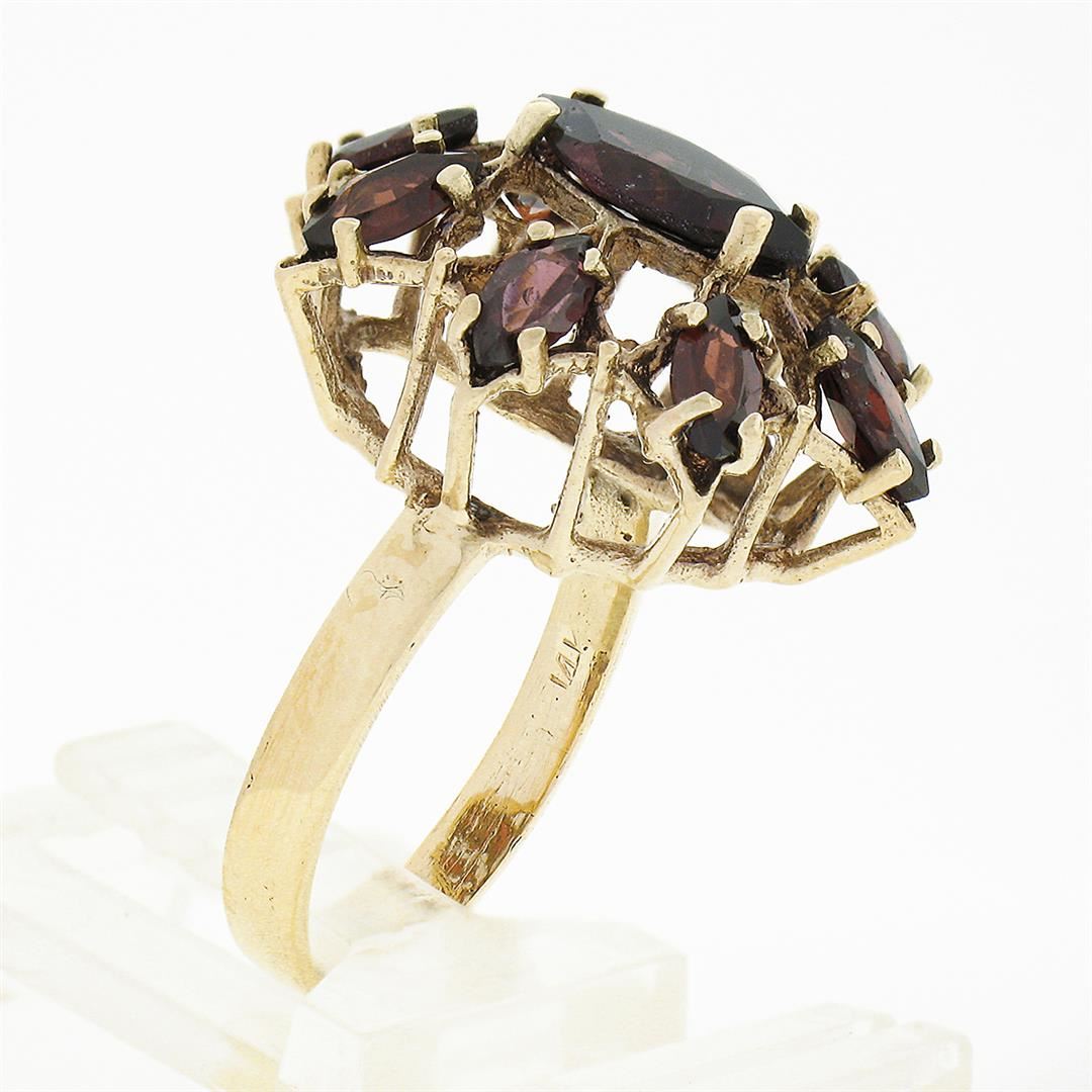 A solid 14k yellow gold flower cocktail ring, with 8 marquise cut natural garnets (3x6mm), and 1 marquise cut natural garnet (5x10mm). The ring is size 7.0, weighs a total of 4.54 grams, and measures 22.40mm wide.
