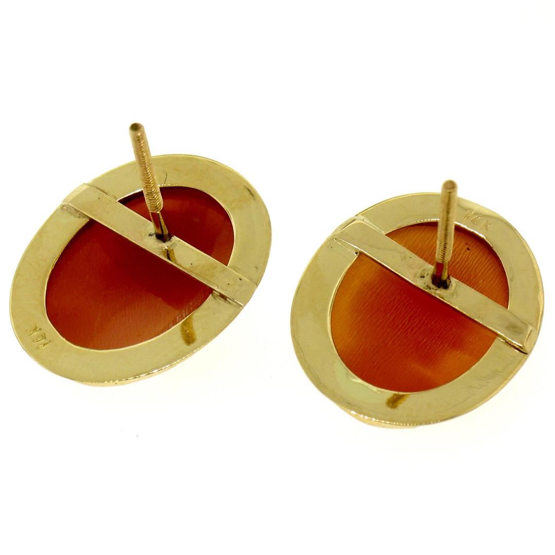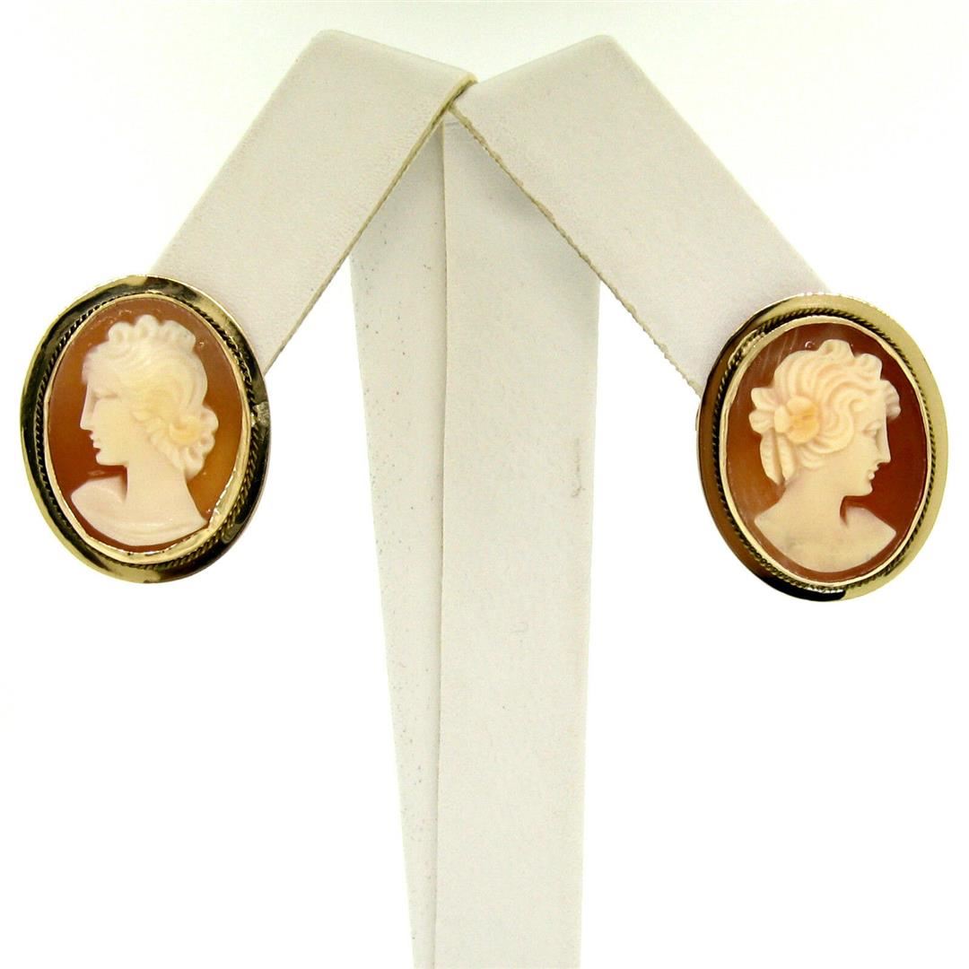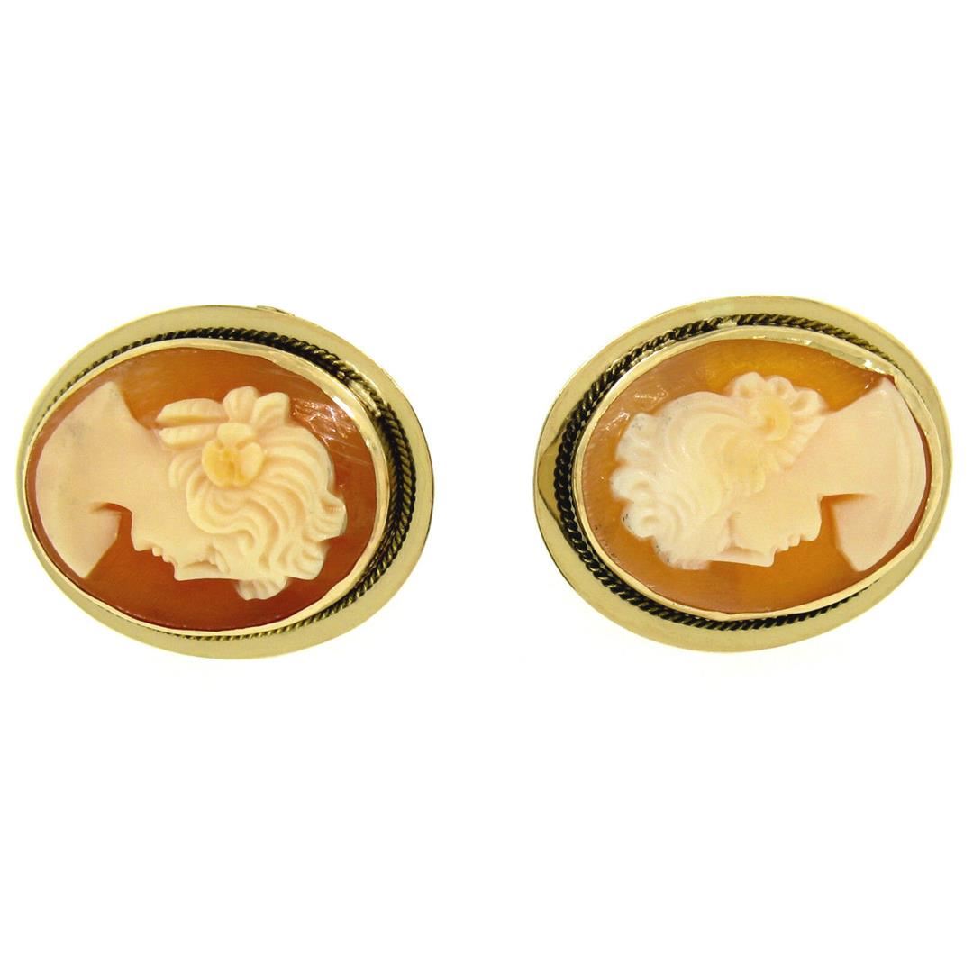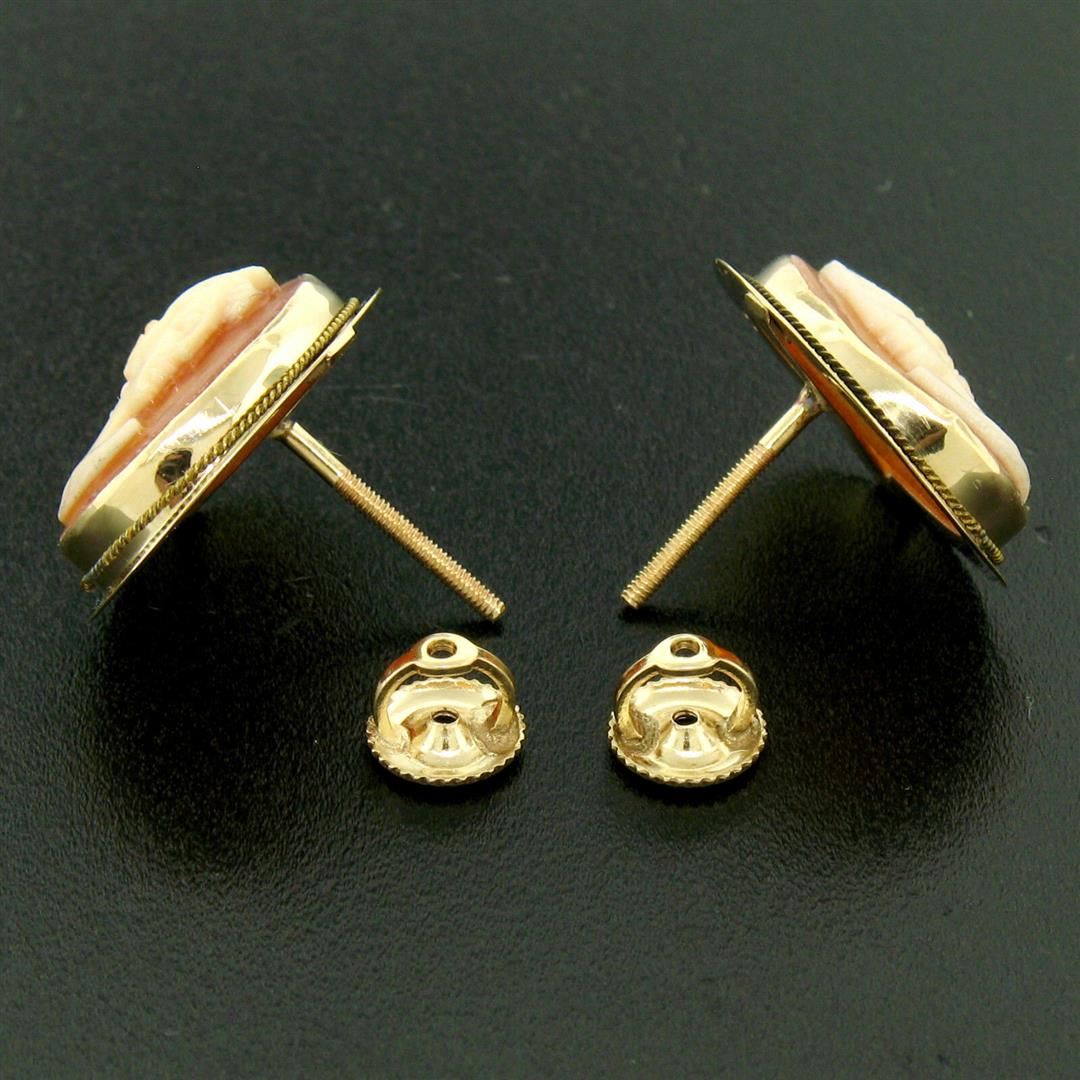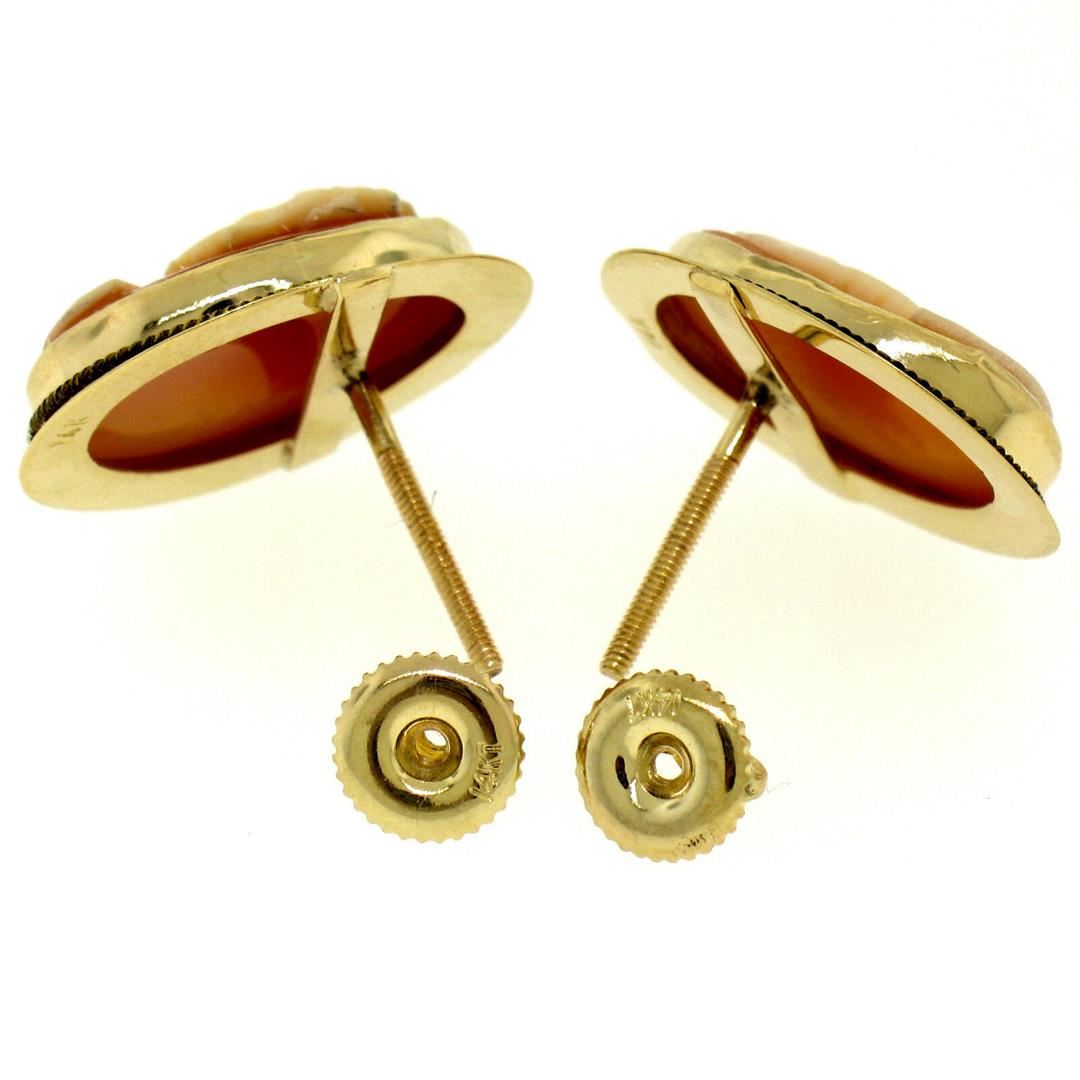 One Vintage 14K Yellow Gold Oval Carved Shell Cameo Framed Screw Back Stud Earrings. Item Details: Material: 14K Solid Yellow Gold, Weight: 4.4 Grams, Backing: Threaded Posts w/ Screw Backings, Width: 15.4mm, Height: 19mm, Thickness: 4.6mm, Condition: Vintage piece - Excellent condition!,