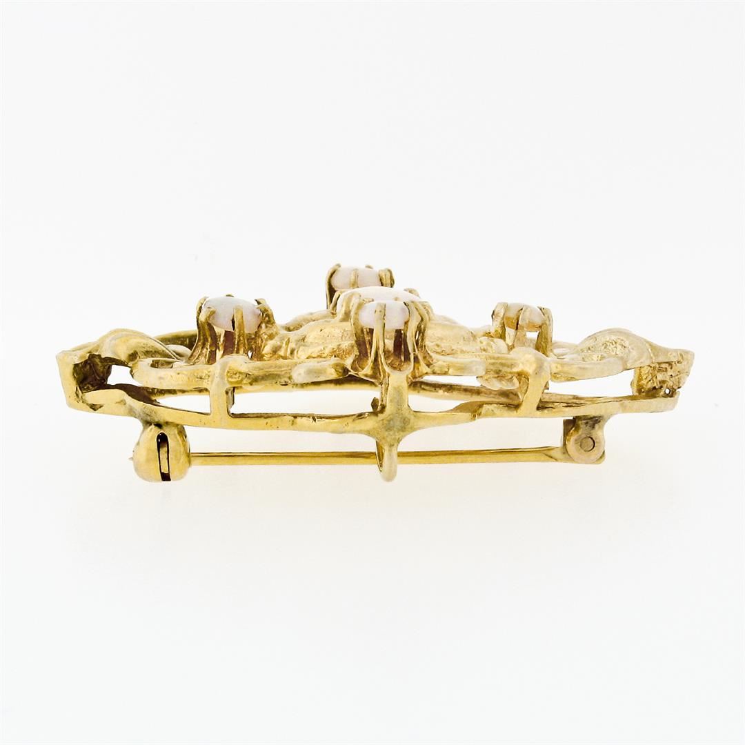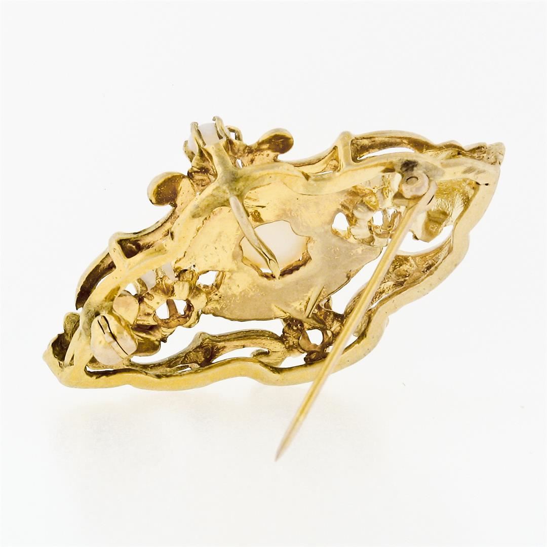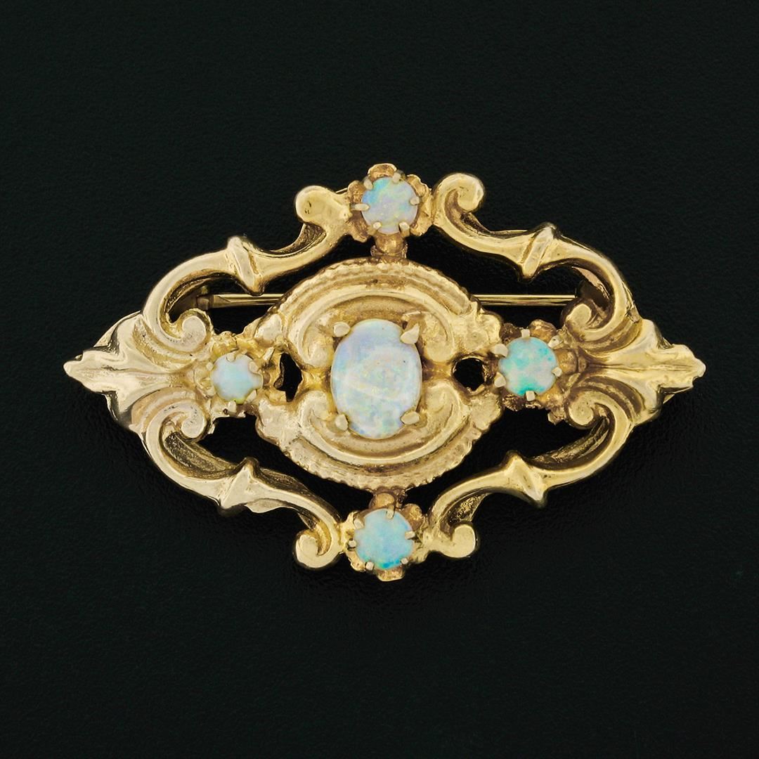 A vintage solid 14k yellow gold brooch pendant, with 1 oval cabochon cut natural opal (7.20x5.50mm), and 2 round cabochon cut natural opals (3.40-3.60mm). Measures 25.15x38.65mm and weighs a total of 8.54 grams.