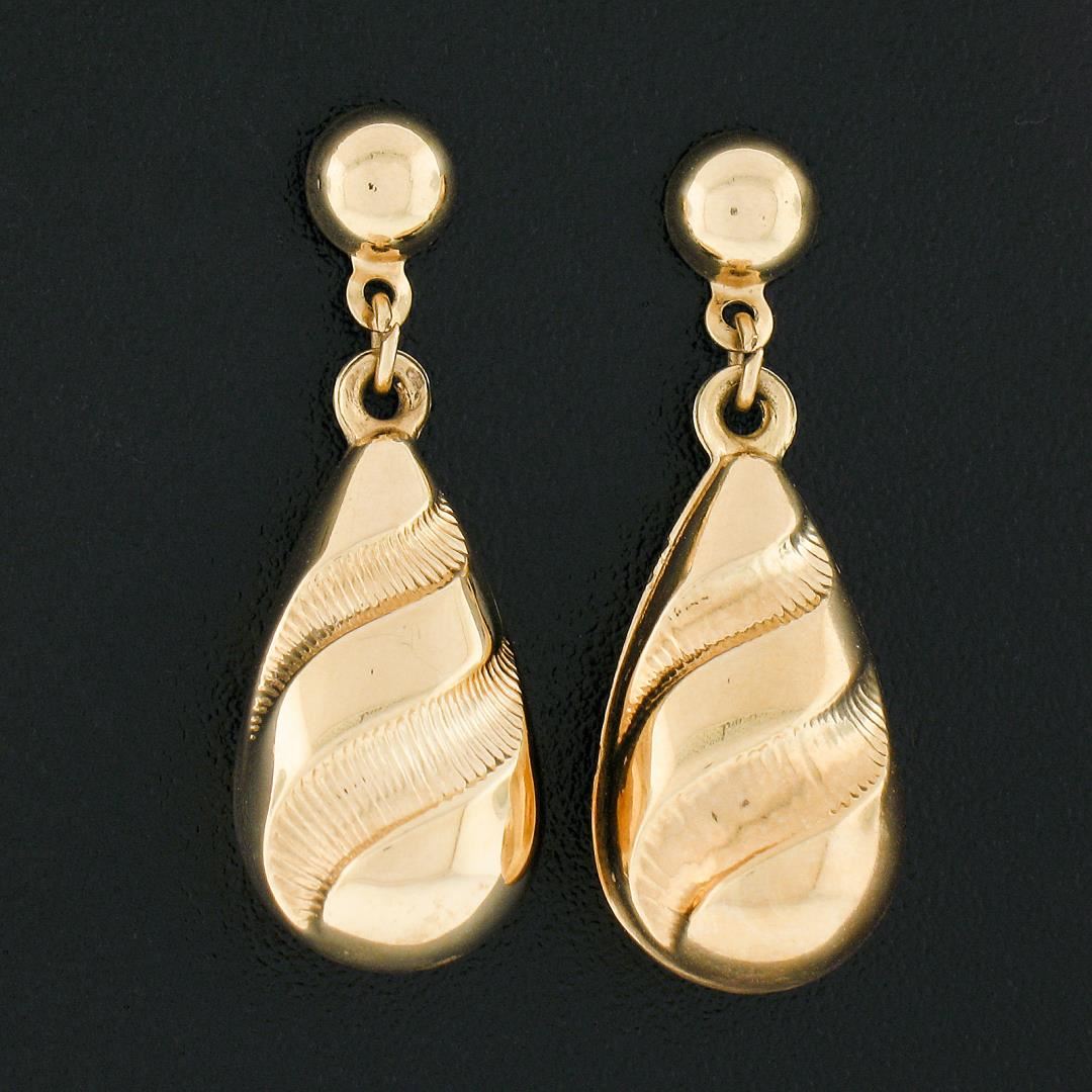 A vintage solid 14k yellow gold tear drop dangle earrings. The earrings measure approximately 25x9mm and weigh a total of 1.31 grams.