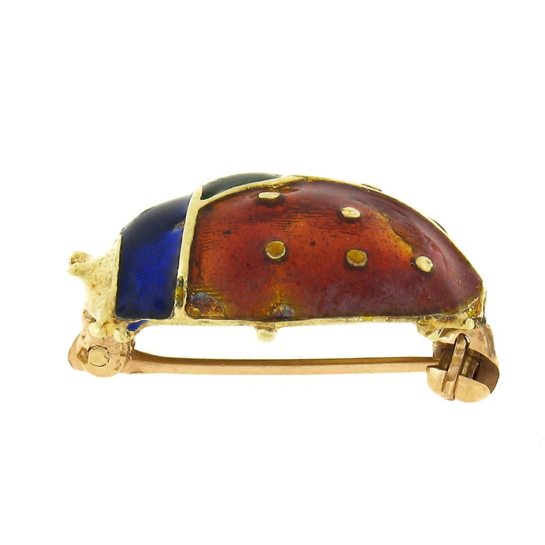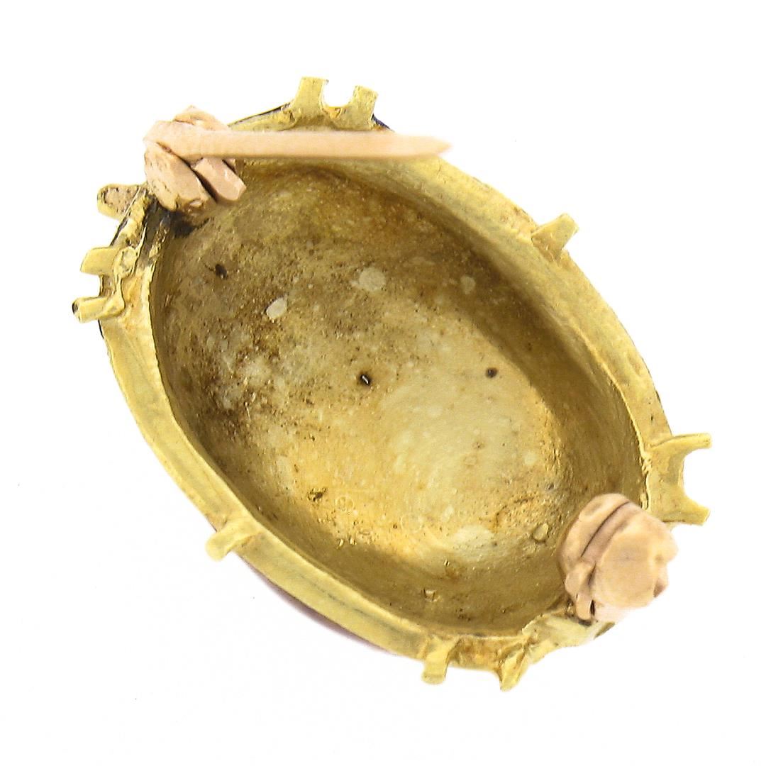 A vintage solid 14k yellow gold & enamel work brooch. Measures 19.2x14.8mm and weighs a total of 3.70 grams.