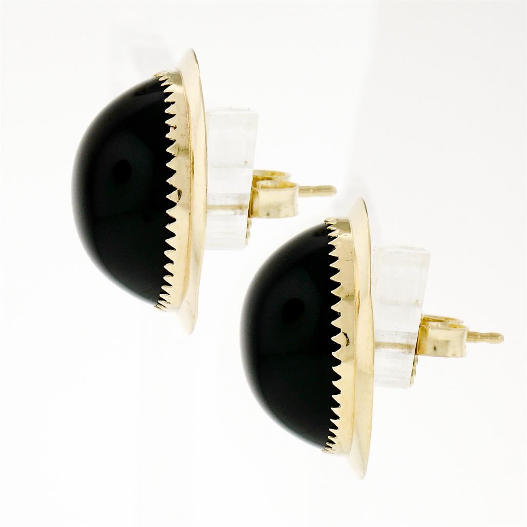 A vintage solid 14k yellow gold button earrings, with 2 round cabochon cut natural black onyx (7.40mm). The earrings measure approximately 9.15mm in diameter and weigh a total of 6.44 grams.
