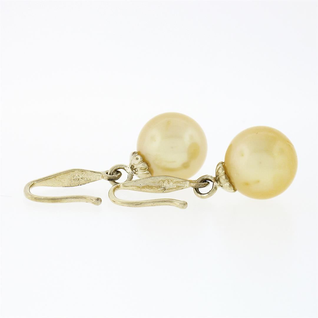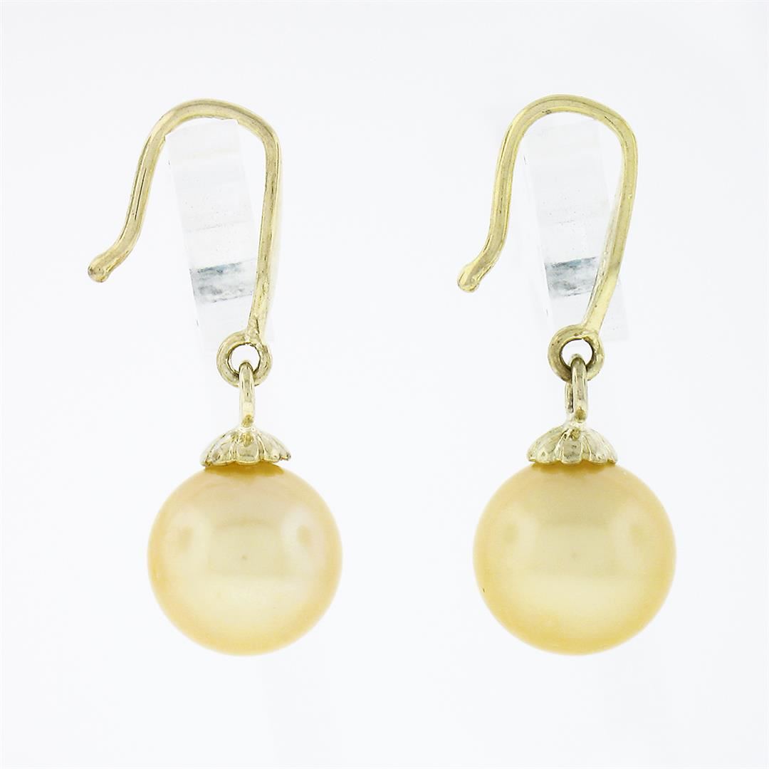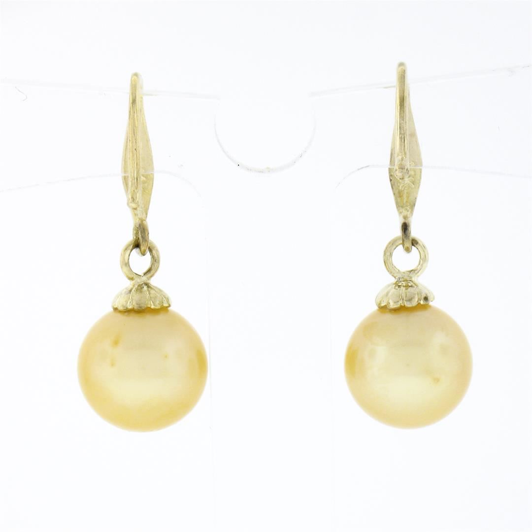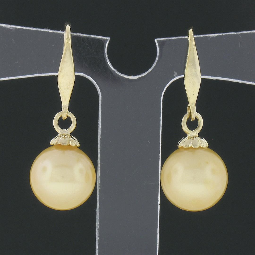 A vintage solid 18k yellow gold drop dangle earrings, with 2 round shape cultured pearls (8.3mm). The earrings measure approximately 22.4x8.3mm and weigh a total of 1.94 grams.