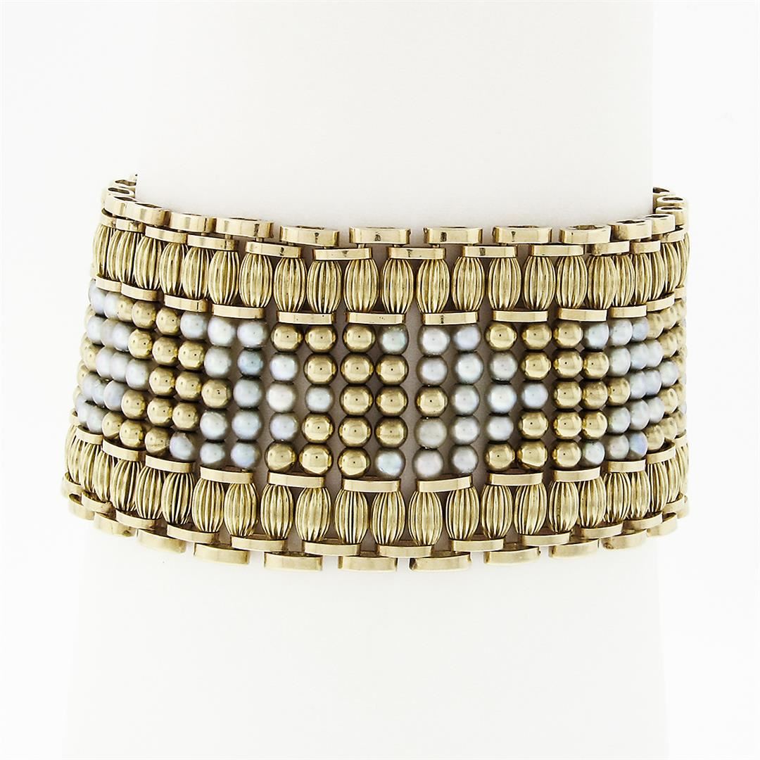 A vintage solid 14k yellow gold wide strap bracelet, with numerous of round shape cultures pearls (2.5 to 3mm ). It weighs a total of 61.50 grams, measures 31mm wide, and measures 6.75 inches in length.