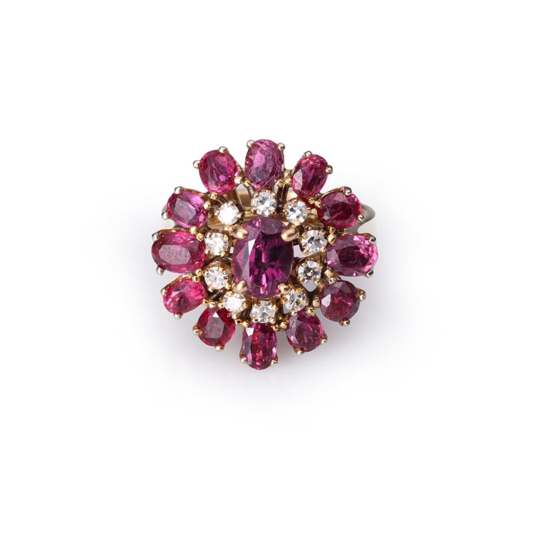 Vintage 14K Yellow Gold Ruby & Diamond Cluster Ring containing thirteen oval rubies weighing approximately 2.60 cts. Ten round cut brilliant diamonds weighing approximately 0.25 cts. Total weight of ring is 7.3 gm. Estimated retail value $3,000.