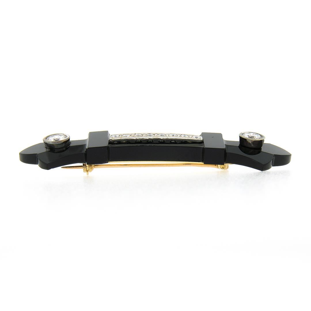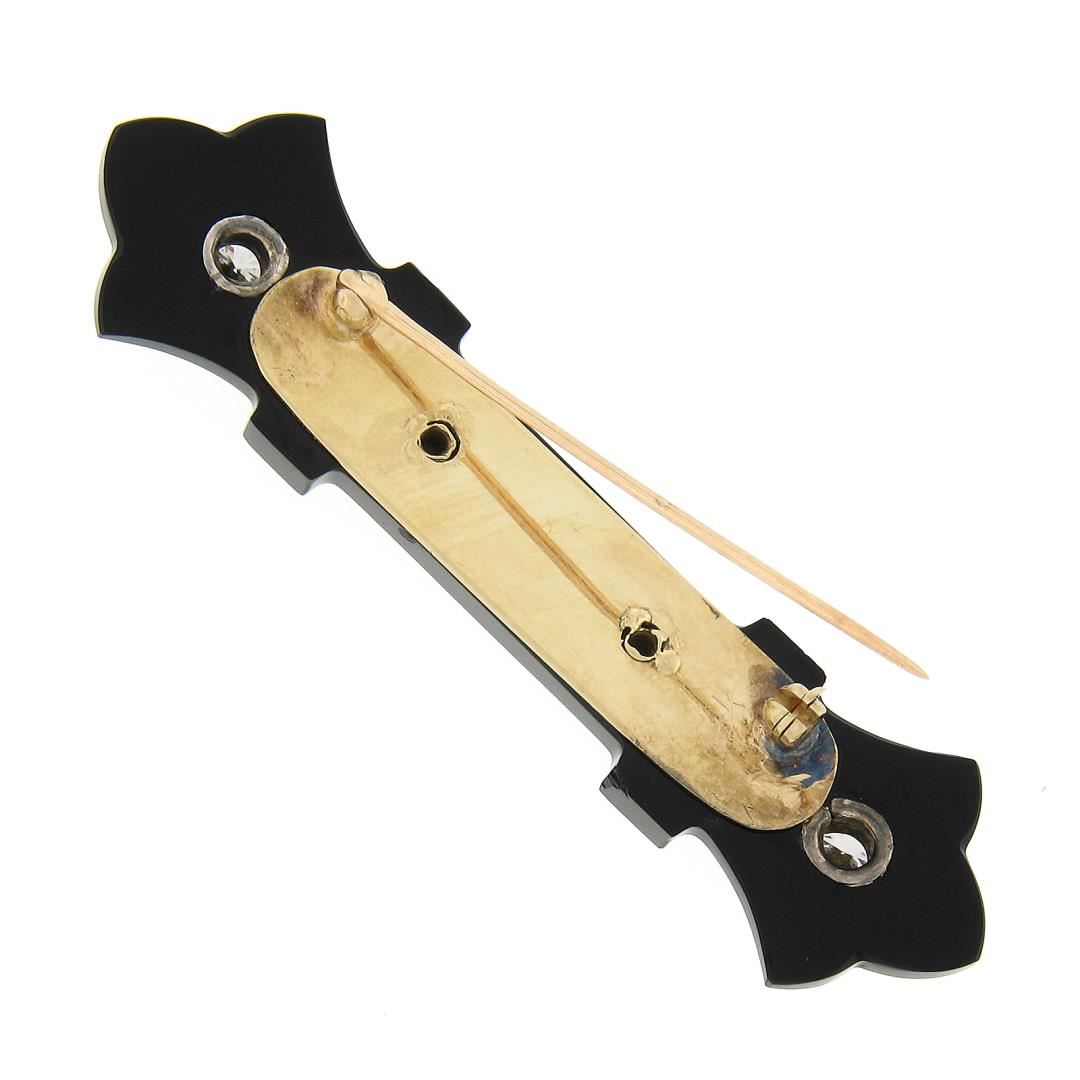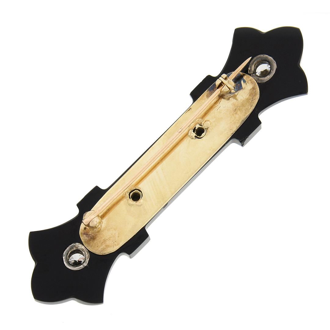 a vintage solid 14k yellow & white gold bar brooch. with 1 unique carved shape natural black onyx (60.45x16.3mm), and 10 round brilliant cut natural diamonds (G/H - VS1/VS2; 1.14ctw). Measures 16.30x60.45mm and weighs a total of 8.45 grams.