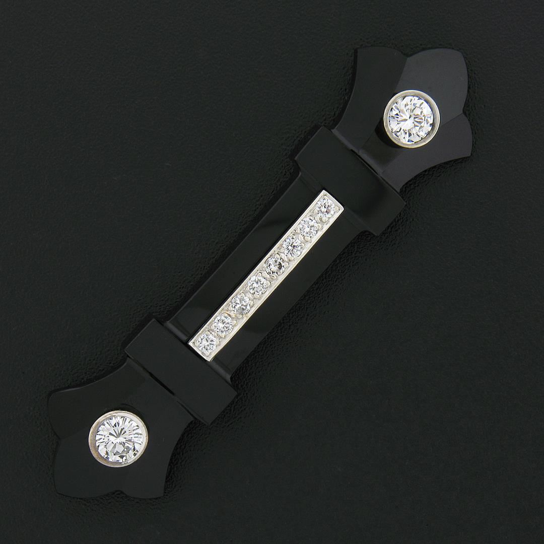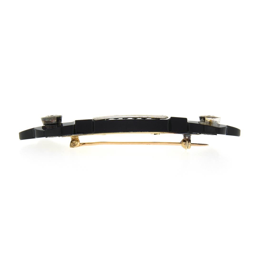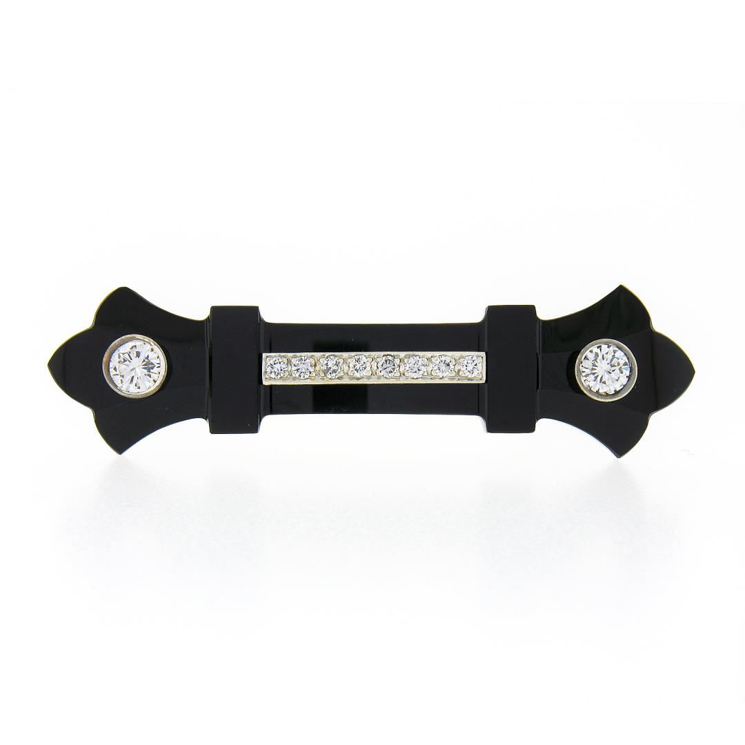 a vintage solid 14k yellow & white gold bar brooch. with 1 unique carved shape natural black onyx (60.45x16.3mm), and 10 round brilliant cut natural diamonds (G/H - VS1/VS2; 1.14ctw). Measures 16.30x60.45mm and weighs a total of 8.45 grams.