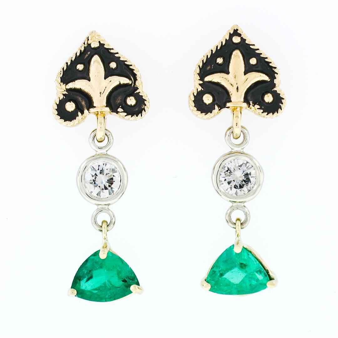A vintage solid 14k yellow gold pain on floral dangle earrings, with enamel work and 2 trillion cut natural colombian emerald (0.98ctw), and 2 round brilliant cut natural diamonds (F/G - VS2/SI1 ; 0.30ctw). The earrings measure approximately 25.5x9.2mm and weigh a total of 3.0 grams.