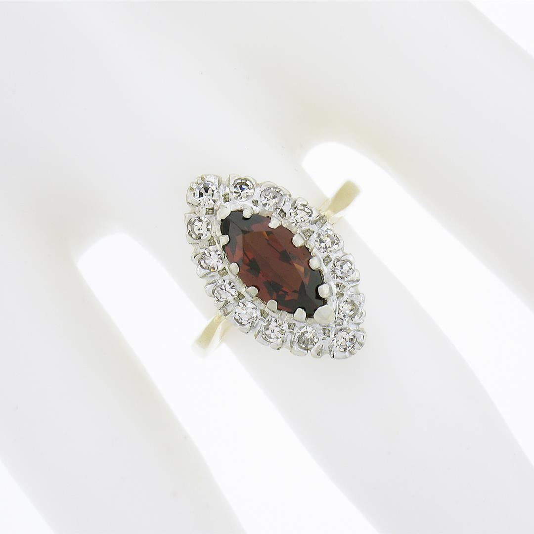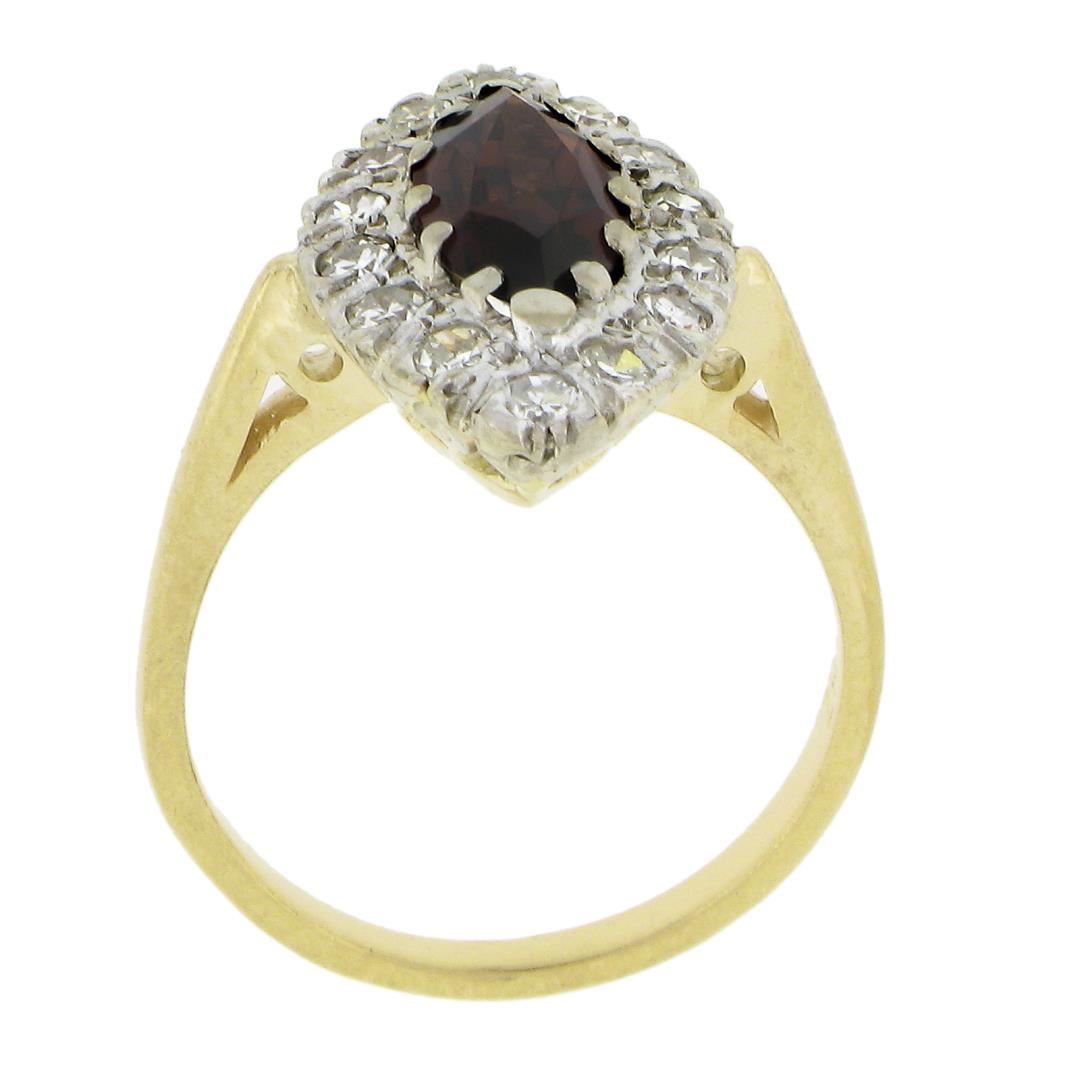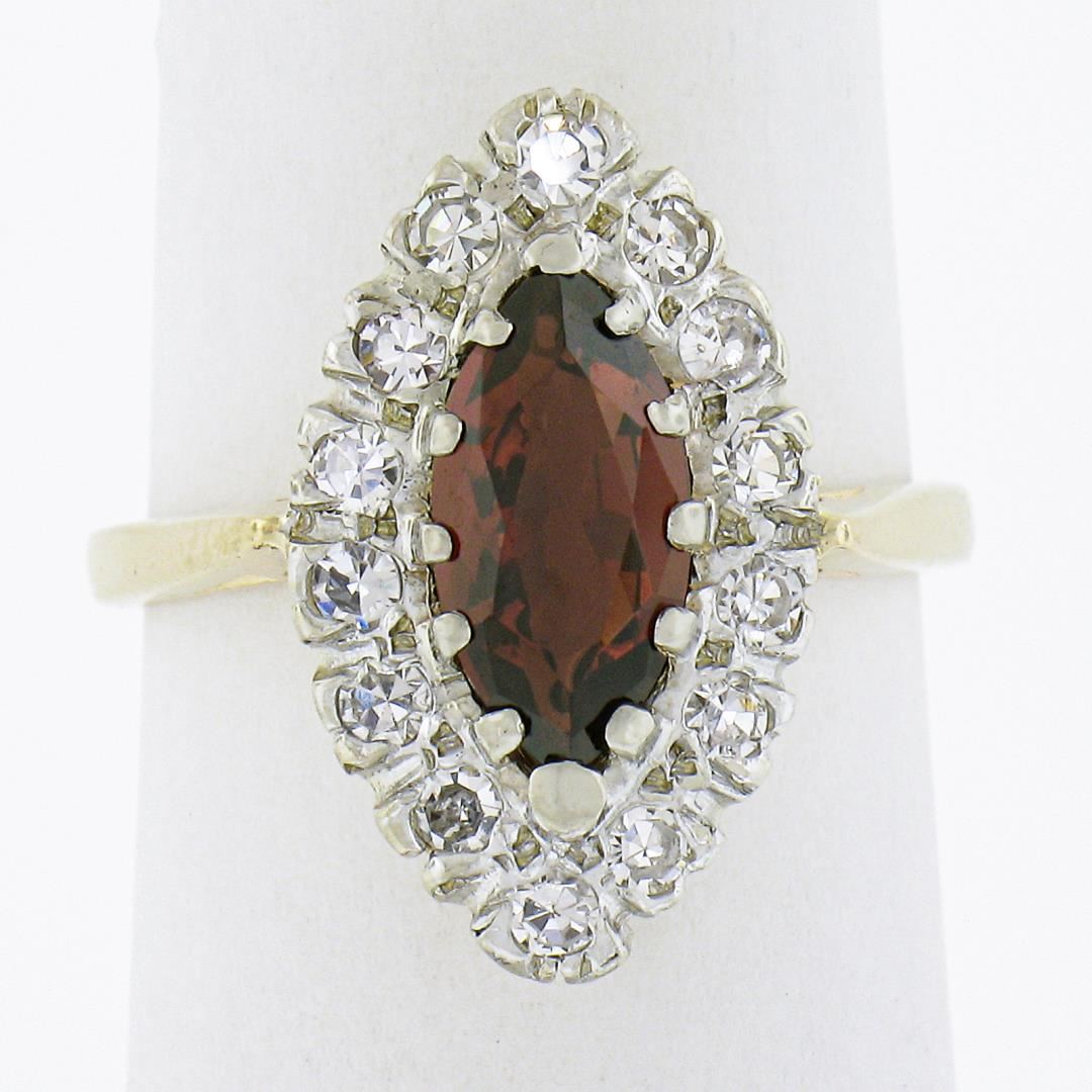 A vintage solid 14k yellow & white gold ring, featuring 1 marquise cut natural garent (1.29ct), and 14 old single cut natural diamonds (G-I - VS2-I1 ; 0.28ctw).The ring is size 6.5, weighs a total of 3.83 grams, and measures 18mm wide.