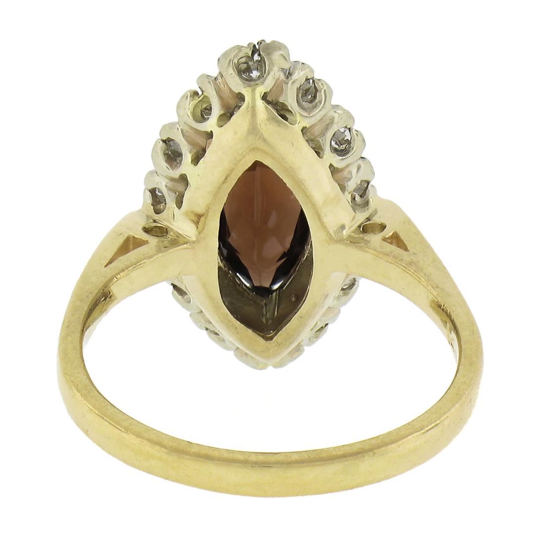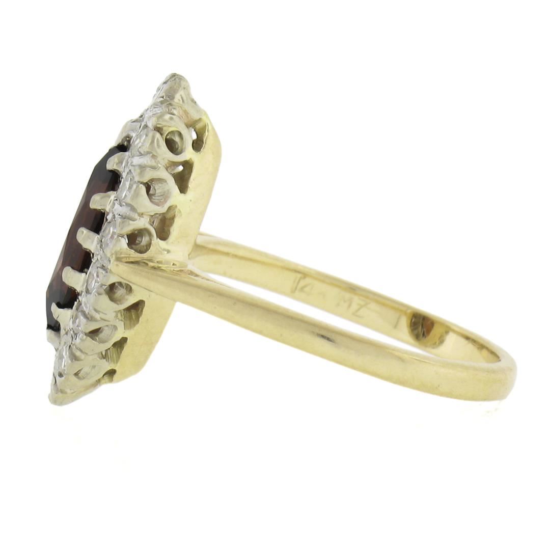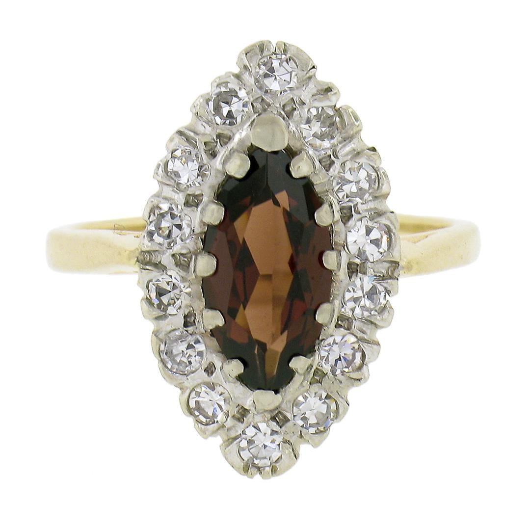 A vintage solid 14k yellow & white gold ring, featuring 1 marquise cut natural garent (1.29ct), and 14 old single cut natural diamonds (G-I - VS2-I1 ; 0.28ctw).The ring is size 6.5, weighs a total of 3.83 grams, and measures 18mm wide.