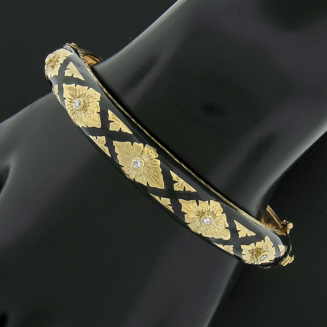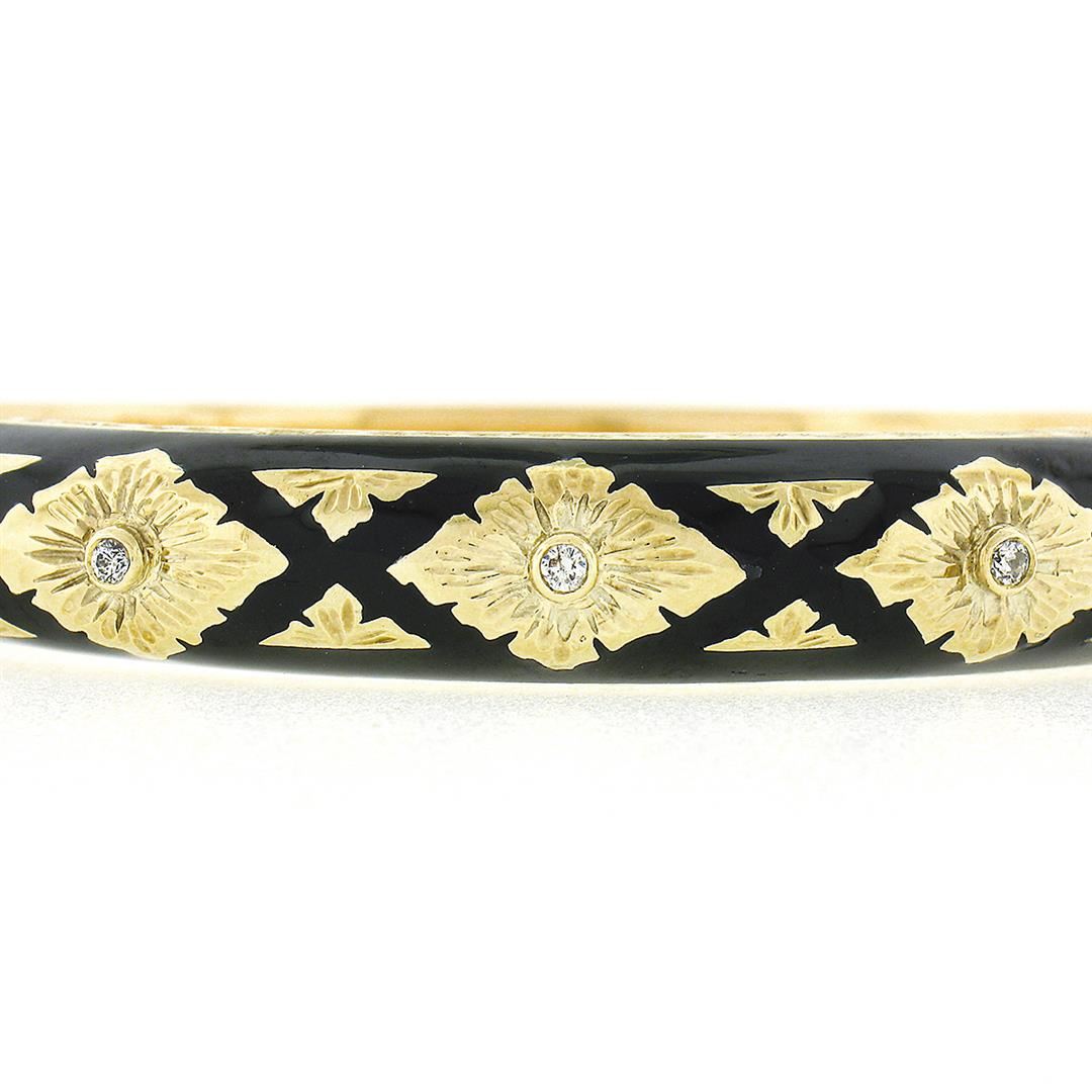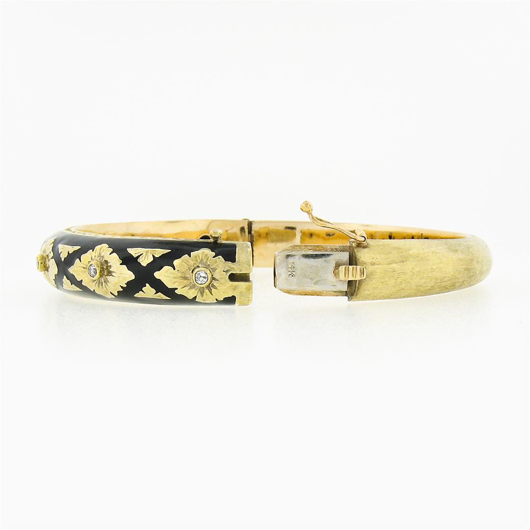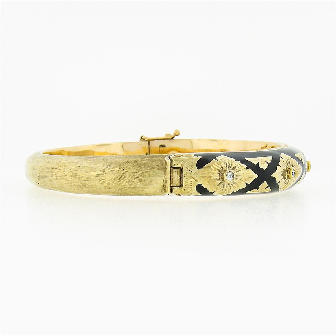 A solid 14k yellow gold black onyx engraved hinged open bangle bracelet, with 6 round brilliant cut natural diamonds (G/H - SI1/SI2 ; 0.18ctw). It weighs a total of 40.83 grams, measures 10.30mm wide, and measures 6.75 inches in length.