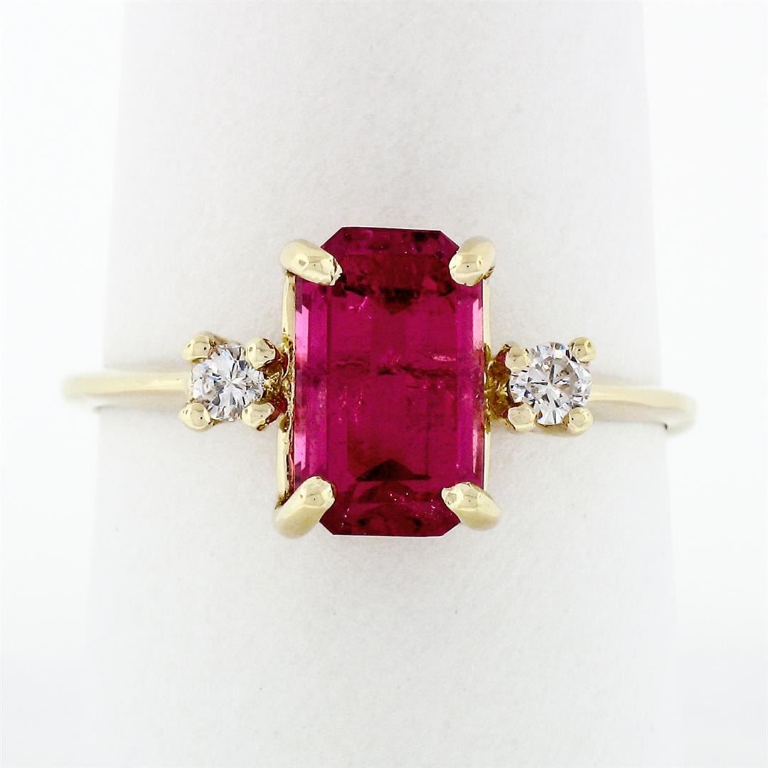 A vintage solid 14k yellow gold three stones ring, with 1 long emerald cut natural tourmaline (9.59x5.89mm - 2.08ct), and 2 round brilliant cut natural diamonds (G - VS2; 0.12ctw). The ring is size 8.5, weighs a total of 2.83 grams, and measures 9.67mm wide.