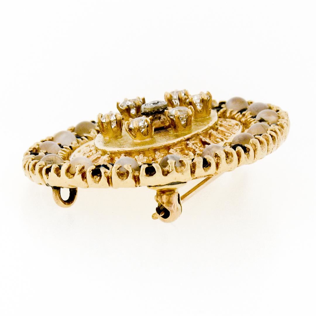 A vintage solid 14k yellow gold brooch pendant, featuring 7 old european and mine cut natural diamonds (G/H - SI1/SI2 ; 0.70ctw), with 34 round cut nagtural sapphires (1.70ctw), and 17 round cabochon cut natural moonstones (3.0mm ). Measures 39.8x31mm and weighs a total of 16.79 grams.