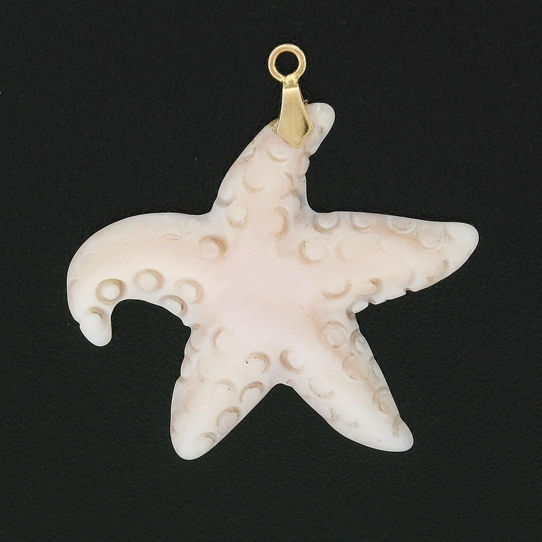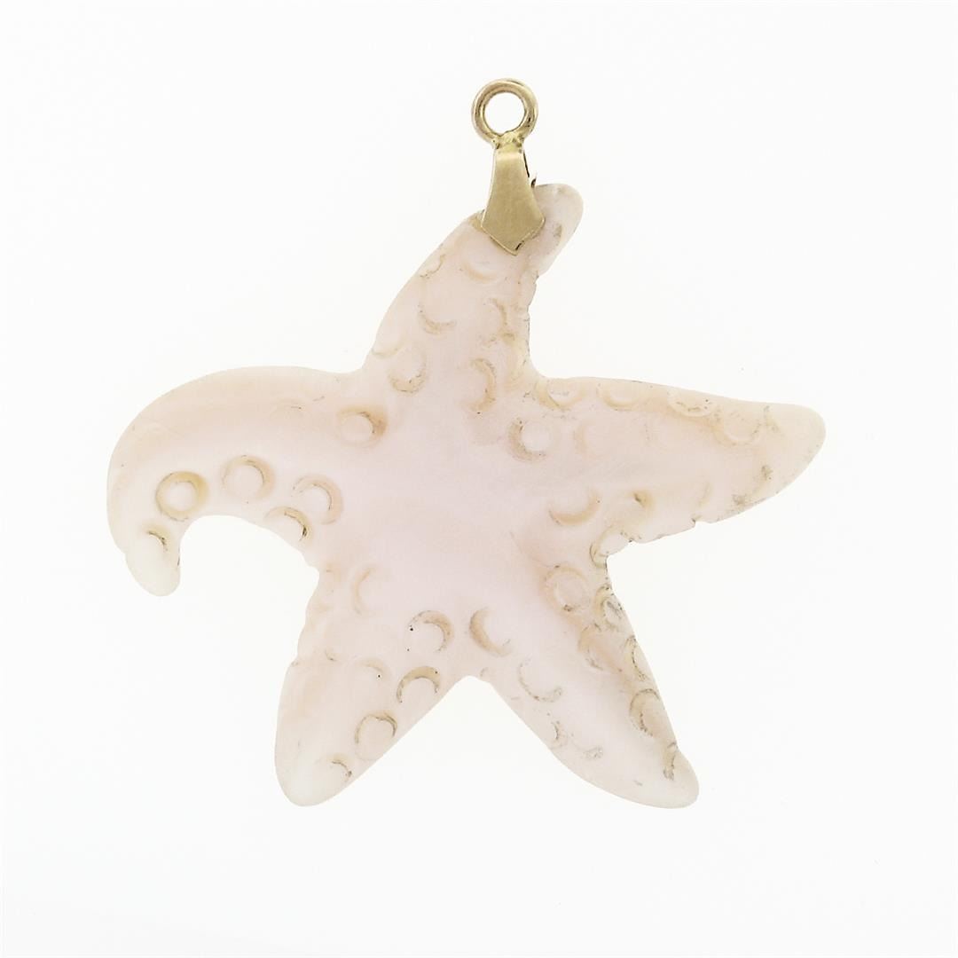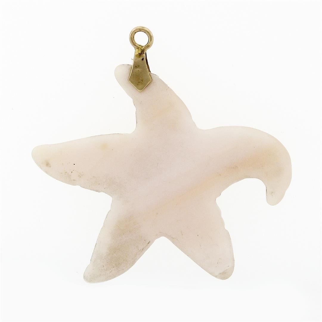 A vintage solid 14k yellow gold starfish pendant charm, featuring a carved star shape natural mother of pearl. The pendant weighs a total of 1.5 grams, measures 27.85x27.55mm including the bail, and needs a jump ring.