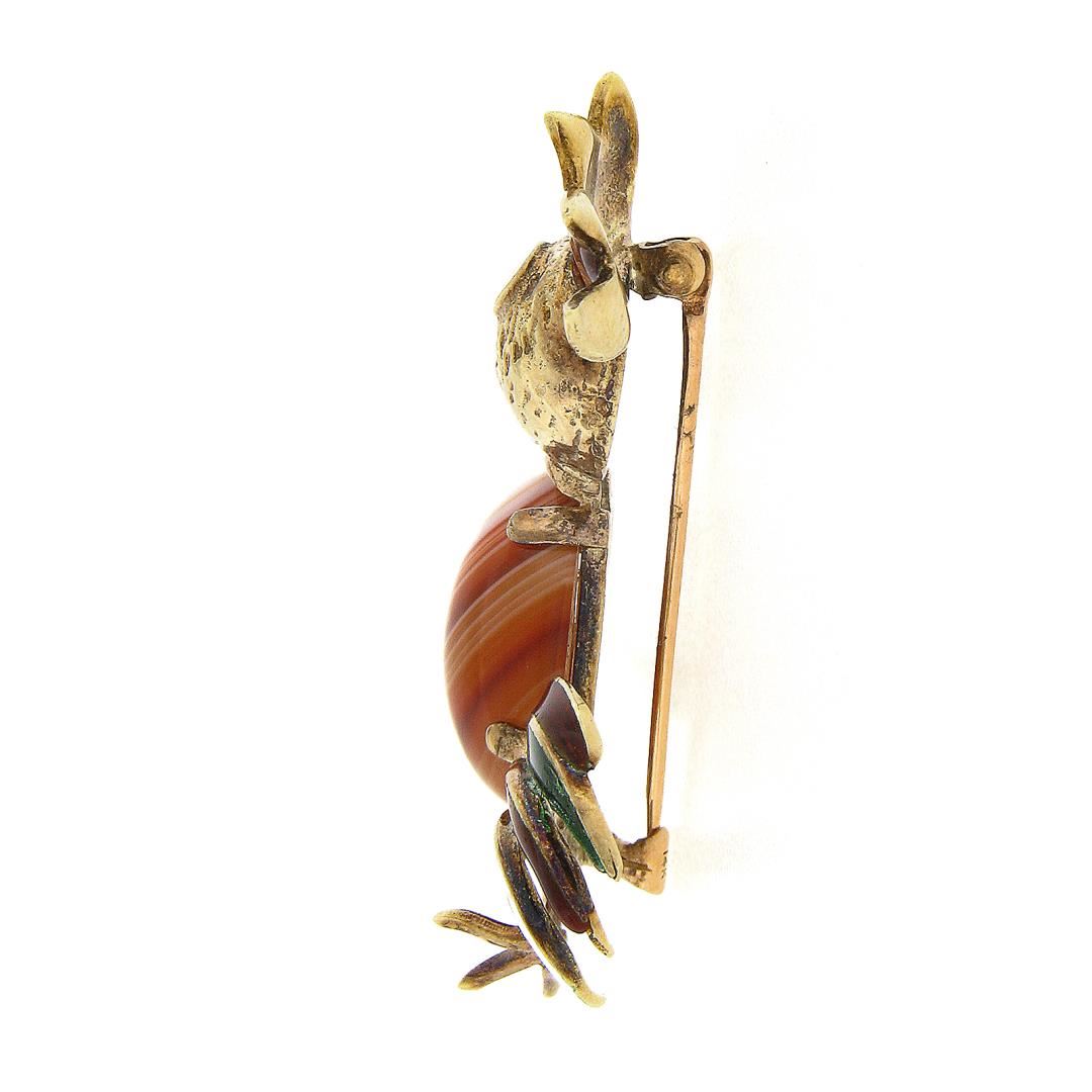 A vintage solid 14k yellow gold rooster brooch, with enamel work & 1 oval cabochon cut natural banded agate ( 17.3x12.8mm). Measures 41x37.50mm and weighs a total of 9.73 grams.
