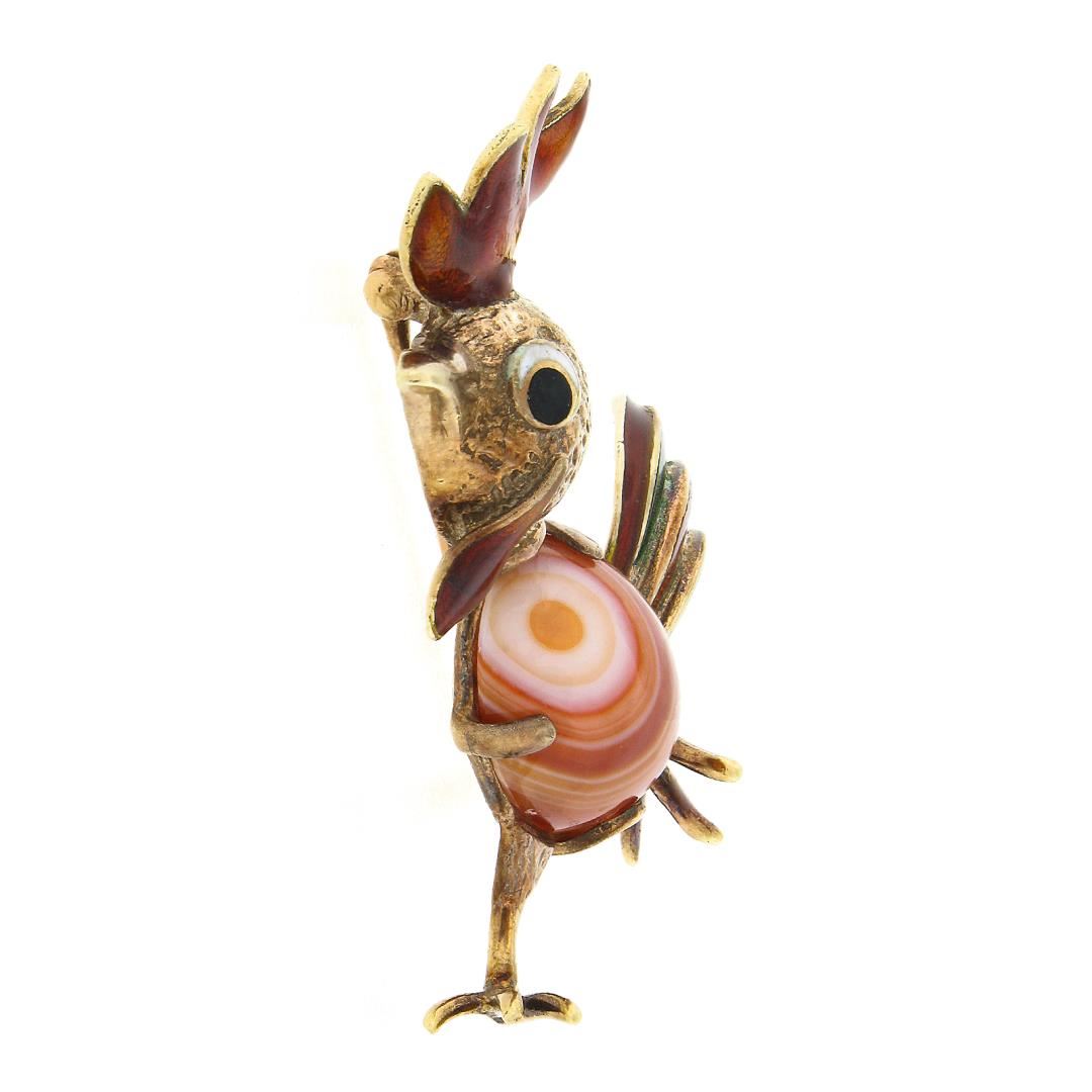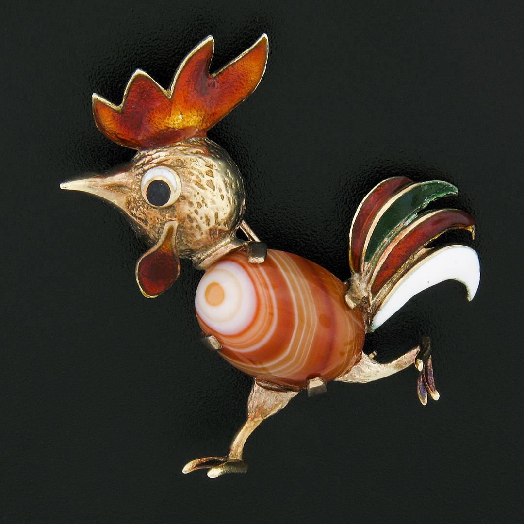 A vintage solid 14k yellow gold rooster brooch, with enamel work & 1 oval cabochon cut natural banded agate ( 17.3x12.8mm). Measures 41x37.50mm and weighs a total of 9.73 grams.