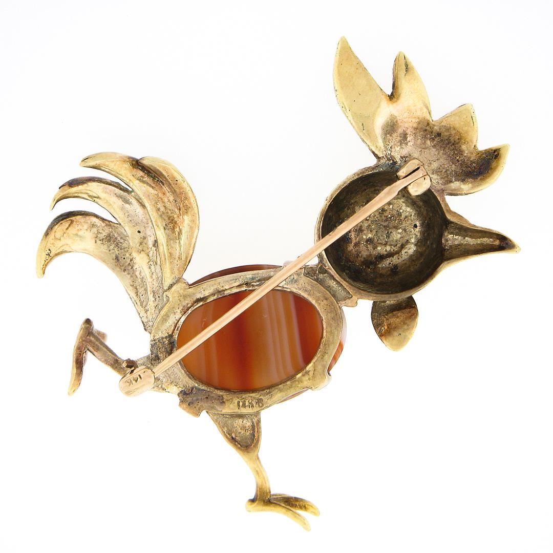 A vintage solid 14k yellow gold rooster brooch, with enamel work & 1 oval cabochon cut natural banded agate ( 17.3x12.8mm). Measures 41x37.50mm and weighs a total of 9.73 grams.