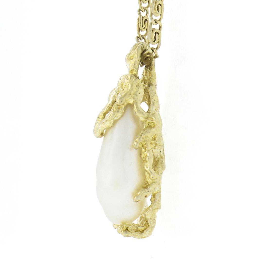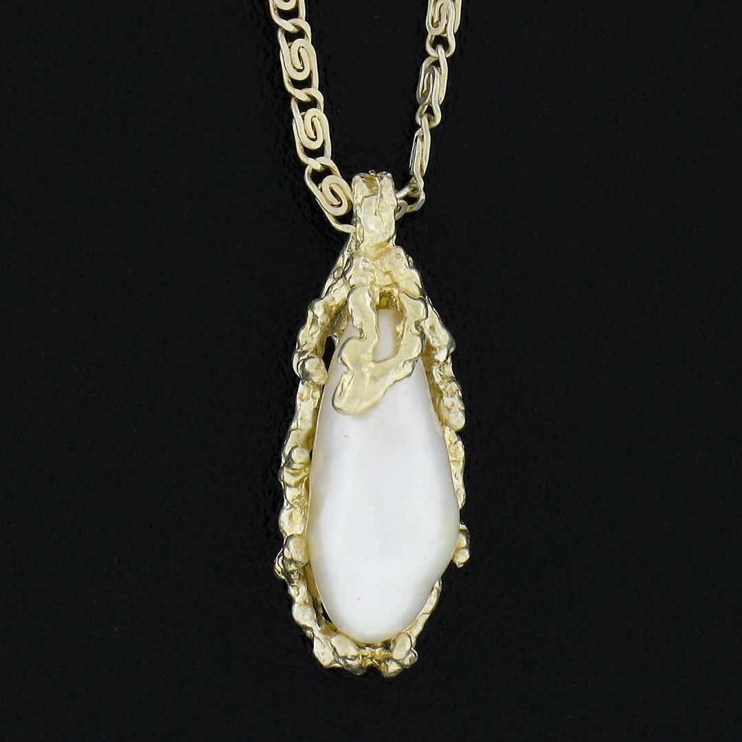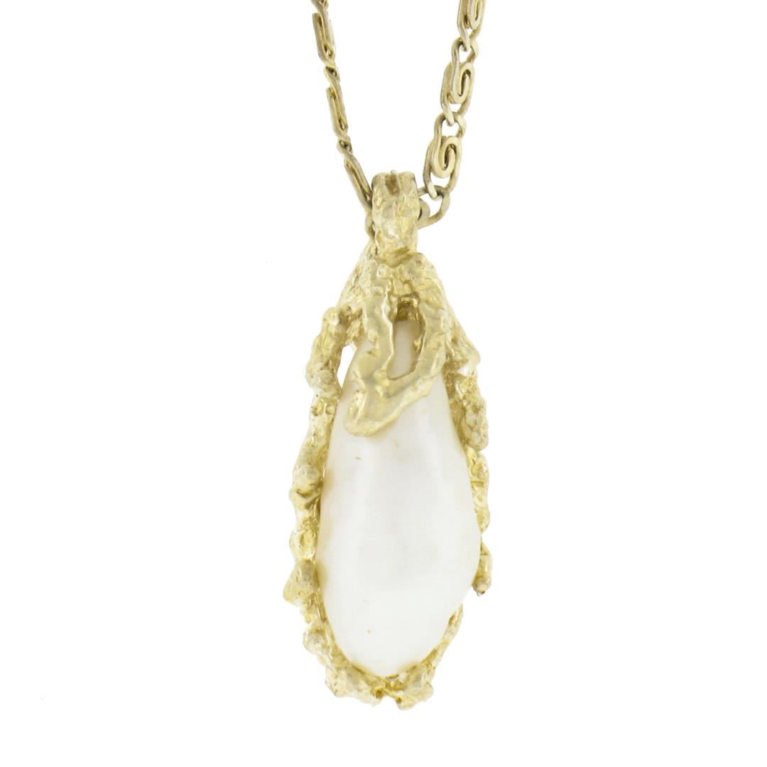 A vintage solid 14k yellow gold pendant necklace, with 1 baroque shape cultured pearl (12.4x5.6mm). 18 inch flat mariner link chain, 3.71 grams total weight, pendant measures 18.8x7.25mm.