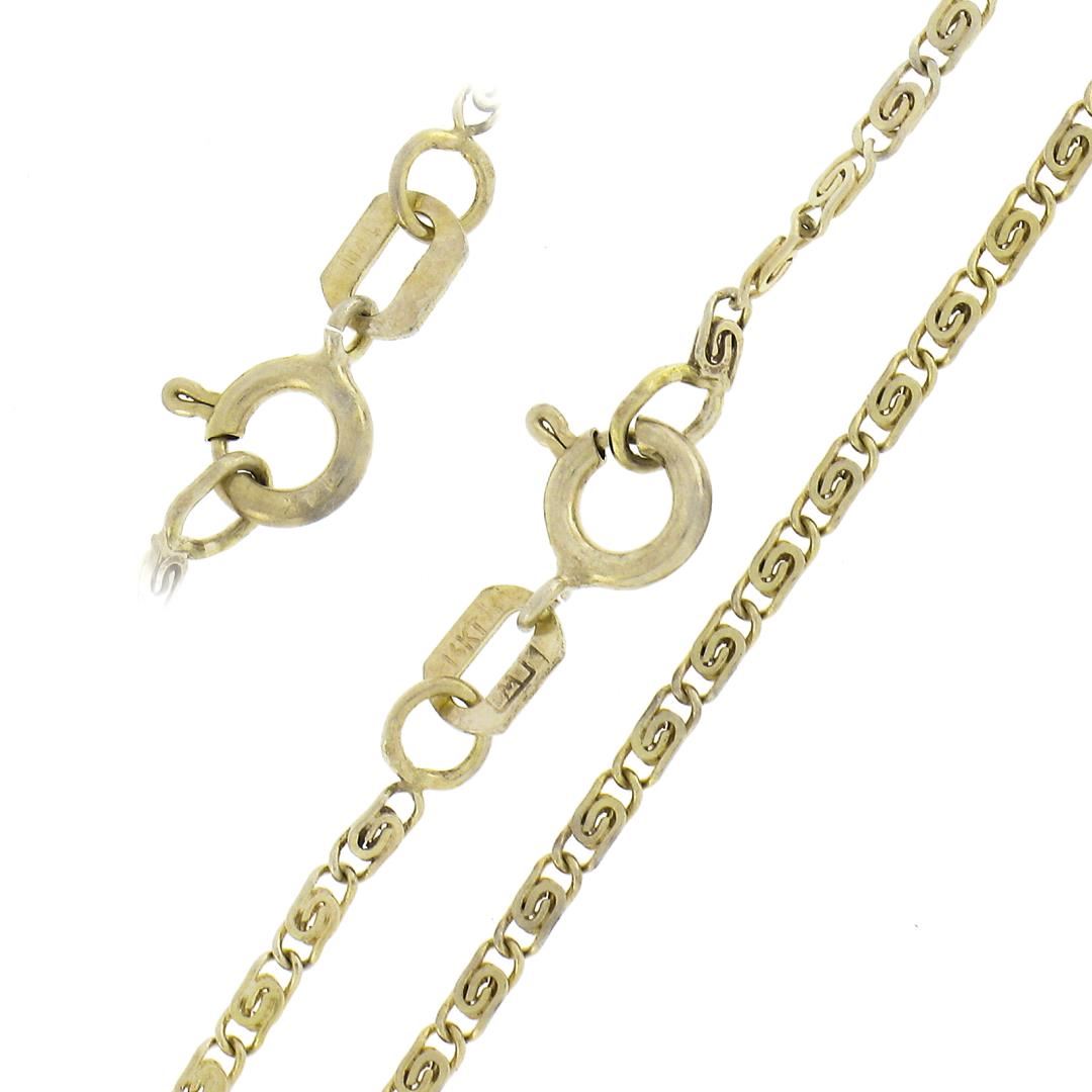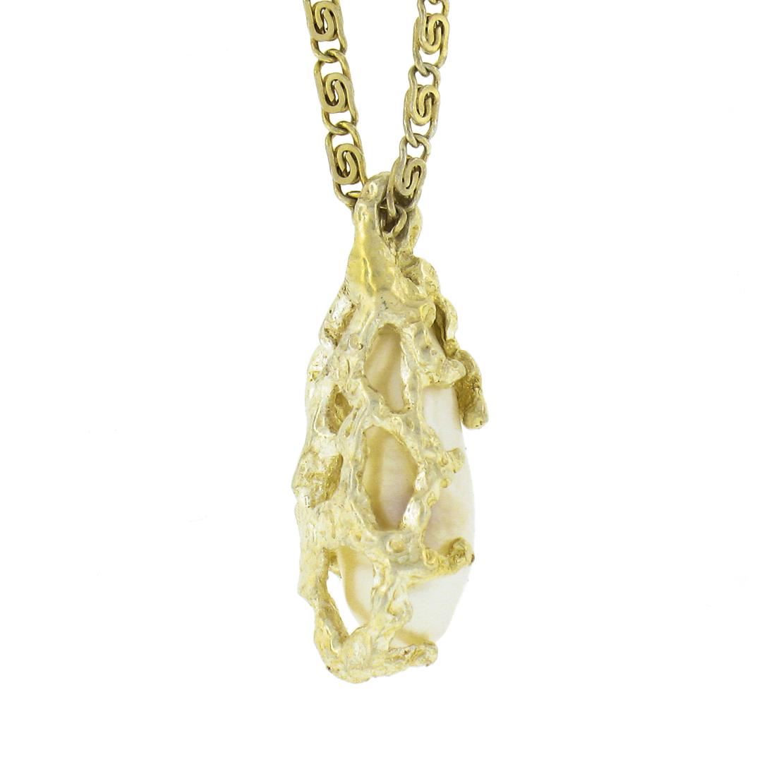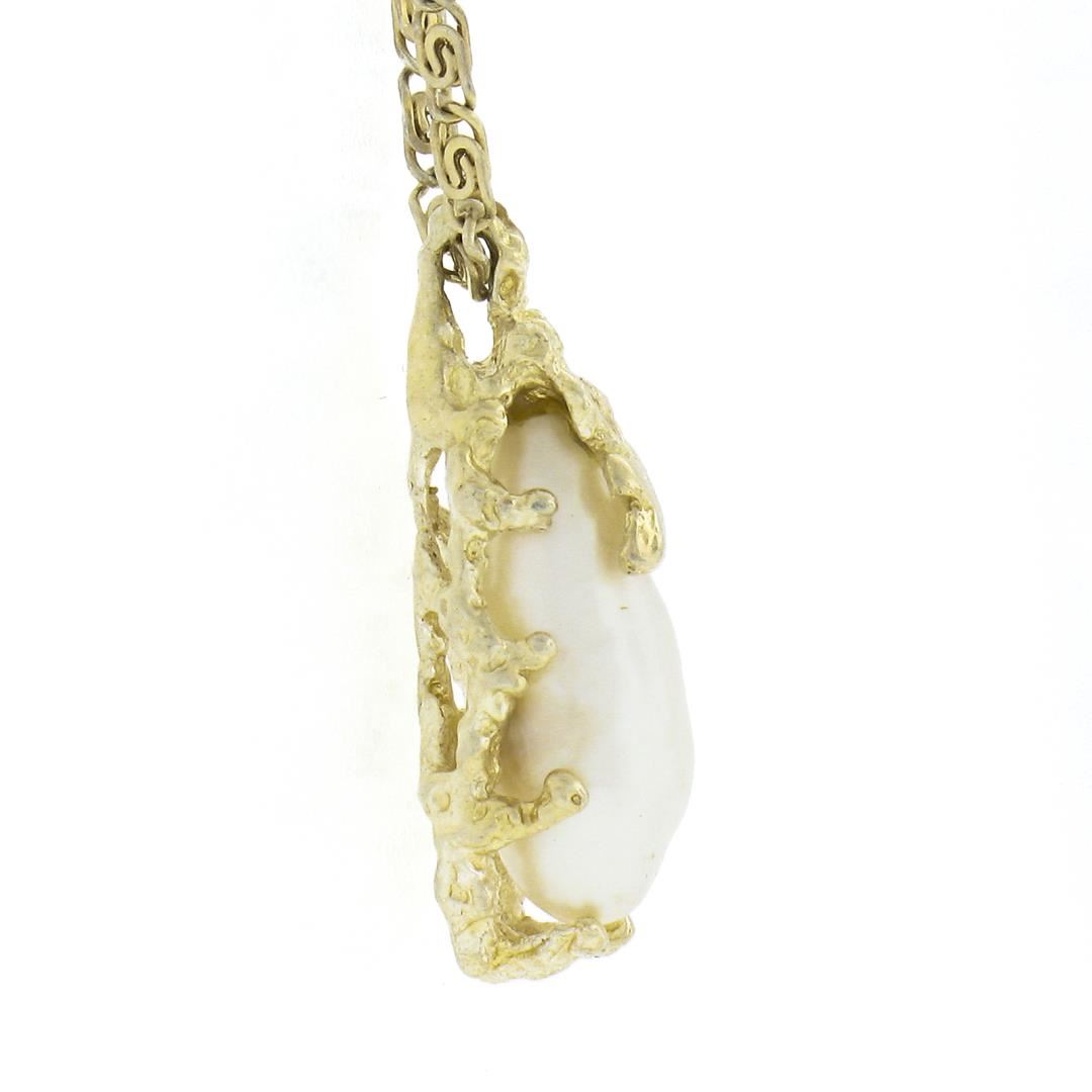 A vintage solid 14k yellow gold pendant necklace, with 1 baroque shape cultured pearl (12.4x5.6mm). 18 inch flat mariner link chain, 3.71 grams total weight, pendant measures 18.8x7.25mm.