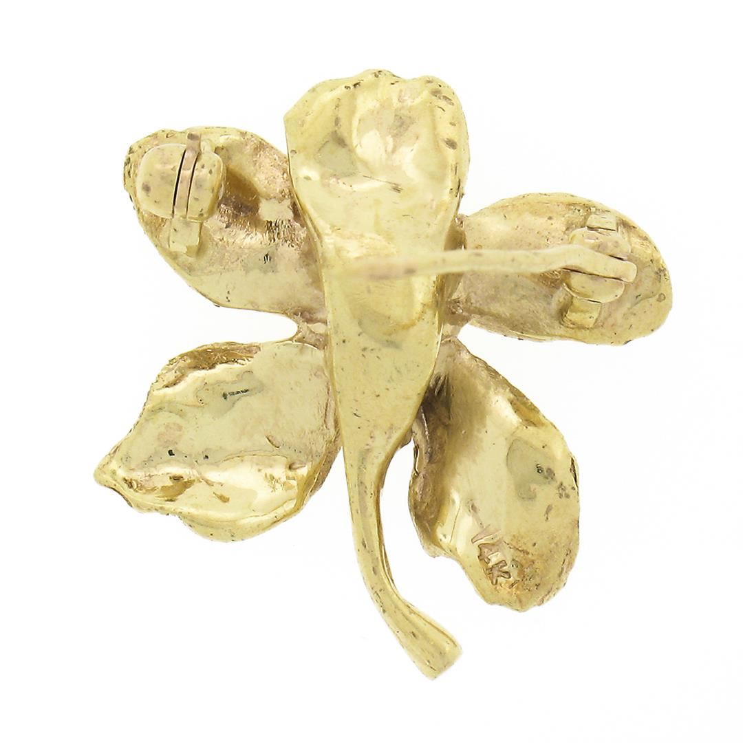 A vintage solid 14k yellow gold pin brooch, with 1 round brilliant cut cubic zirconia (3.1mm). Measures 22.50x21.50mm and weighs a total of 4.45 grams.