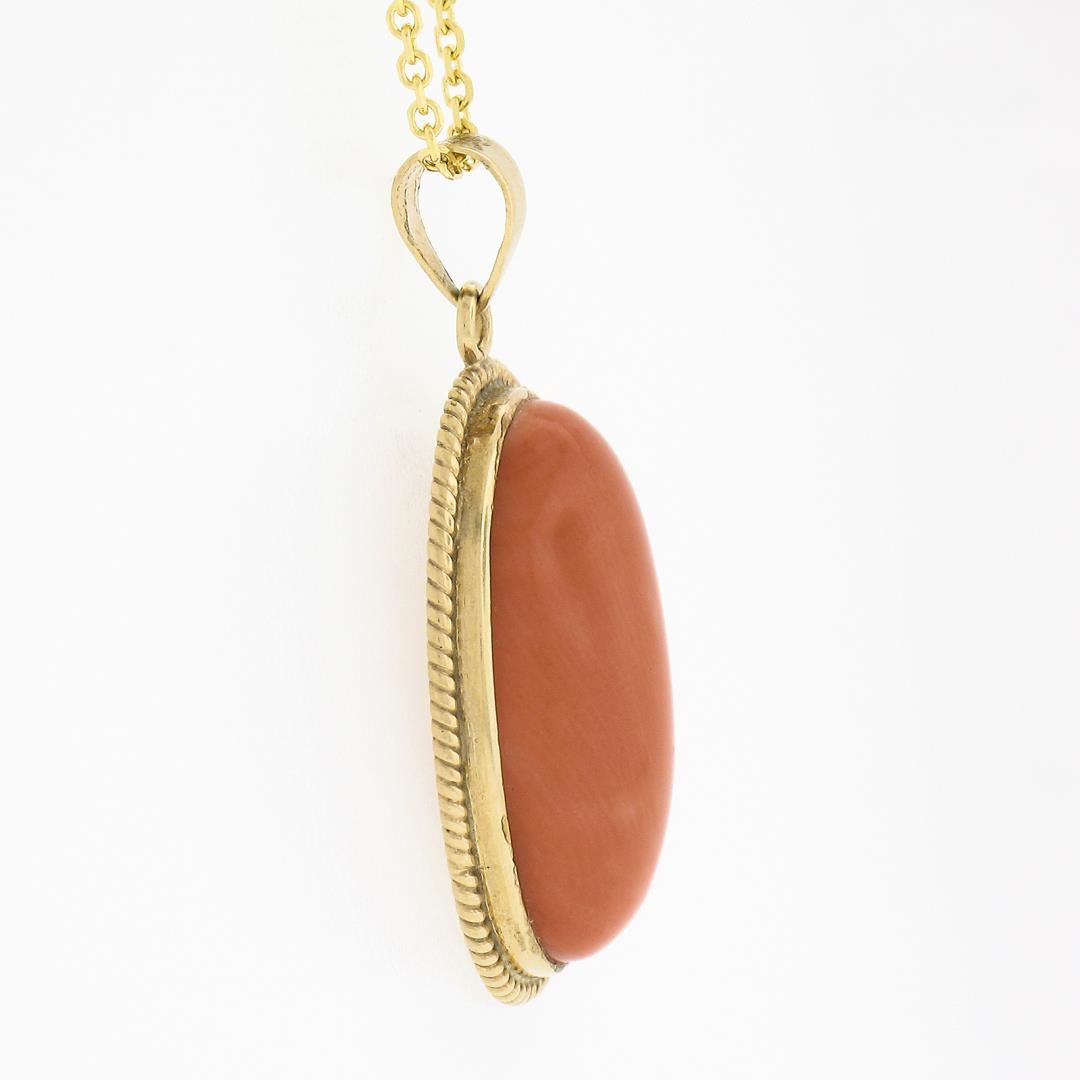 A vintage solid 14k yellow gold pendant necklace, with 1 oval cabochon cut natural coral (18.5x12.2mm). Adjustable 16 or 18 inch cable link chain, 4.79 grams total weight, pendant measures 28.3x15.3mm.