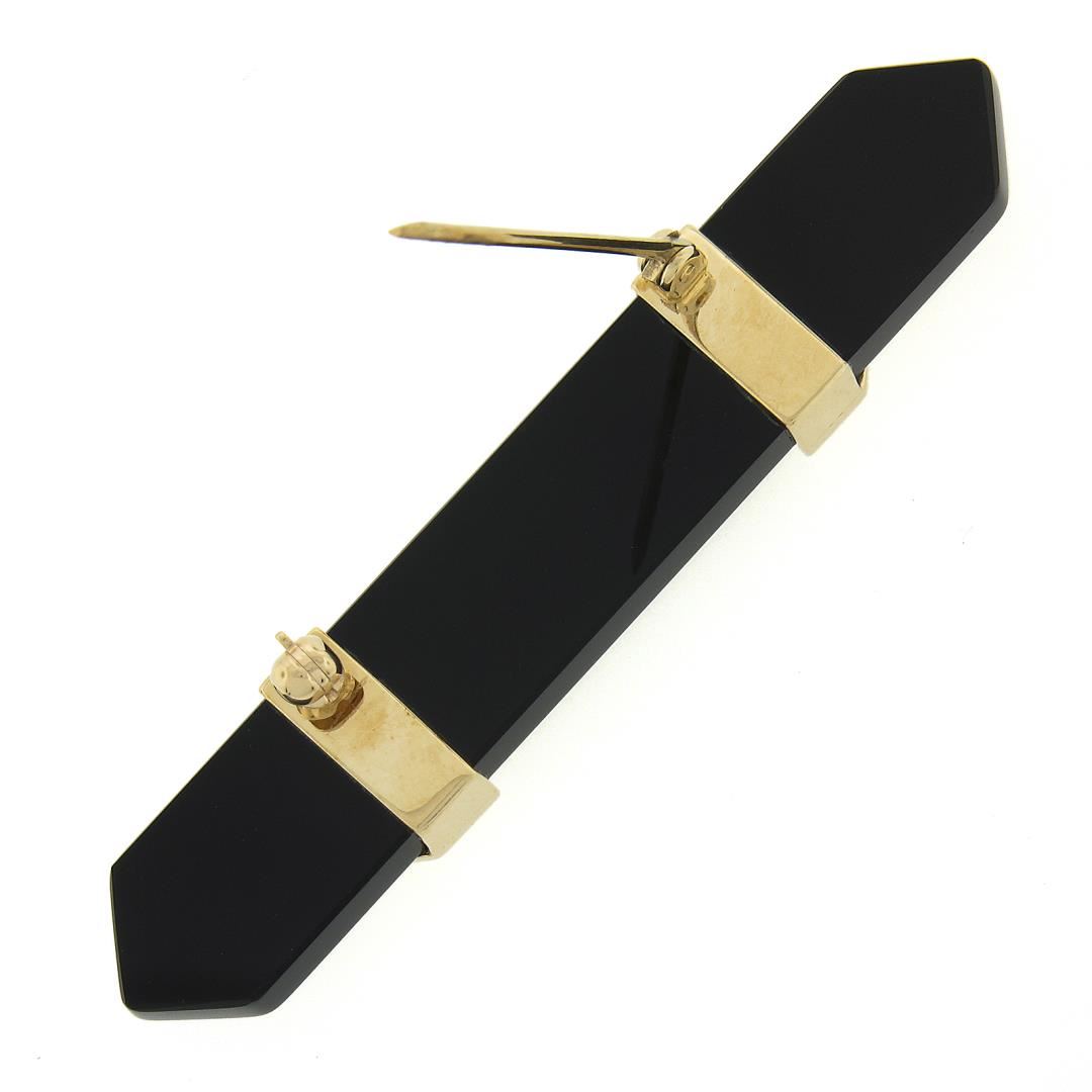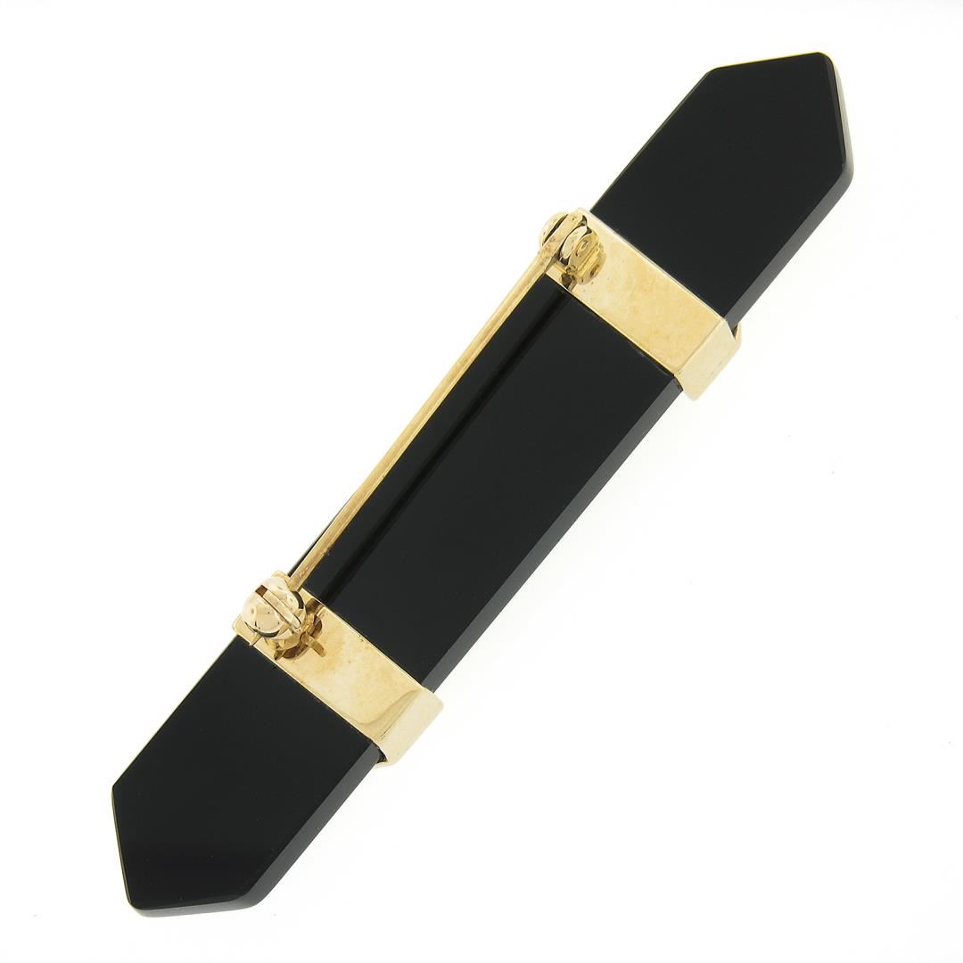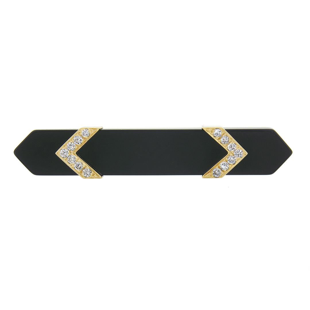 A vintage solid 14k yellow gold bar brooch, with 1 custom cut natural black onyx (59.7x10mm), and 14 round cut natural diamonds (G/H - VS2-SI2 ; 0.42ctw ). Measures 11x59.7mm and weighs a total of 7.38 grams.
