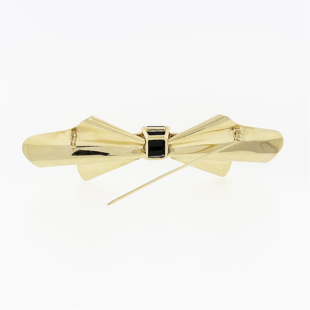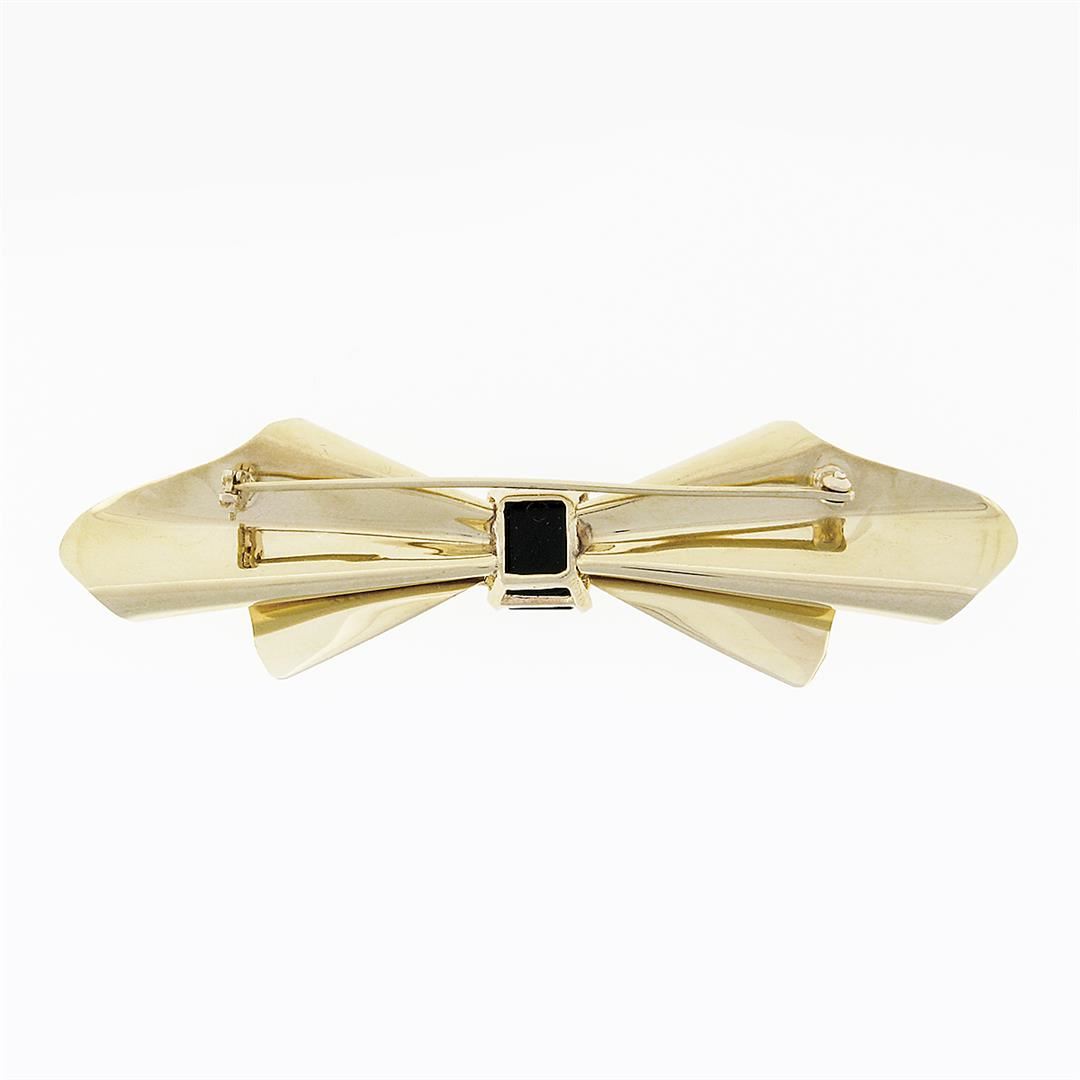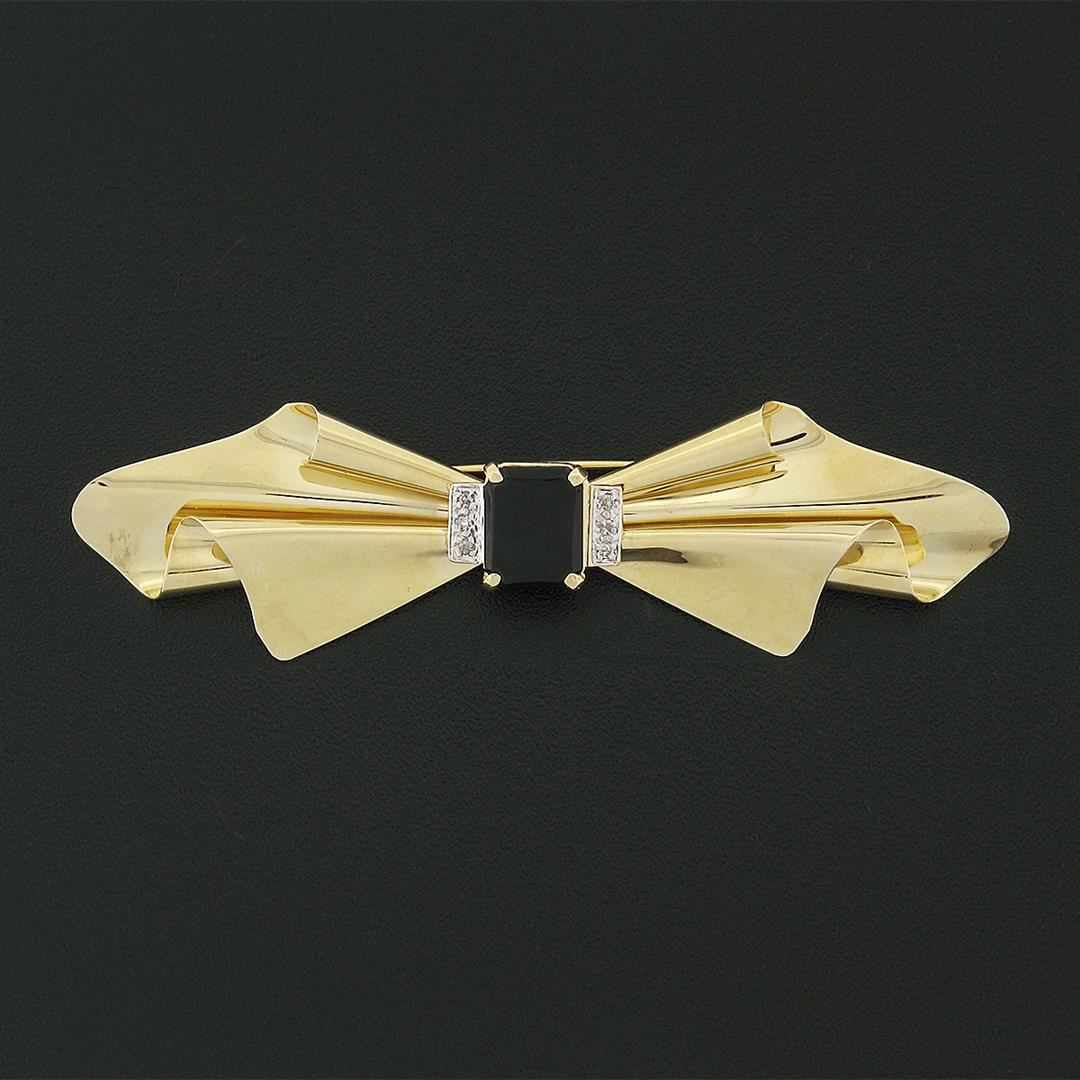 A vintage solid 14k yellow gold ribbon pin brooch, with 1 rectangular brooch cut natural black onyx (10.1x81mm), and 6 old single cut natural diamonds (G/H - SI2 ; 0.06ctw). Measures 21.2x77.1mm and weighs a total of 7.79 grams.