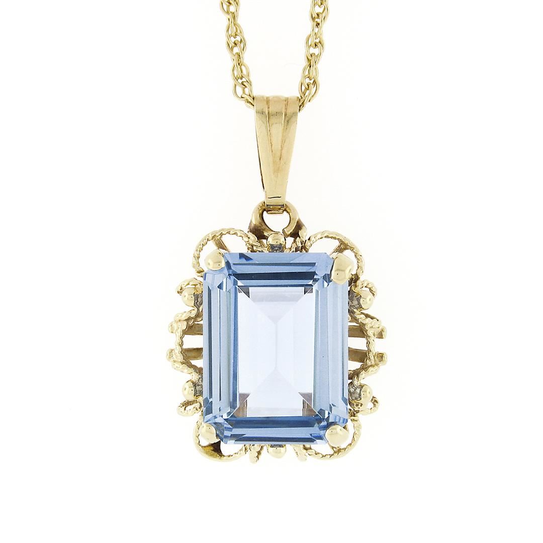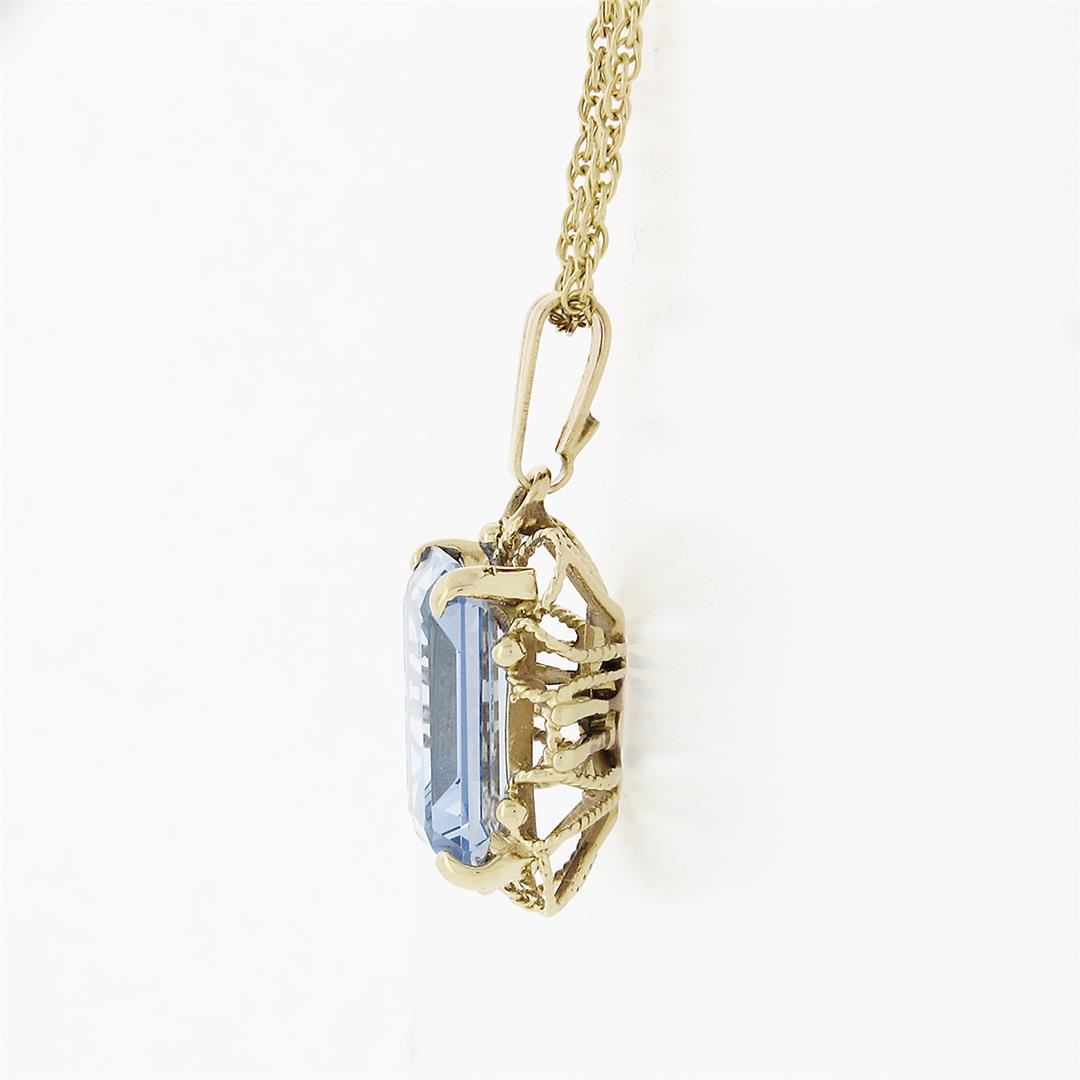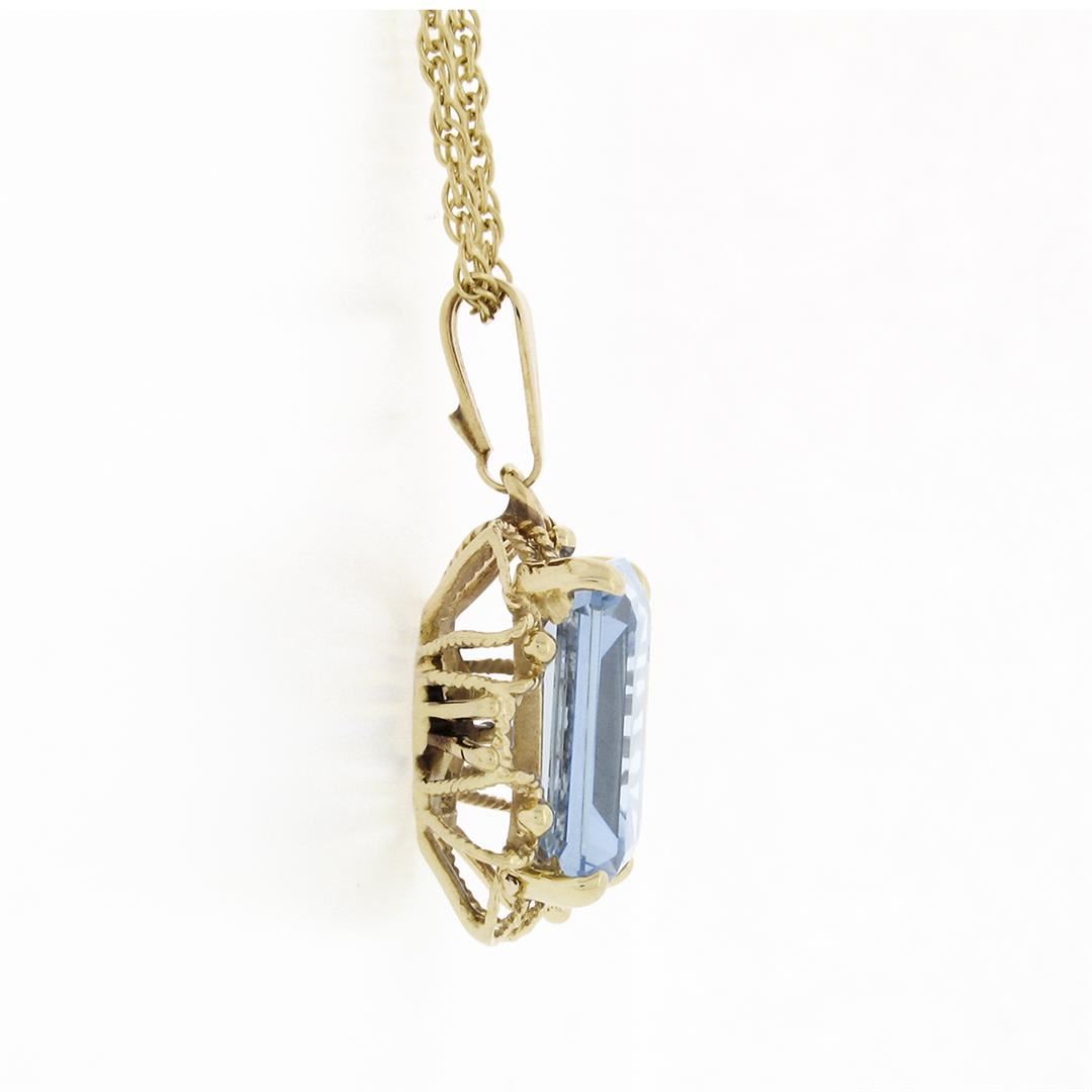 A vintage solid 14k yellow gold solitaire pendant necklace, with 1 rectangular cut blue stone (16.1x12.2mm). 18 inch rope link chain, 9.1 grams total weight, pendant measures 31.6x19mm.
