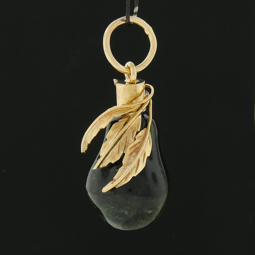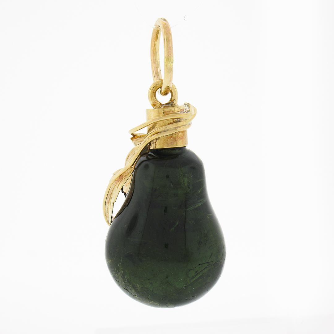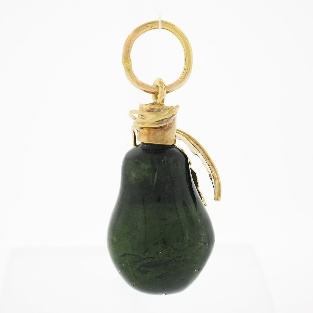A vintage solid 14k yellow gold pendant, with 1 bulb shape natural green tourmaline (18.3x13.5mm). The pendant weighs a total of 5.79 grams, measures 32x13.50mm including the bail, and the inside of the bail measures 6.2mm.