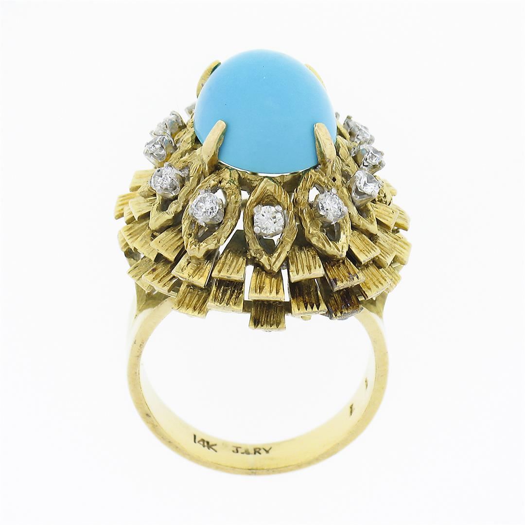 A vintage solid 14k yellow gold ring, with 1 oval cabochon cut natural turquoise (14.0x10.10mm), and 12 round brilliant cut natural diamonds (G/H - VS2/SI1 ; 0.36ctw). The ring is size 6.0, weighs a total of 11.39 grams, and measures 24.20mm wide.