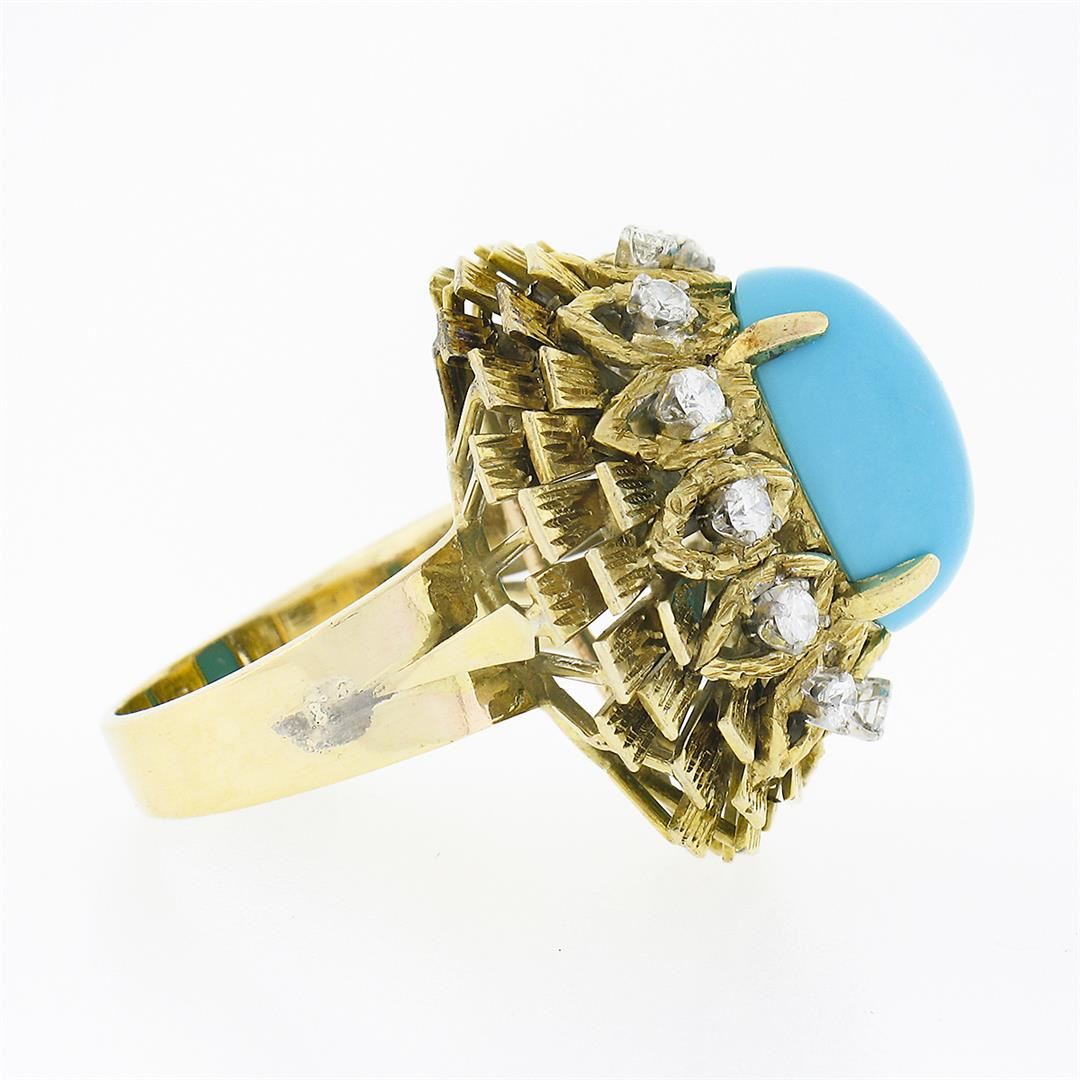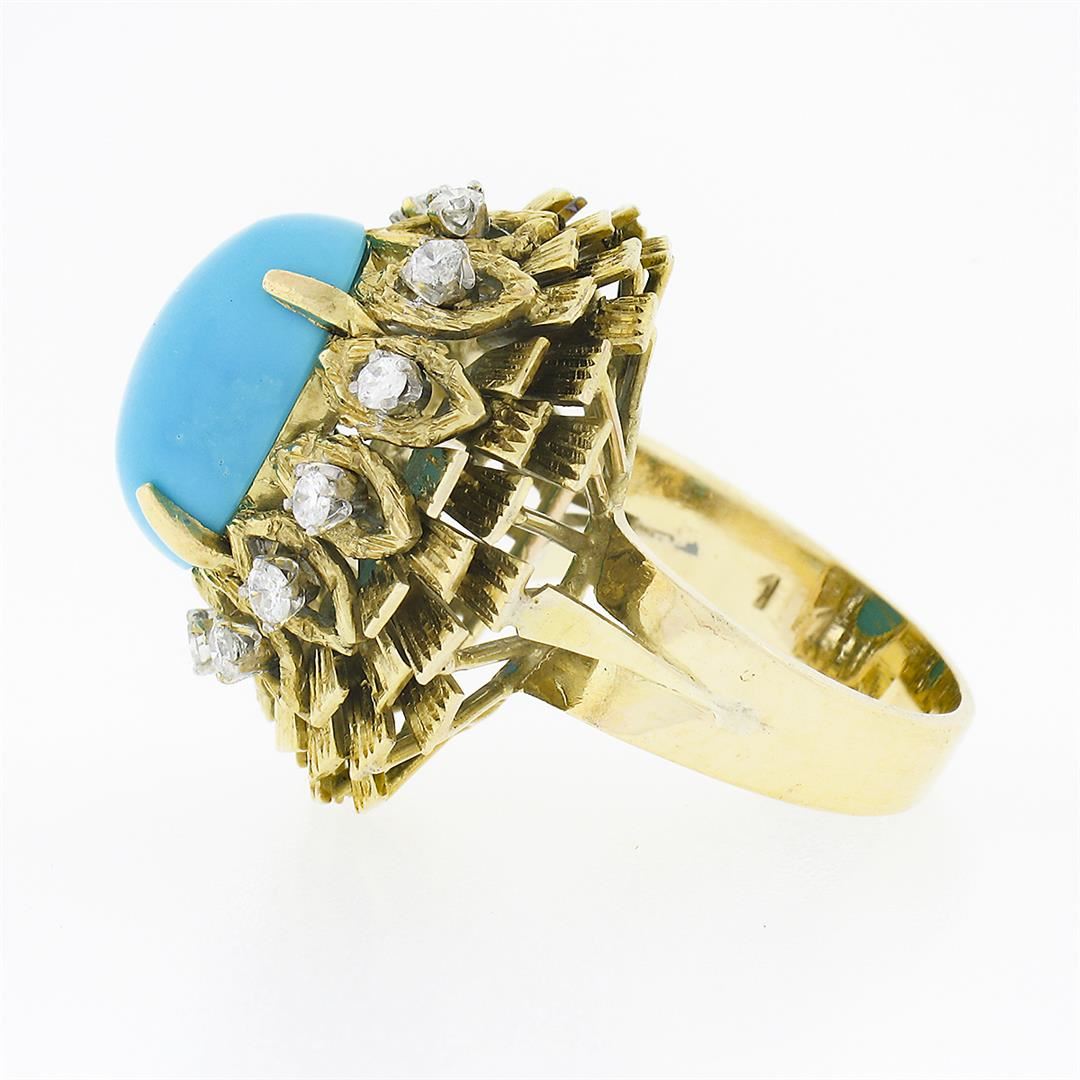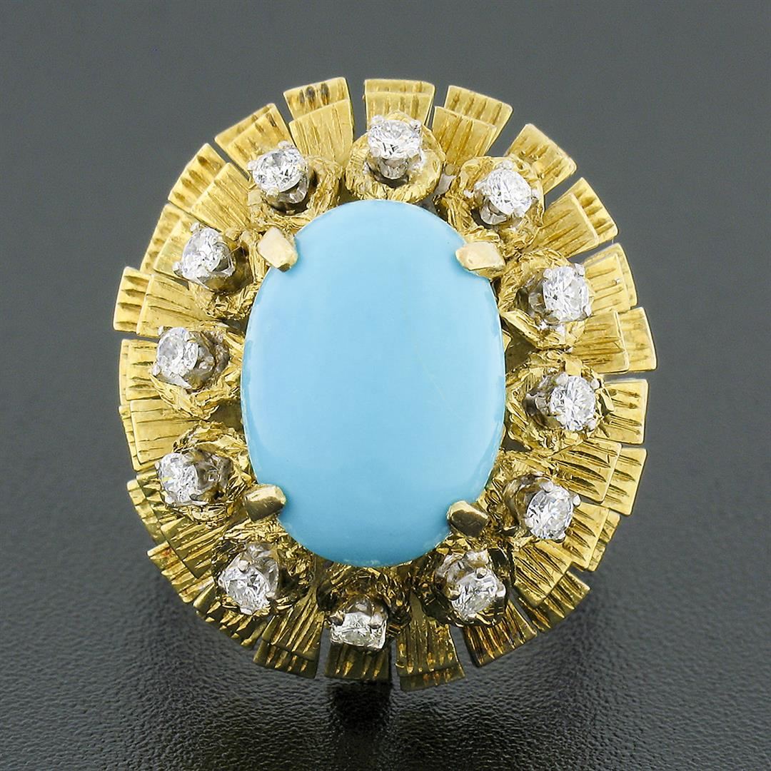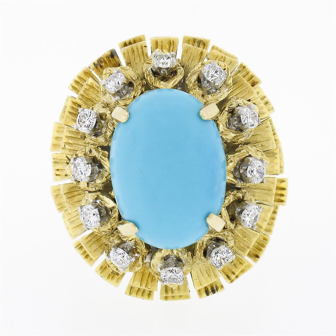 A vintage solid 14k yellow gold ring, with 1 oval cabochon cut natural turquoise (14.0x10.10mm), and 12 round brilliant cut natural diamonds (G/H - VS2/SI1 ; 0.36ctw). The ring is size 6.0, weighs a total of 11.39 grams, and measures 24.20mm wide.