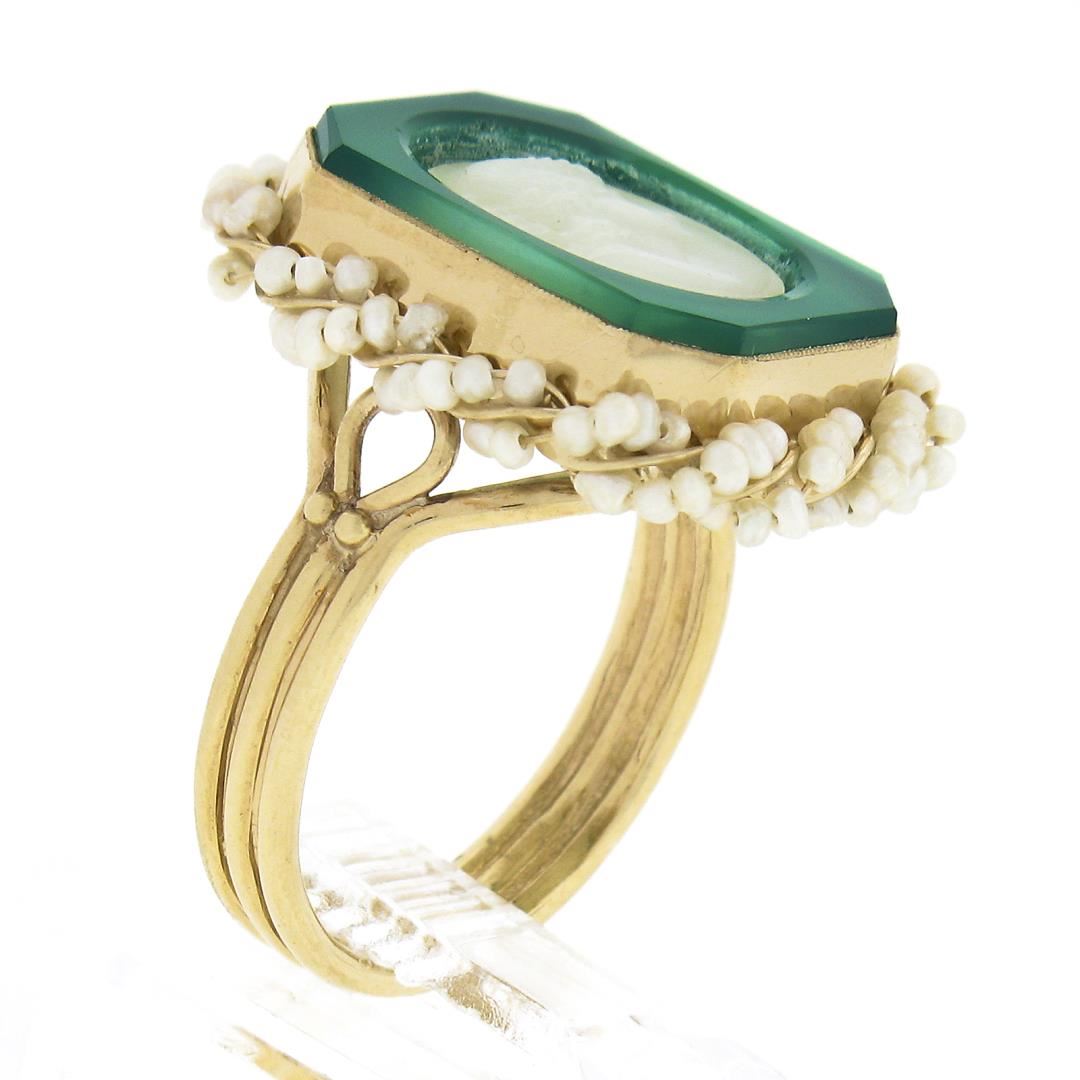 A vintage solid 14k yellow gold ring, with 1 rectangular cut natural chrusoprase (16x11.9mm), 1 oval shape carved mother of pearl cameo (11.5x8.9mm ), and numerous of round shape cultured seed pearls. The ring is size 7.0, weighs a total of 5.65 grams, and measures 21.8mm wide.