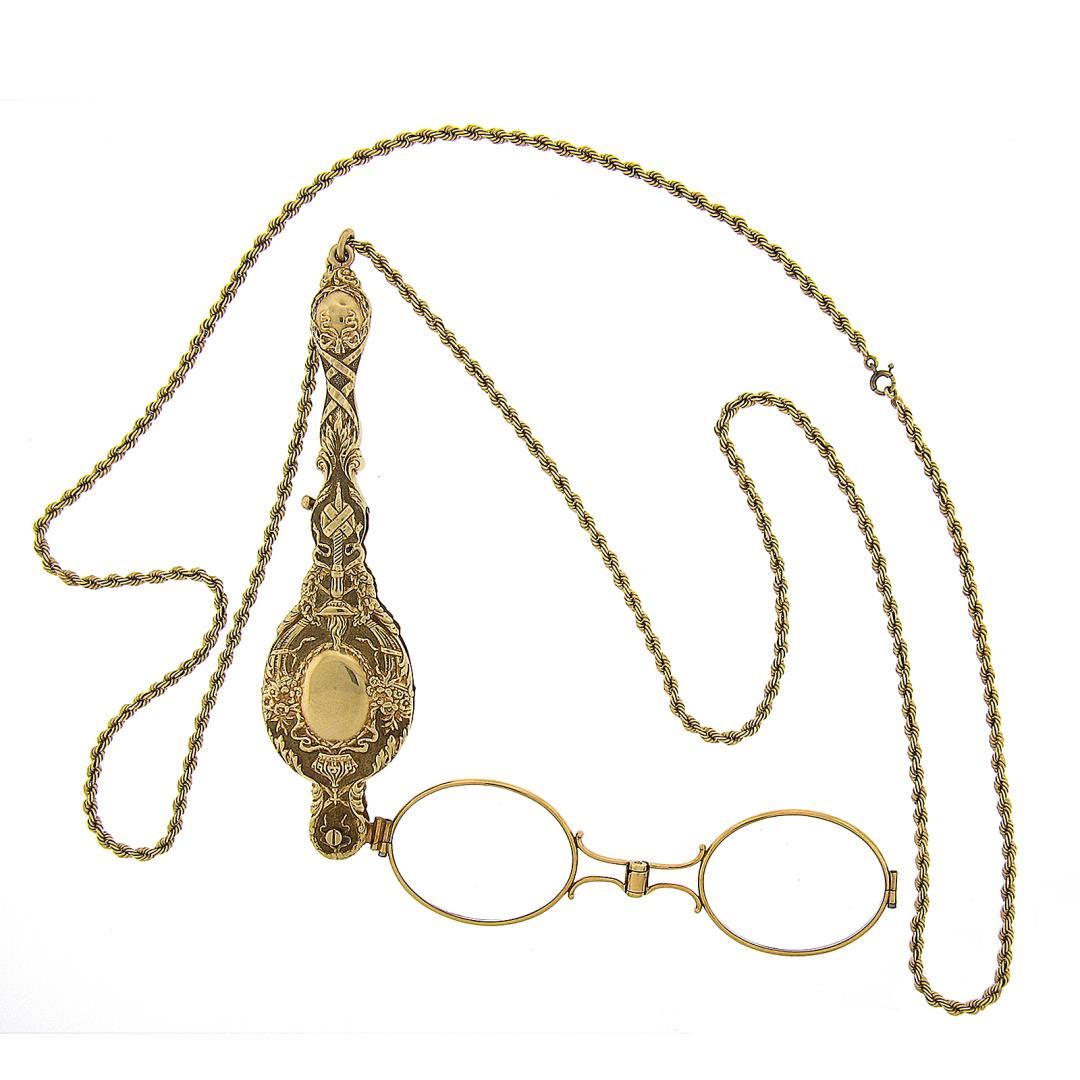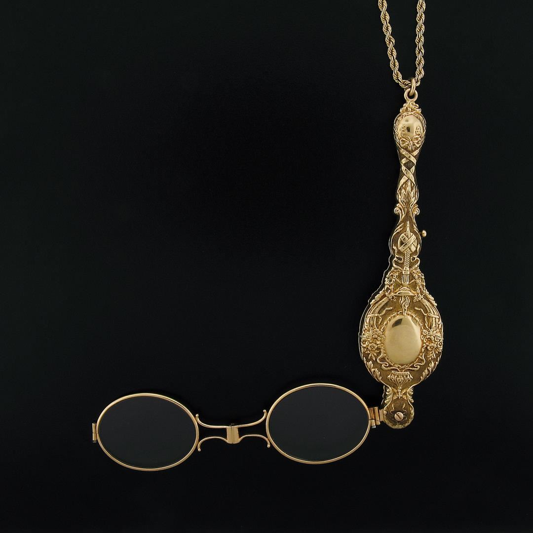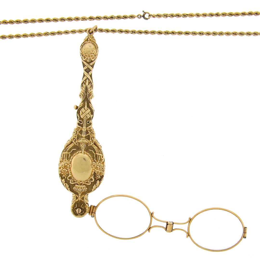 A vintage solid 14k yellow gold lorgnette opera glasses chain necklace. 35 inch rope link chain, 56.16 grams total weight, Lorgnette measures 114.3x28.4mm.