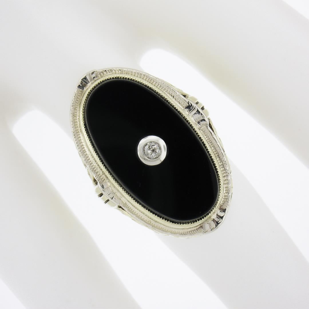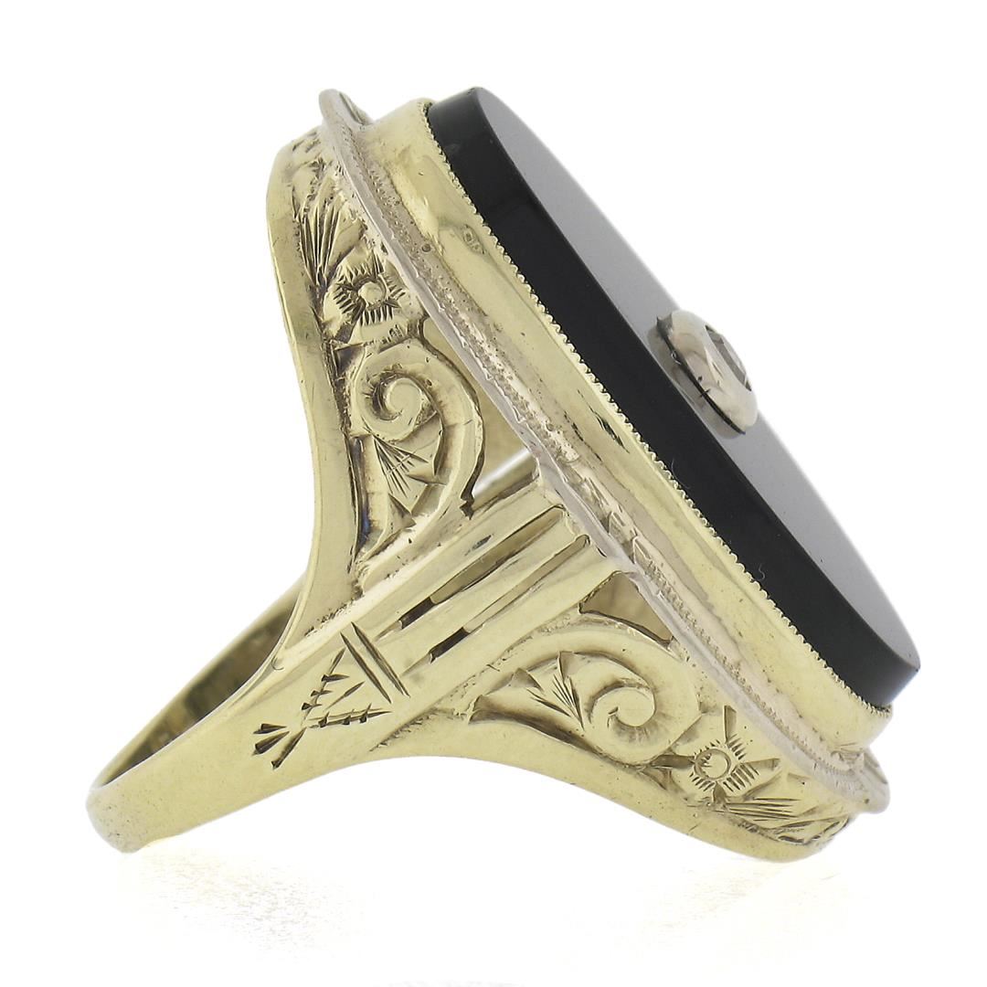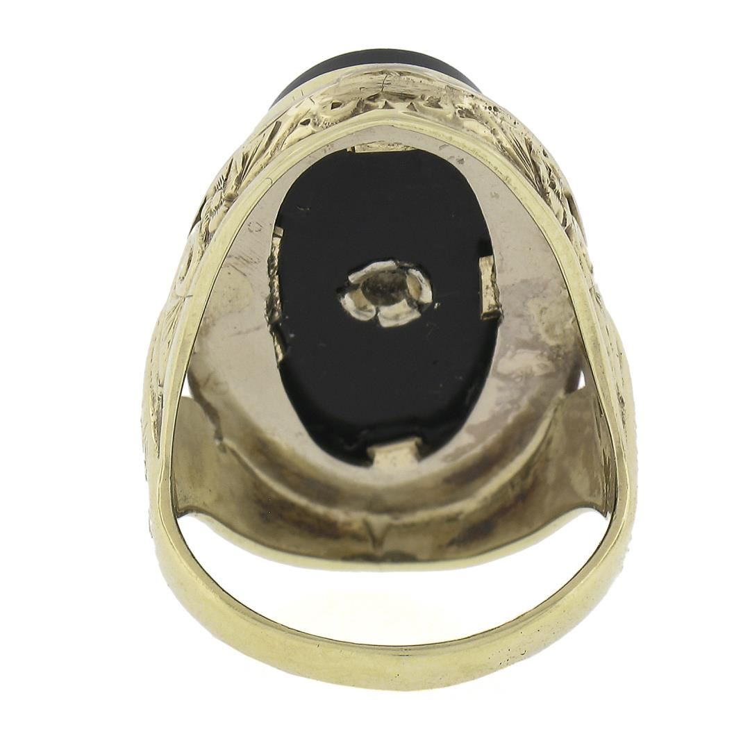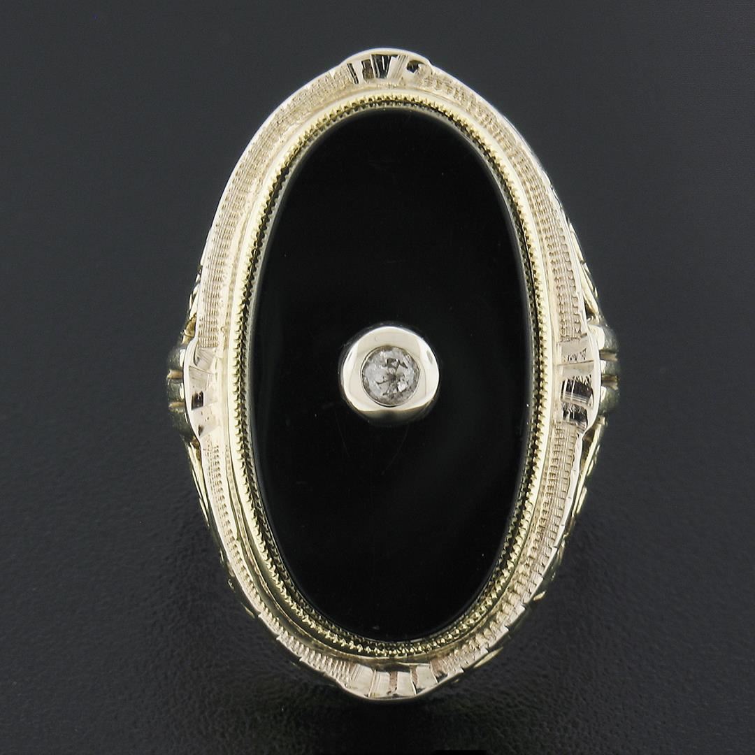 A vintage solid 14k yellow and white gold ring, with 1 oval cut natural black onyx (21.8x11.7mm), and 1 old single cut natural diamond (0.03ct). The ring is size 6.0, weighs a total of 7.17 grams, and measures 26.4mm wide.