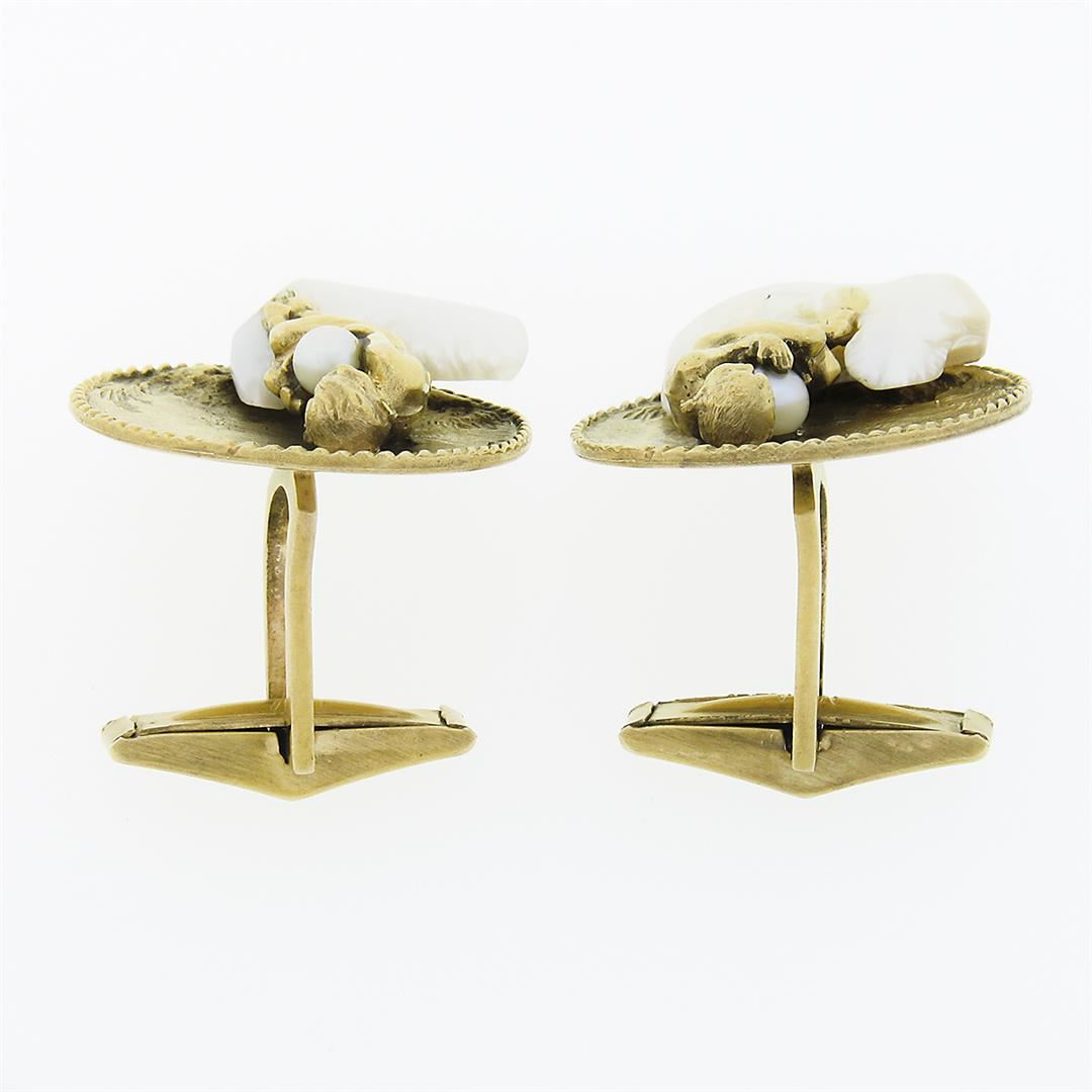 A vintage solid 14k yellow gold tie tack & cufflinks set, with 3 round shape cultured pearls ( (2) 3.85mm & (1) 4.3mm), and 3 carved natural freshwater pearls (17.7x10.1mm & 15.85x12.1mm & 13.5x5.25mm). These cuff links have a swivel design with a clearance of 14.1mm, weigh a total of 25.18 grams, and the front panels measure 24.0mm in diameter.