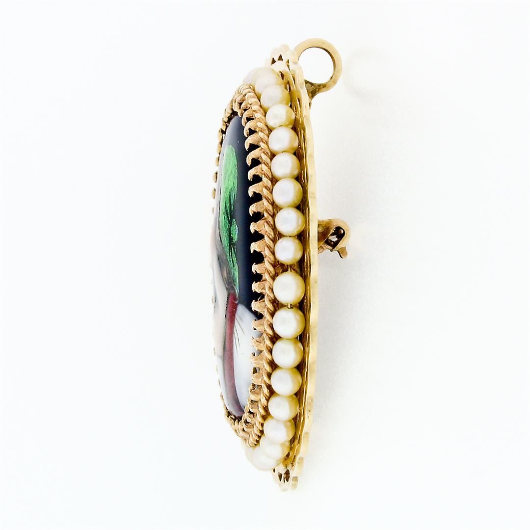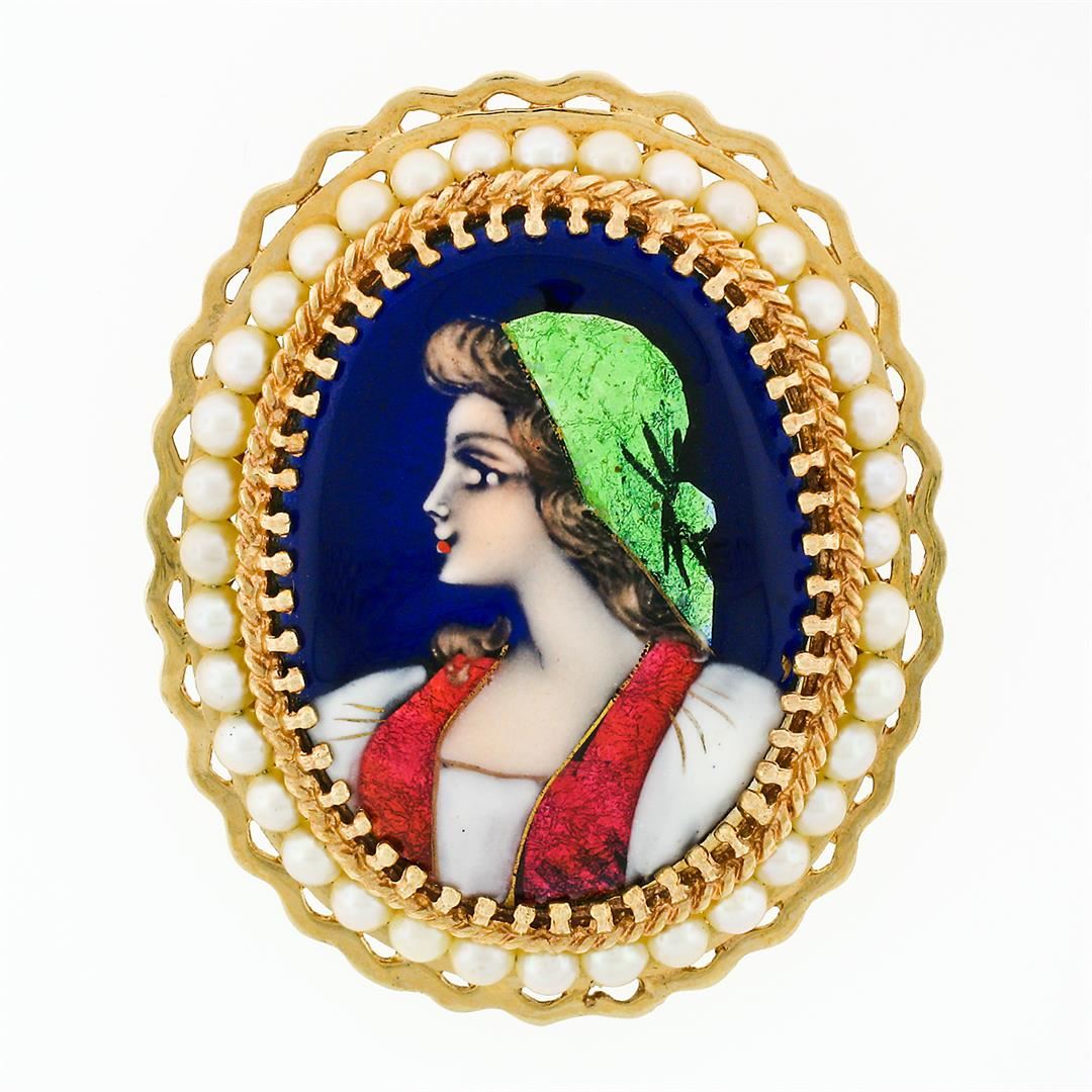 A vintage solid 14k yellow gold brooch or pendant with a hand painted portrait on porcelain surrounded with a halo of 36 round shape cultured pearls (2.5 to 2.9mm). Measures 41.23x33.91mm and weighs a total of 13.03 grams.