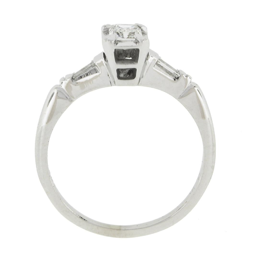 A vintage solid 14k white gold ring, with 1 emerald cut natural diamond (G - VS2 ; 4.48x3.52mm / 0.28ct), and 2 baguette cut natural diamonds (G/H- VS1/VS2 ; 0.04ctw ). The ring is size 6.5, weighs a total of 2.23 grams, and measures 6.5mm wide.