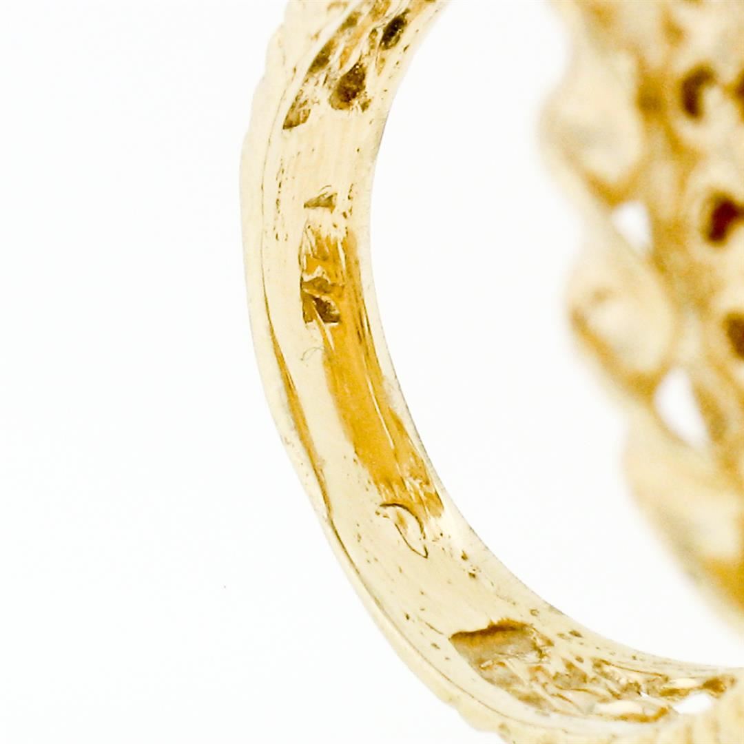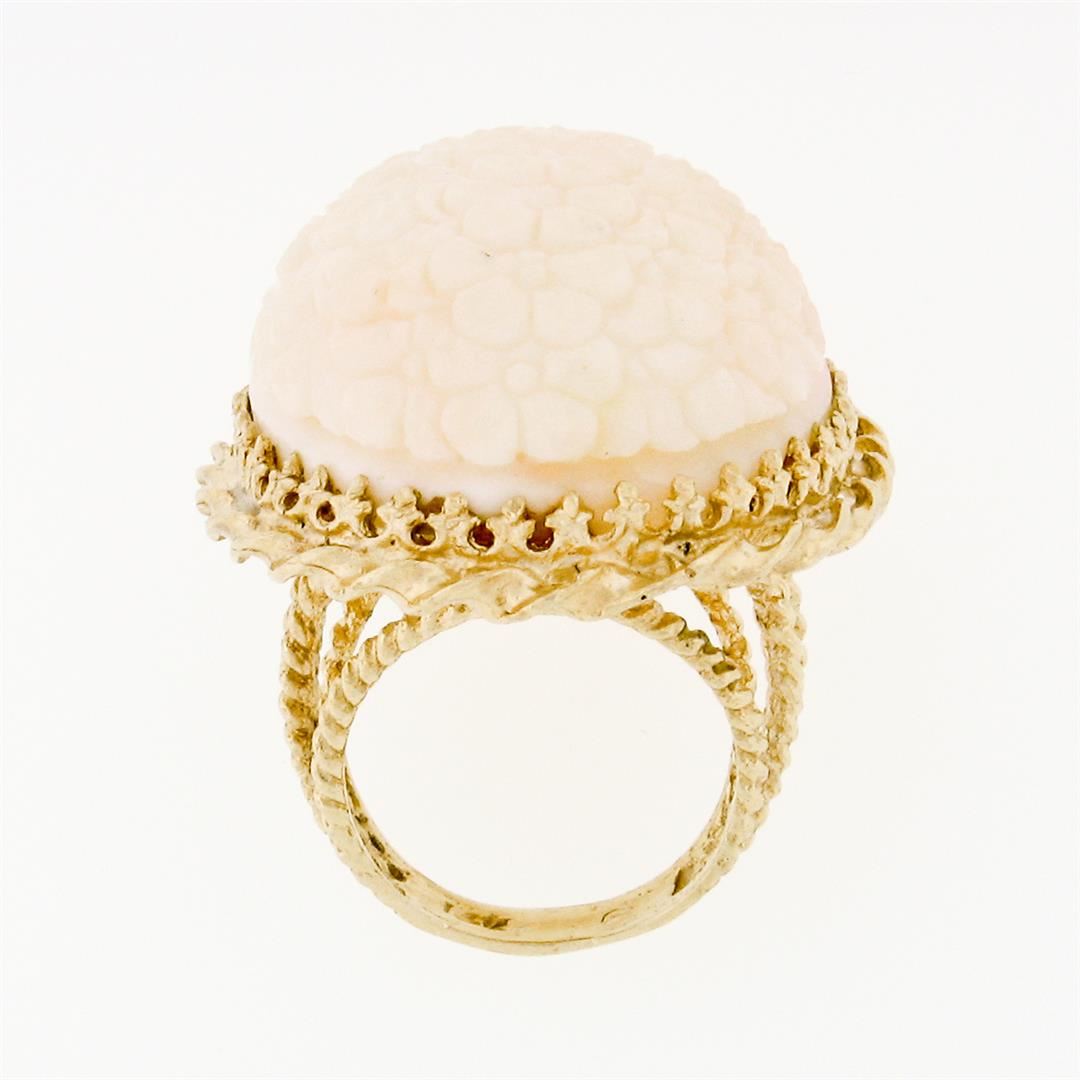 A vintage solid 14k yellow gold ring featuring a large natural angel skin coral (29.12x23.60mm) with a hand carved flower motif. The ring is size 5.5, weighs a total of 20.37 grams, and measures 34.07mm wide.