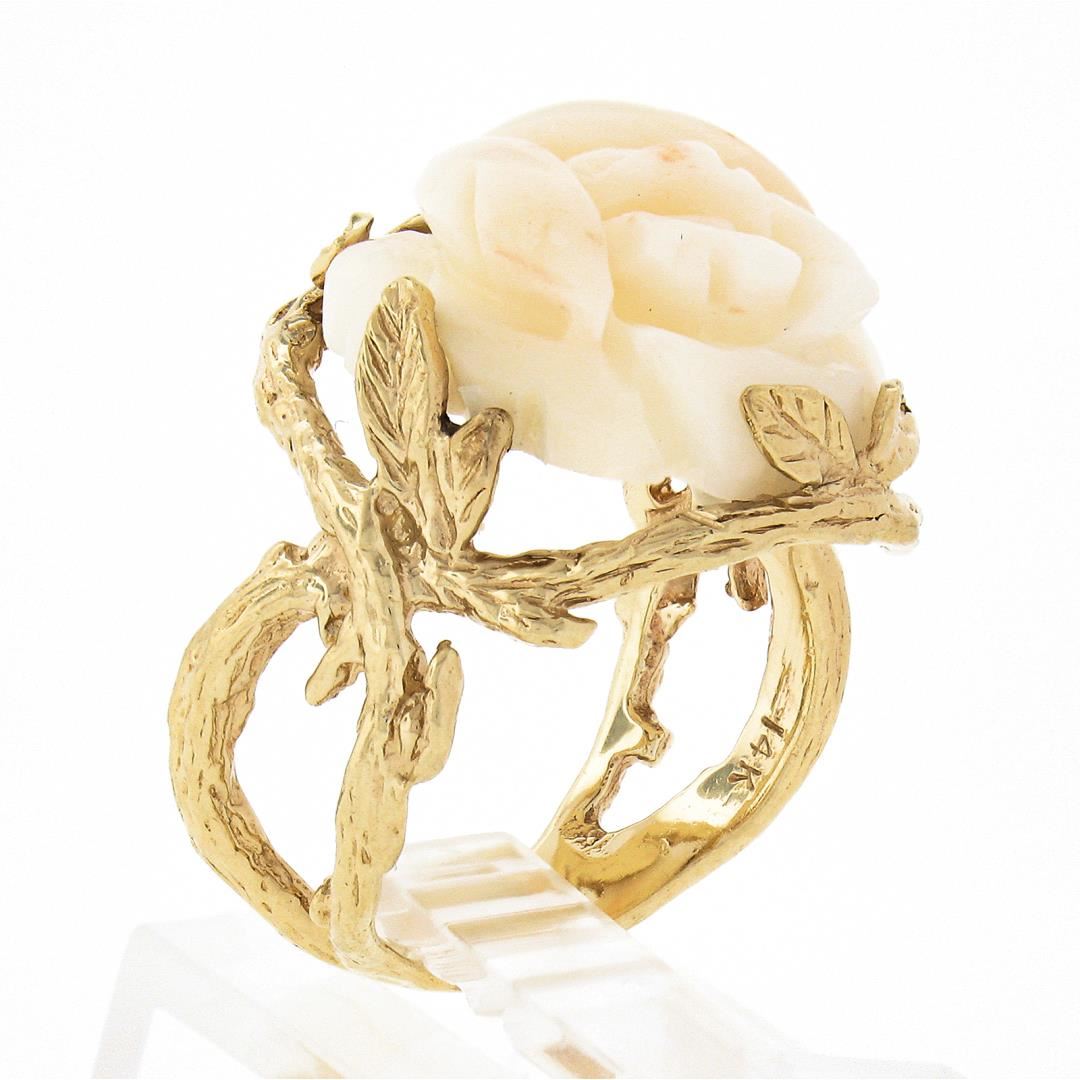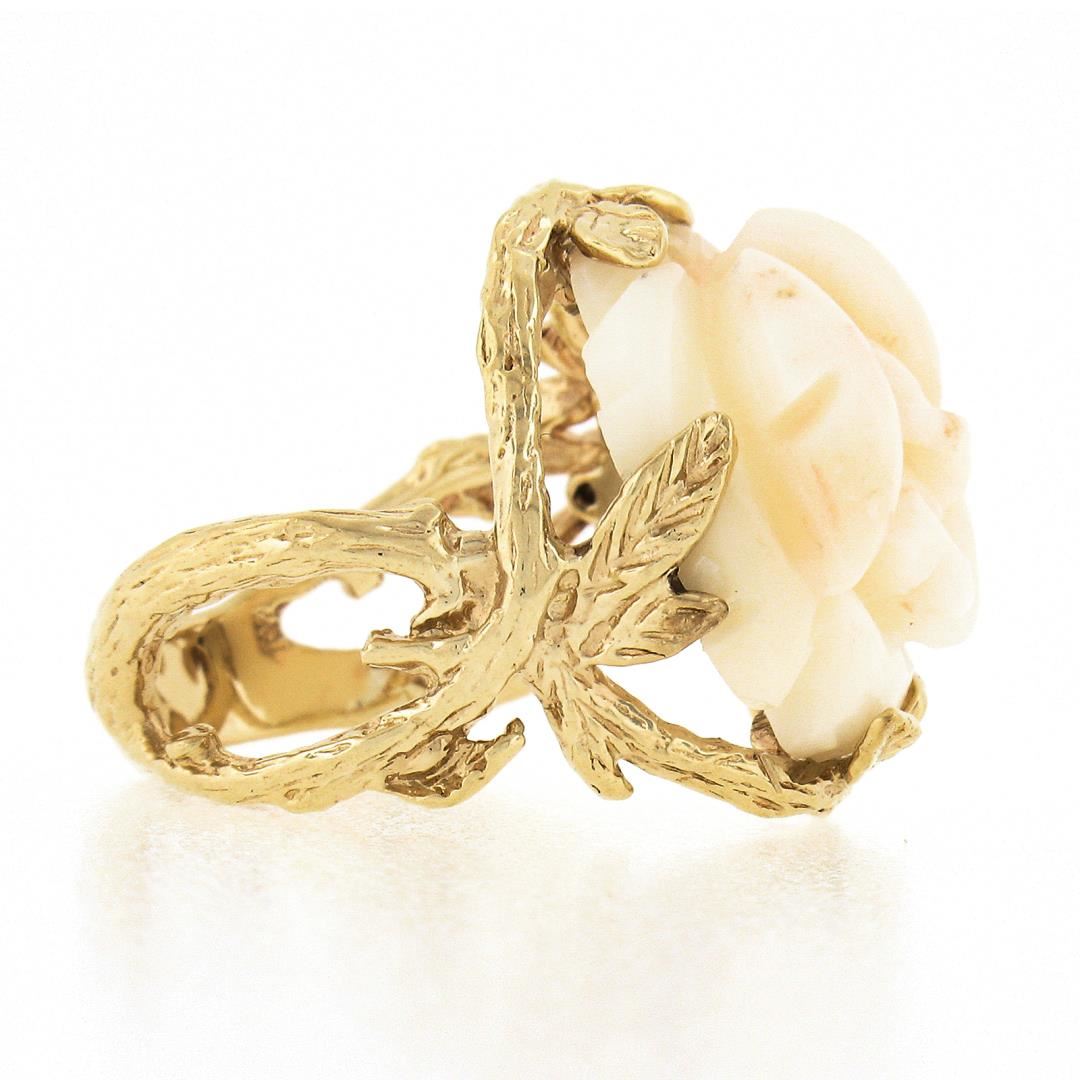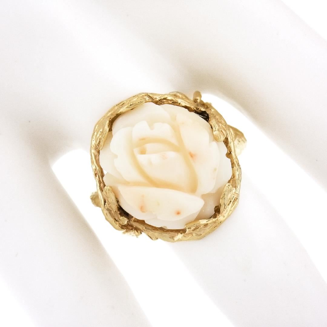 A vintage solid 14k yellow gold ring, with 1 carved rose natural coral (17.3x15.2mm). The ring is size 6.0, weighs a total of 7.95 grams, and measures 20.3mm wide.