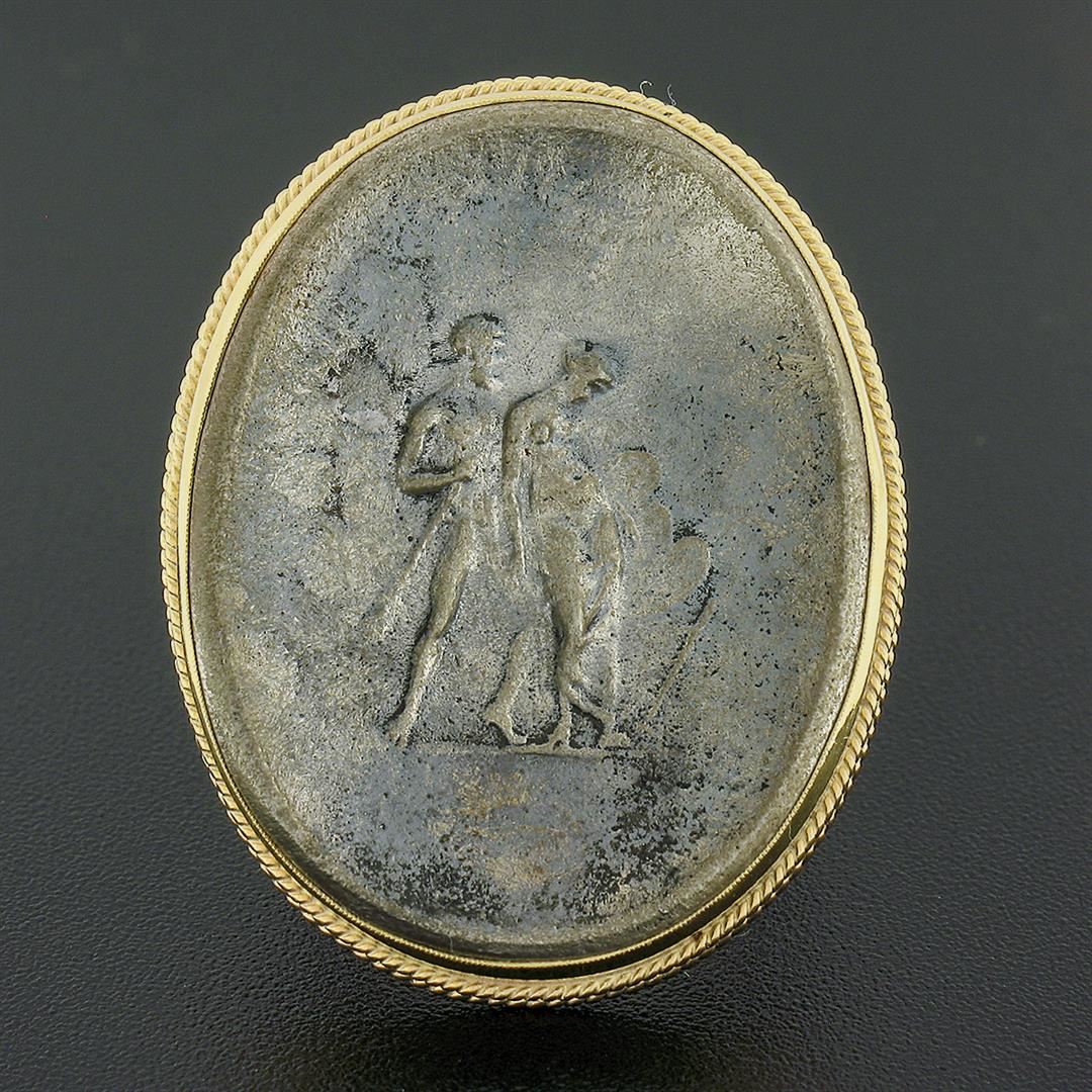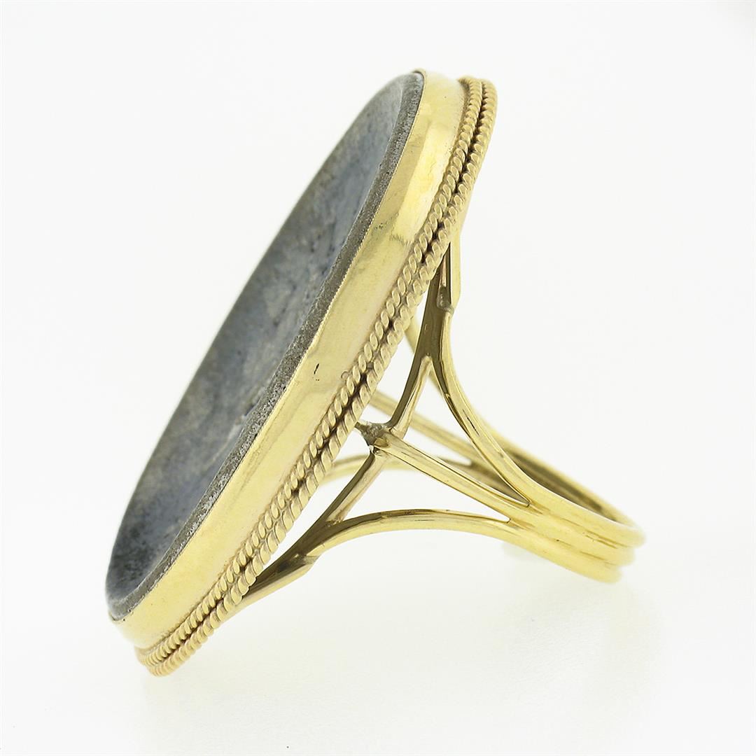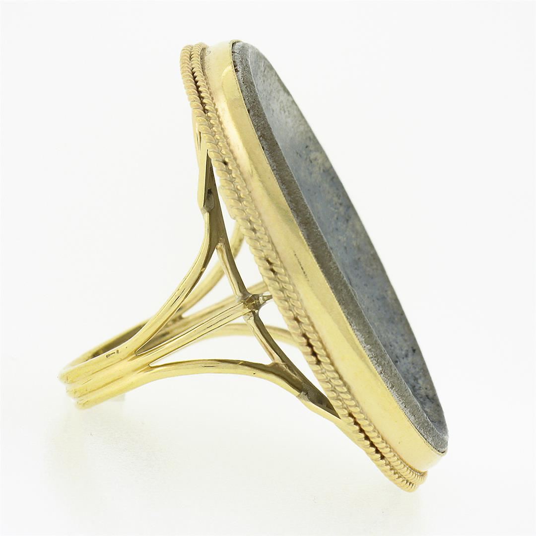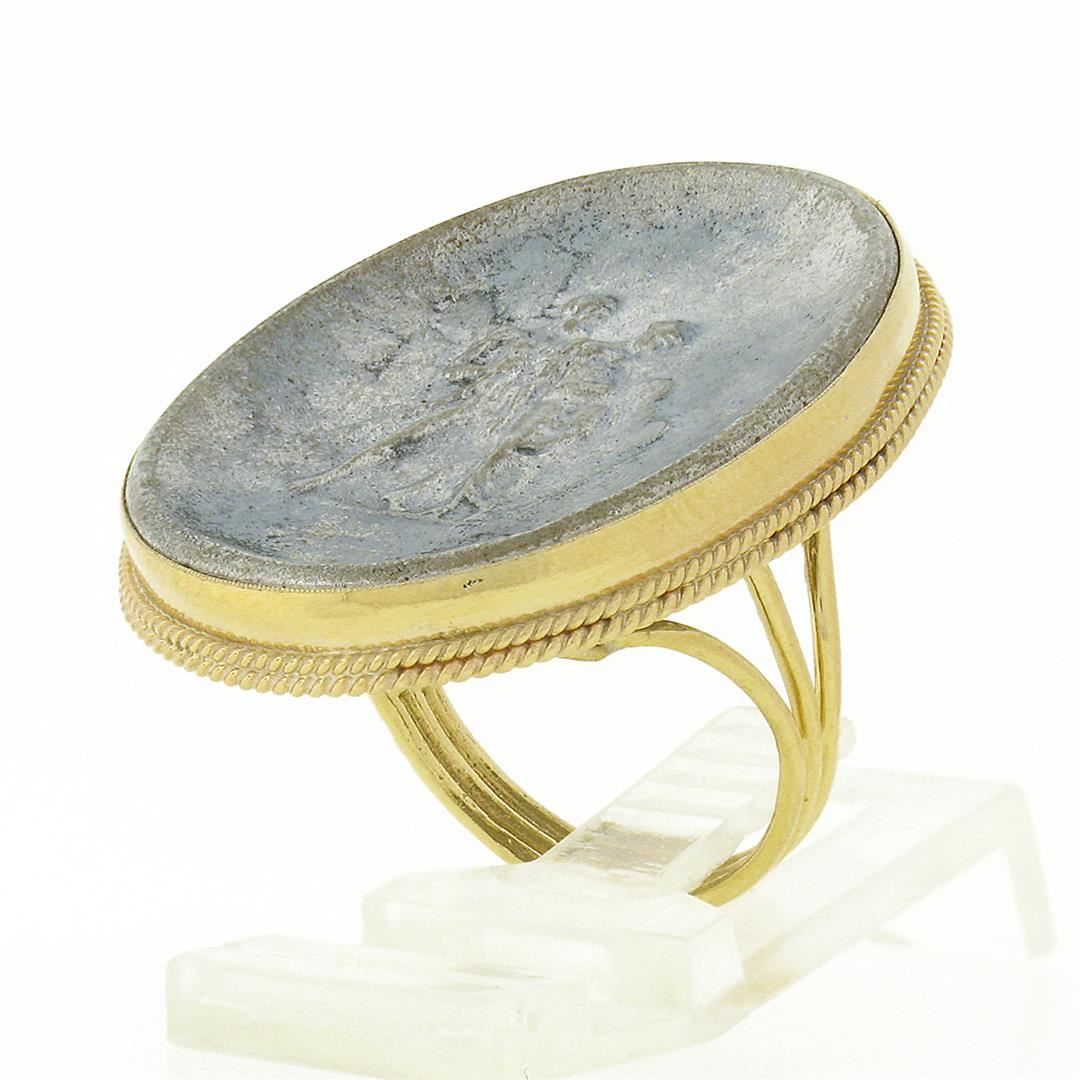 A solid 14k yellow gold cameo metal ring.The ring is size 7.5, weighs a total of 13.48 grams, and measures 35.70mm wide.