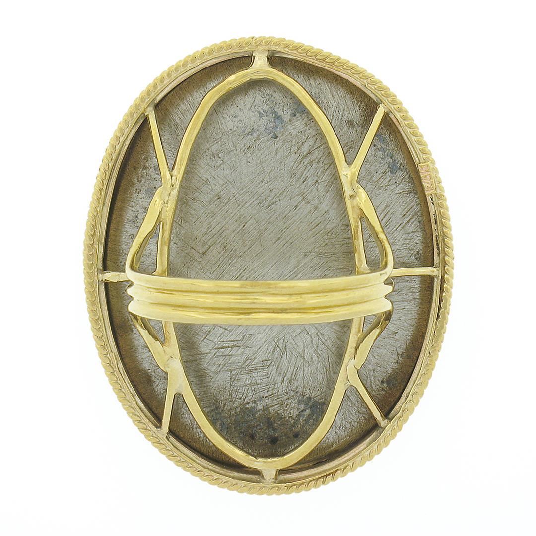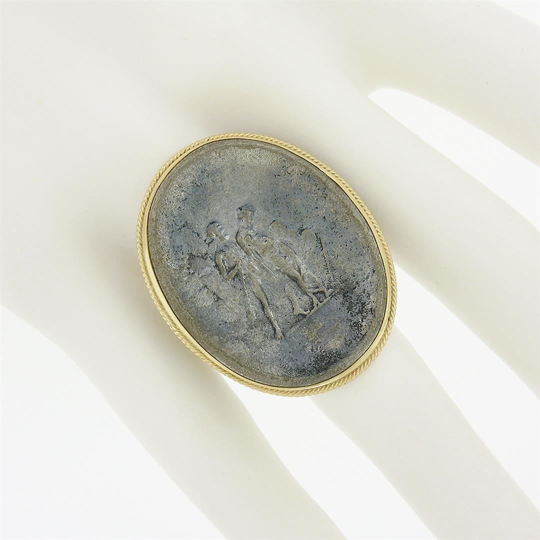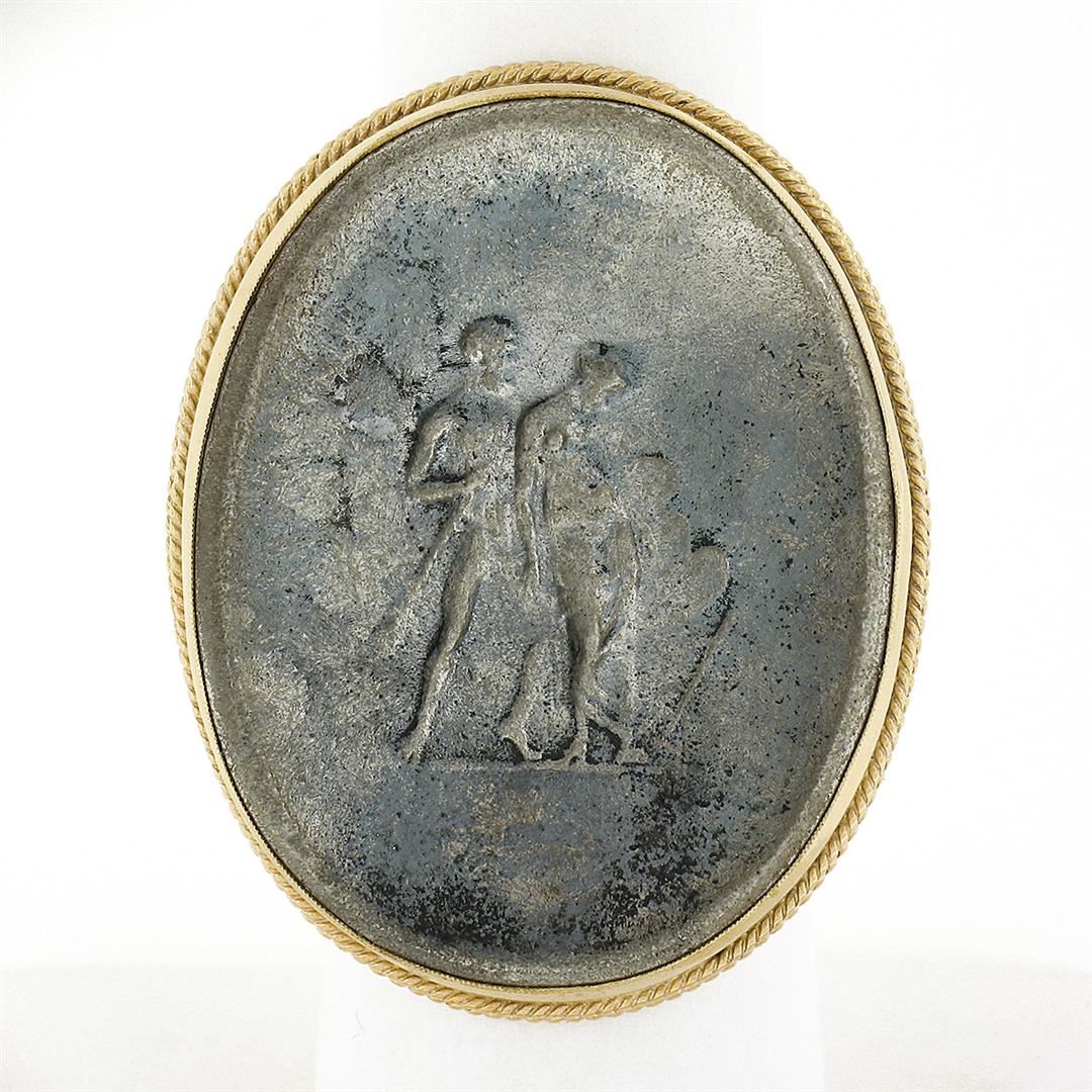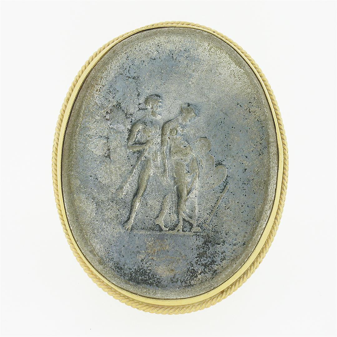 A solid 14k yellow gold cameo metal ring.The ring is size 7.5, weighs a total of 13.48 grams, and measures 35.70mm wide.