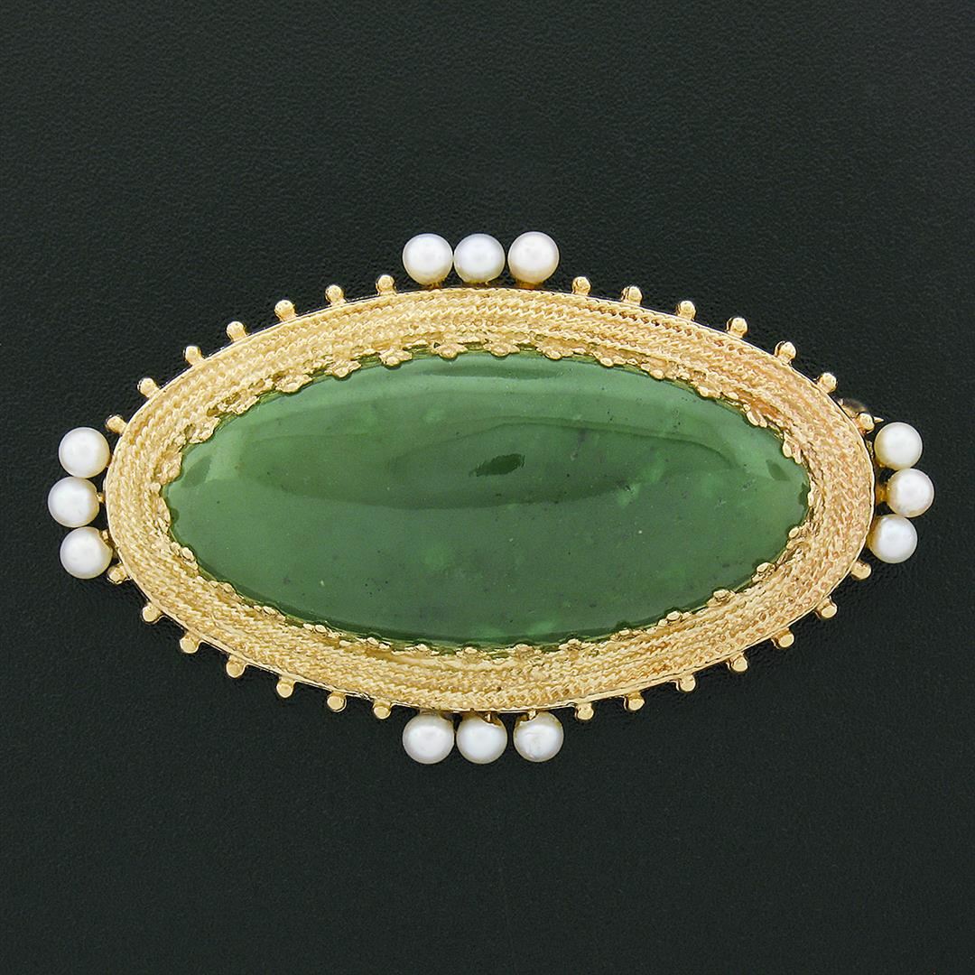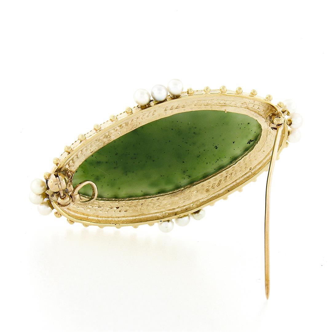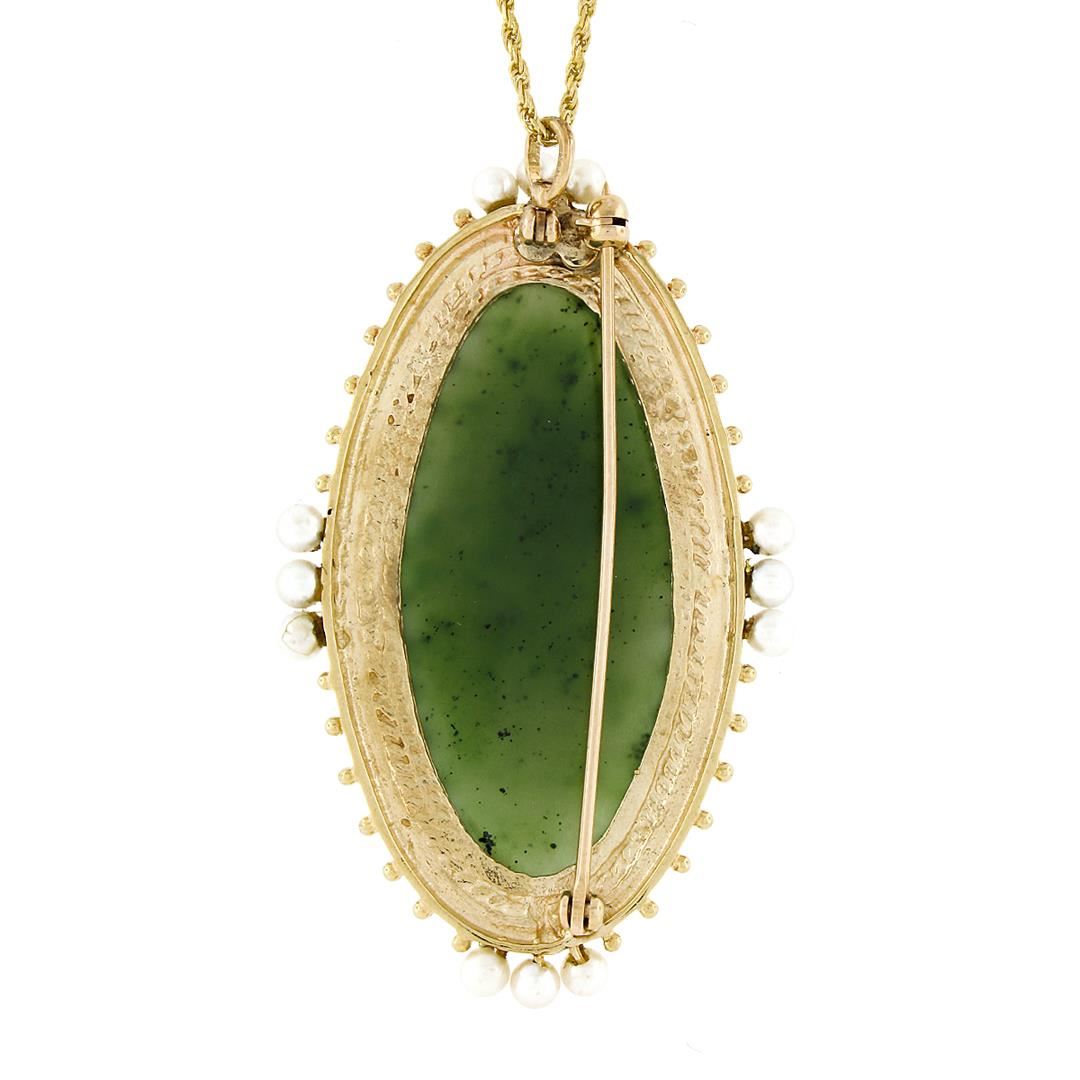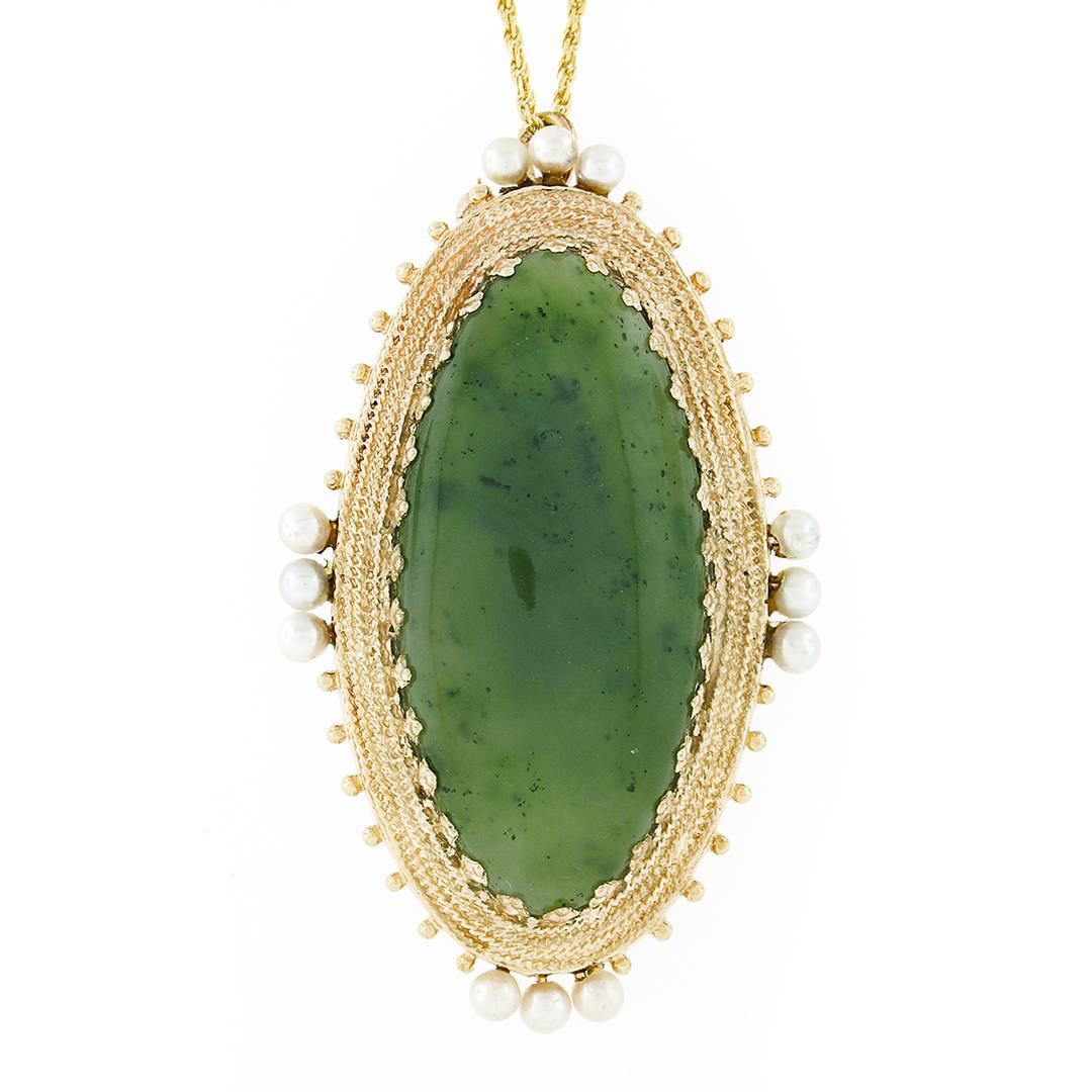 A vintage solid 14k yellow gold pin brooch pendant necklace, with 1 oval cabochon cut natural jade (39.5x18.9mm), and 12 round shape cultured pearls (3.1mm each). 20 inch rope link chain, 19.17 grams total weight, pendant measures 55.50x32.60mm.